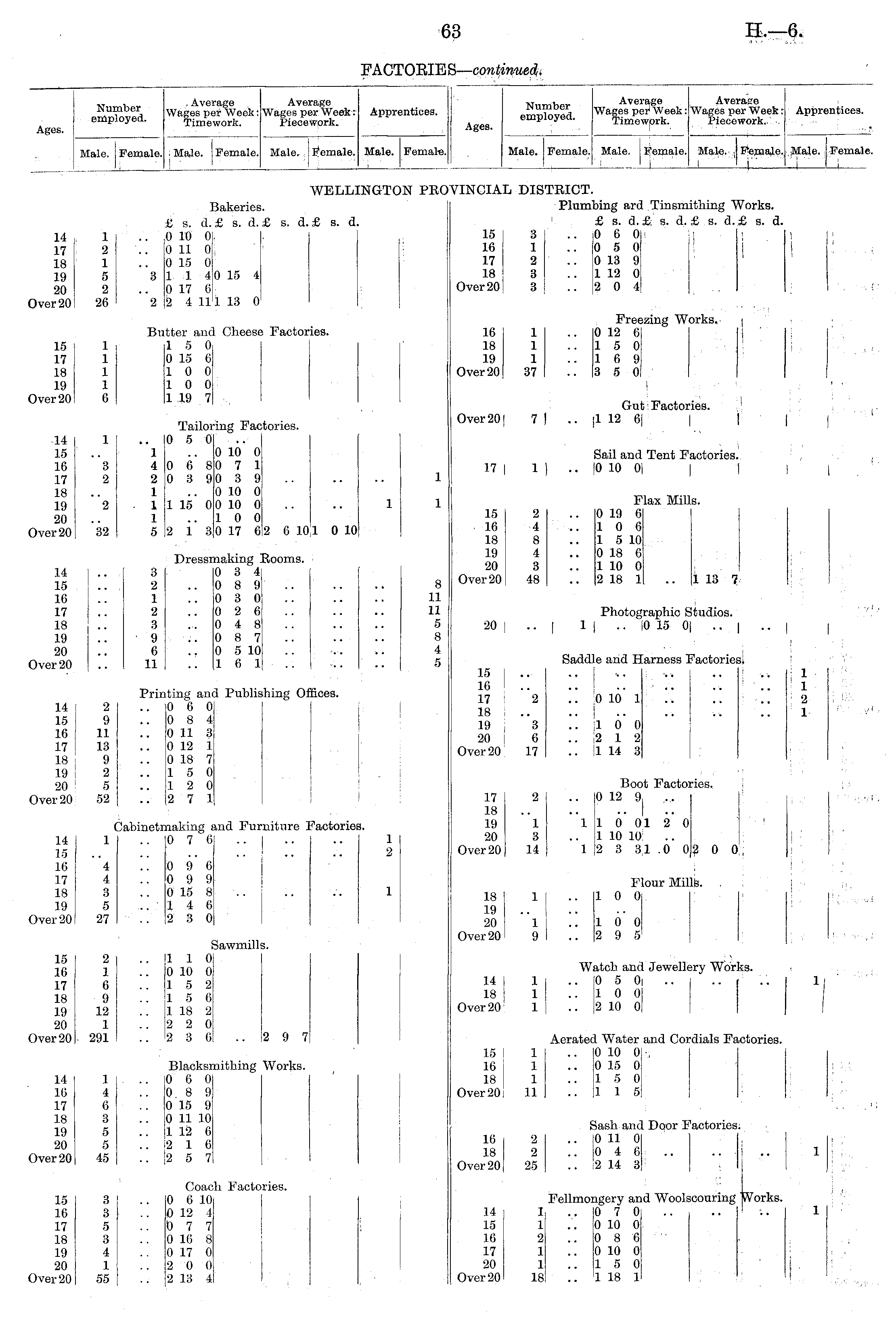 Number employed. . Average Wages per Week: Timework. Average Wages per Week: Piecework. Apprentices. Ages. Number employed. Average Wages per Week: Timework. Average Wages per Week: Piecework. Apprentices. Ages. Male. Female. I Male. Female. Male. Female. Male. Female. Male. Female. Male. Female. Male, j Female. I " I I Male, j Female. 14 17 18 19 20 Over 20 1 2 1 5 2 26 1 2 1 5 2 26 3 2 £ s. d. 0 10 01, 0 11 0; 0 15 0; 114 0 17 6 2 4 11 Bakeries £ s. d. I; WELL] 1. £ s. d. £ s. d. :ngton pri iVINCTAL DISTRICT. Plumbing ard Tinsmithing Works. £ s. d. £. s. d. £ s. d. £ s. d. 15 3 .. 0 6 0 16 1 ..050 17 2 .. 0 13 9 18 3 .. 1 12 0 Over20! 3 ..204 I I .; 1 1 0 15 4 -< 1 18 0 15 17 18 19 Over 20 1 1 1 1 6 1 1 1 1 6 Bu itter and 1 5 0, 0 15 6 10 0 10 0 1 19 7 1 Cheese Facto: •ies. Freezing Works. | 16 1 .. 0 12 6 18 1 -.150 19 1 ..169 Over20 37 ..350 >rks. I , I •!, 1 "1 Tailor 0 5 0 •ing Fac Gut Factories. Over20| 7 1 .. |1 12 6| | | |' .r 1 14 15 16 17 18 19 20 Over 20 1 3 2 "2 '32 3 2 1 4 2 1 1 4 2 1 1 1 5 0 6 8 0 3 9 0 10 0 0 7 1 0 3 9 0 10 0 0 10 0 10 0 0 17 6 itories. 1 Sail and Tent Factories. 17 1 1 1 .. 1010 01 1 Flax Mills. I 1 "2 1 1 -1 1 15 0 1 1 32 1 5 2 i' 3 Dressn naking ] 0 8 4! 0 8 9 0 3 0 0 2 6 0 4 8 0 8 7 0 5 10 16 1 2 6 10 Rooms. I 1 0 10 15 2 .. 0 19 6 16 4 ..106 18 8 .. 1 5 10 19 4 .. 0 18 6 20 3 .. 1 10 0 Over20 48 .. 2 18 1 .. 1 13 7 14 15 16 17 18 19 20 Over 20 ! •• 3 2 1 2 3 9 6 11 3 2 1 2 f> i 8 11 11 5 8 4 5 Photographic Studios. 20 I .. I 1 I .. 10 15 0[ .. 1 I 1 ■ 71 71 3 9 14 I 15 16 17 18 19 20 Over 20 2 9 11 13 9 2 5 52 2 9 11 13 9 2 5 52 Prin Prin ating ant 0 6 0 0 8 4 0 11 3 0 12 1 0 18 7 15 0 12 0 2 7 1 a Publis shing Of ices. Saddle and Harness Factoriesi 15 .. .. ,. ,. .. I ., 16 17 2 .. 0 10 1 18 19 3 ..100 20 6 ..212 Over 20 17 .. 1 14 8 it 1 1 2 1 1 1 2 1 y' y' Ca 1 ibinetr making 2 0 7 6 'actorie! I. Boot Factories. 17 2 ..10 12 9 18 19 1 1100120 20 3 .. 1 10 10: Over20 14 12 3 31.00200 ■ ! I i 14 15 16 17 18 19 Over 20 C 1 4 4 3 5 27 md Fu: liture 1 1 2 2 0 0 ! 4 4 3 5 27 4 4 3 5 27 0 9 6 0 9 9 0 15 8 14 6 2 3 0 Flour Mills. 18 1 I .. 1 0 0 19 20 1 ..100 Over20 9 .. 2 9 5 1 1(3. I I 1 I u I ; ■ i.: u I 15 16 17 18 19 20 Over 20 2 1 6 9 12 1 . 291 2 1 6 9 12 1 291 2 1 6 9 12 1 291 I i II 1 0j 0 10 0 15 2 15 6 1 18 2 2 2 0 2 3 6 iawmilli Watch and Jewellery Works. 14 1 I .. 0 5 0| .. 18 1 ! ..100 Over20 1 \ .. 2 10 0 iry Wor] ;s. ] 1 1 14 16 17 18 19 20 Over 20 1 4 6 3 5 5 45 1 4 6 3 5 5 45 1 4 6 3 5 5 45 ■ • 1 Blacksn 0 6 0 0 8 9 0 15 9 0 11 10 1 12 6 12 -1 6 |2 5 7 lithing 2 9 7 Works. Aerated Water and Cordials Factories. 15 1 .. 0 10 0', 16 1 .. 0 15 0 18 1 ..150 Over20 11 ..115 •dials Factories. " Sash and Door Factories: 16 2 .. 0 11 0 18 2 ..046 .. .. i .. Over 20 25 .. '2 14 8 2 2 25 I Door I 'actories: [; ] 1 I 1 j I .. ■ • 1 15 16 17 18 19 20 Over 20 3 3 5 3 4 1 55 3 3 5 3 4 1 55 3 3 5 3 4 1 55 Coac 0 6 10 0 12 4 0 7 7 0 16 8 0 17 0 2 0 0 2 13 4 ;li Factories. Fellmongery and Woolscouring Works. 14 1 ..070 15 1 .. 0 10 0 16 2 .. 0 8 6 17 1 .. 0 10 0 20 1 ..150 Over 20 181 .. 1 18 1 Fellmoi .d Wool: ;couring Works. 1 J 1 1 1 2 1 1 181 .. ■