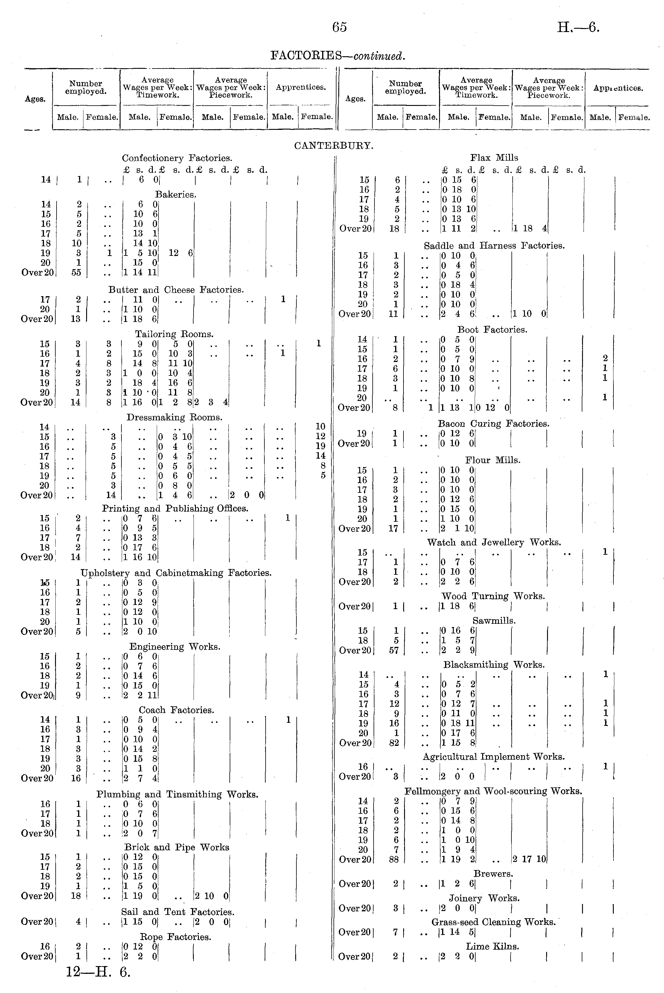 I Number employed. Average Wages per Week: Time work. Average Wages per Week: Piecework. Number employed. Average Wages per Week: Tiniework. Average Wages per Week: Piecework. Ax>prentices. Appi entices. Agea. Ages. Male. Female. Male. Female. I Male. Female. Male. Female. Male. Female. Male. Female. Male. Female. Male. Femali CANTE IBURY. Flax Mills Confectionery I £ s. a. £ s. a. I 6 0| jnery Factories. e s. a.£ s. a. I I £ s. a. 15 16 17 18 19 Over 20 6 2 4 5 2 18 £ a. d. £ s. d. £ s. d. £ 6 .. 0 15 6 2 .. 0 18 0 4 .. 0 10 6 5 .. 0 13 10 2 .. 0 13 6 18 1 11 2 .. 1 18 4 £ s. d s. . d. 14 I 1 I •• 6 2 4 5 2 18 14 2 15 5 16 2 17 5 18 10 19 3 20 1 Over 20 55 Bakeries 6 0 10 6 10 0 13 1 14 10 1 5 10 12 6 15 0 1 14 11 lakeries. " 'I > 12 6 1 Cheese 15 16 17 18 19 20 Over 20 1 3 2 3 2 1 11 1 3 2 3 2 1 11 Saddle and Harness Factories. 1 .. 0 10 0 3 ..0 4 6] 2 .. 0 5 0 ! 3 .. 0 18 4' 2 .. 0 10 0' 1 .. 0 10 0 11 ..246 .. 1 10 0| ies. 3. 17 2 20 1 Over 20 13 Bui .tter and Cheese 11 0 1 10 0 1 18 6 Facto ies. i 15 3 16 1 17 4 18 2 19 3 20 1 Over 20 14 3 2 8 3 2 3 8 Tailoring Ro> 9 0 5 0 15 0 10 3 14 8 11 10 10 0 10 4 18 4 16 6 1 10 • 0 11 8 1 16 01 2 8 >ring Re 5 0 10 3 11 10 10 4 16 6 11 8 12 8 ims. i 14 15 16 17 18 19 20 Over 20 1 1 2 6 3 1 Boot Factories. 1 ..0 5 0; 1 ..050 2 ..079.. 6 .. 0 10 0 3 .. 0 10 8l 1 ... 0 10 0 1 1 2 6 3 1 8 2 1 1 1 2 1 1 1 2 3 '. 8 8 1 1 13 10 12 0 14 15 16 .. 17 18 19 20 Over 20 .. •• I 3 5 5 5 5 3 14 j Dressmaking I oaking I Sooms. Bacon Curing Factories. 1 .. i0 12 6 1 .. |0 10 0 .. 0 3 10 r\ A C 0 3 10 0 4 6 0 4 5 0 5 5 '0 6 0 0 8 0 14 6 • • 10 12 19 14 8 5 19 Over 20 1 1 1 1 'actoriei ..046 n A er 15 2 16 4 17 7 18 2 Over 20 14 Prin ..045 .. 0 5 5 A li A ..060 A O A ..080 I ..146 iting ana Publis 0 7 6 0 9 5 0 13 3 0 17 6 1 16 10 d Publis 1 . > ihing O: |2 0 Sees. 15 16 17 18 19 20 Over 20 1 2 3 2 1 1 17 Flour Mills. 1 .. 0 10 0 2 .. 0 10 0 3 .. 0 10 0 2 .. 0 12 6 1 .. 0 15 0 1 .. 1 10 0 17 .. 2 1 10 Watch and Jewellery Works. 1 ..0 7 6' 1 .. 0 10 O^ 2 .. 2 2 6| Is. 1 15 17 18 Over 20 1 1 2 ;ry Wo: :ks. 1 M j 1 16 1 17 2 18 1 20 1 Over 20 5 'pholstei ry and Cabinetr 10 3 0; i° 5 °i 0 12 9 0 12 0 1 10 0 |2 0 10 labinet: taking 'actorii 1 1 2 1 1 5 Over 201 Wood Turning Works. 1 I .. |1 18 6| I Sawmills. 1 .. 0 16 6 5 ..157 57 ..229 1 Works. l. I I Engineering "V j0 6 0 0 7 6 0 14 6 0 15 0 12 2 11 15 18 Over 20 1 5 57 15 1 16 2 18 2 19 1 Over20| 9 1 a 2 i 9 sering 'orks. 14 15 16 17 18 19 20 Over 20: 4 3 12 9 16 1 82 Blacksmithing Works. Works. 4 ..052 3 ..076 12 .. 0 12 7 9 .. 0 11 0 16 .. 0 18 11 1 .. 0 17 6 82 .. 1 15 8 1 1 1 1 1 •• .. Coach Factc 0 5 0 0 9 4 0 10 0 0 14 2 0 15 8 110 2 7 4 sh Fact iries. ] 1 1 14 1 16 3 17 1 18 3 19 3 20 3 Over 20 16 1 3 1 3 3 3 16 ■• aent We >rks. 16 Over 20 - 3 Agricultural Implement Works, "3 ! .'. 2 0 0 3. 1 Plum] bing and Tinsm 0 6 0 ,0 7 6 '0 10 0 2 0 7 Fellmongery and Wool-scouring We 2 ..079 6 .. 0 15 6 2 .. 0 14 8 2 ..IOO! 6 .. 1 0 10 7 ..194 88 .. |1 19 2 .. 2 17 10 scourine ; Works. brk ke. 16 1 17 1 18 1 Over 20 1 1 1 1 1 ■' Tins: dthing orks. 14 16 17 18 19 20 Over 20 2 6 2 2 6 7 88 IS 1 17 2 18 2 19 1 Over 20 18 1 2 2 1 18 •• Brick and Pipe 0 12 0 0 15 0 0 15 0 15 0 1 19 0 Sail and Tent 1 |1 15 0| .. I Work! Over 201 Brewers. 2 I .. |1 2 6| I ] Joinery Works. 3 I .. |2 0 0| 1 I Grass-seed Cleaning Works. 7 I .. |1 14 5| I I 2 2 17 10 ! I I I I I ! 2 10 0 Over 201 3 Over 201 4 4 factories [2 0 0i IS )| Rope Facto: 0 12 0 2 2 0 ries. Over 20 J 7 16 2 Over 20 1 Over 20 1 Lime Kilns. 2 I .. [2-2 0| I I 2 I I 12--H. i 6.