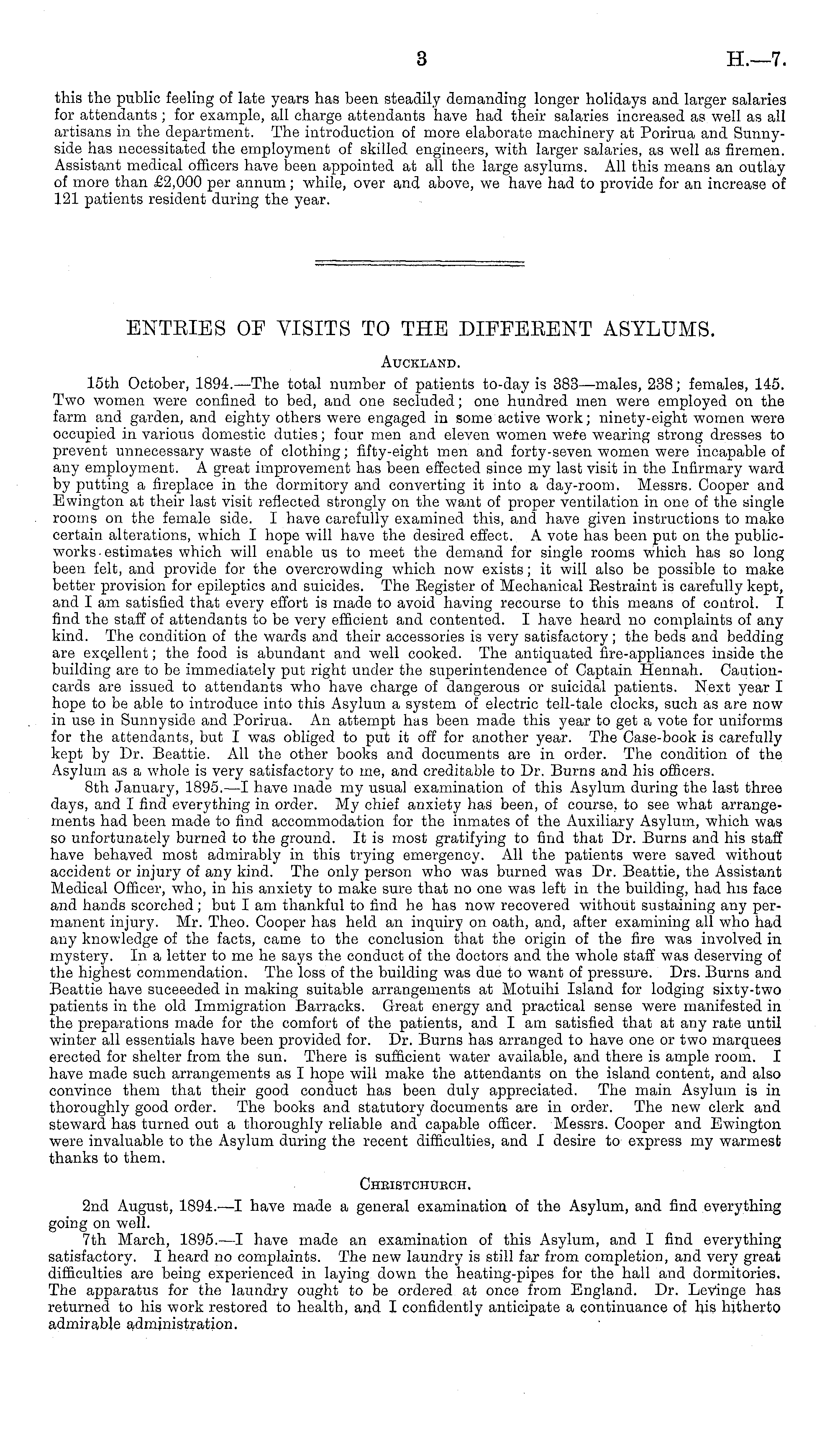 ENTEIES OF VISITS TO THE DIFFEEENT ASYLUMS. Auckland. 15th October, 1894. —The total number of patients to-day is 383 —males, 238; females, 145. Two women were confined to bed, and one secluded; one hundred men were employed on the farm and garden, and eighty others were engaged in some active work; ninety-eight women were occupied in various domestic duties; four men and eleven women were wearing strong dresses to prevent unnecessary waste of clothing; fifty-eight men and forty-seven women were incapable of any employment. A great improvement has been effected since my last visit in the Infirmary ward by putting a fireplace in the dormitory and converting it into a day-room. Messrs. Cooper and Ewington at their last visit reflected strongly on the want of proper ventilation in one of the single rooms on the female side. I have carefully examined this, and have given instructions to make certain alterations, which I hope will have the desired effect. A vote has been put on the public-works-estimates which will enable us to meet the demand for single rooms which has so long been felt, and provide for the overcrowding which now exists; it will also be possible to make better provision for epileptics and suicides. The Eegister of Mechanical Restraint is carefully kept, and lam satisfied that every effort is made to avoid having recourse to this means of control. I find the staff of attendants to be very efficient and contented. I have heard no complaints of any kind. The condition of the wards and their accessories is very satisfactory; the beds and bedding are excellent; the food is abundant and well cooked. The antiquated fire-appliances inside the building are to be immediately put right under the superintendence of Captain Hennah. Cautioncards are issued to attendants who have charge of dangerous or suicidal patients. Next year I hope to be able to introduce into this Asylum a system of electric tell-tale clocks, such as ai*e now in use in Sunnyside and Porirua. An attempt has been made this year to get a vote for uniforms for the attendants, but I was obliged to put it off for another year. The Case-book is carefully kept by Dr. Beattie. All the other books and documents are in order. The condition of the Asylum as a whole is very satisfactory to me, and creditable to Dr. Burns and his officers. Bth January, 1895.—1 have made my usual examination of this Asylum during the last three days, and I find everything in order. My chief anxiety has been, of course, to see what arrangements had been made to find accommodation for the inmates of the Auxiliary Asylum, which was so unfortunately burned to the ground. It is most gratifying to find that Dr. Burns and his staff have behaved most admirably in this trying emergency. All the patients were saved without accident or injury of any kind. The only person who was burned was Dr. Beattie, the Assistant Medical Officer, who, in his anxiety to make sure that no one was left in the building, had his face and hands scorched; but lam thankful to find he has now recovered without sustaining any permanent injury. Mr. Theo. Cooper has held an inquiry on oath, and, after examining all who had any knowledge of the facts, came to the conclusion that the origin of the fire was involved in mystery. In a letter to me he says the conduct of the doctors and the whole staff was deserving of the highest commendation. The loss of the building was due to want of pressure. Drs. Burns and Beattie have succeeded in making suitable arrangements at Motuihi Island for lodging sixty-two patients in the old Immigration BaiTacks. Great energy and practical sense were manifested in the preparations made for the comfort of the patients, and I am satisfied that at any rate until winter all essentials have been provided for. Dr. Burns has arranged to have one or two marquees erected for shelter from the sun. There is sufficient water available, and there is ample room. I have made such arrangements as I hope will make the attendants on the island content, and also convince them that their good conduct has been duly appreciated. The main Asylum is in thoroughly good order. The books and statutory documents are in order. The new clerk and steward has turned out a thoroughly reliable and capable officer. Messrs. Cooper and Ewington were invaluable to the Asylum during the recent difficulties, and I desire to express my warmest thanks to them. Cheistchukch. 2nd August, 1894.—1 have made a general examination of the Asylum, and find everything going on well. 7th March, 1895.—1 have made an examination of this Asylum, and I find everything satisfactory. I heard no complaints. The new laundry is still far from completion, and very great difficulties are being experienced in laying down the heating-pipes for the hall and dormitories. The apparatus for the laundry ought to be ordered at once from England. Dr. Levinge has returned to his work restored to health, and I confidently anticipate a continuance of his hitherto admirable administration.