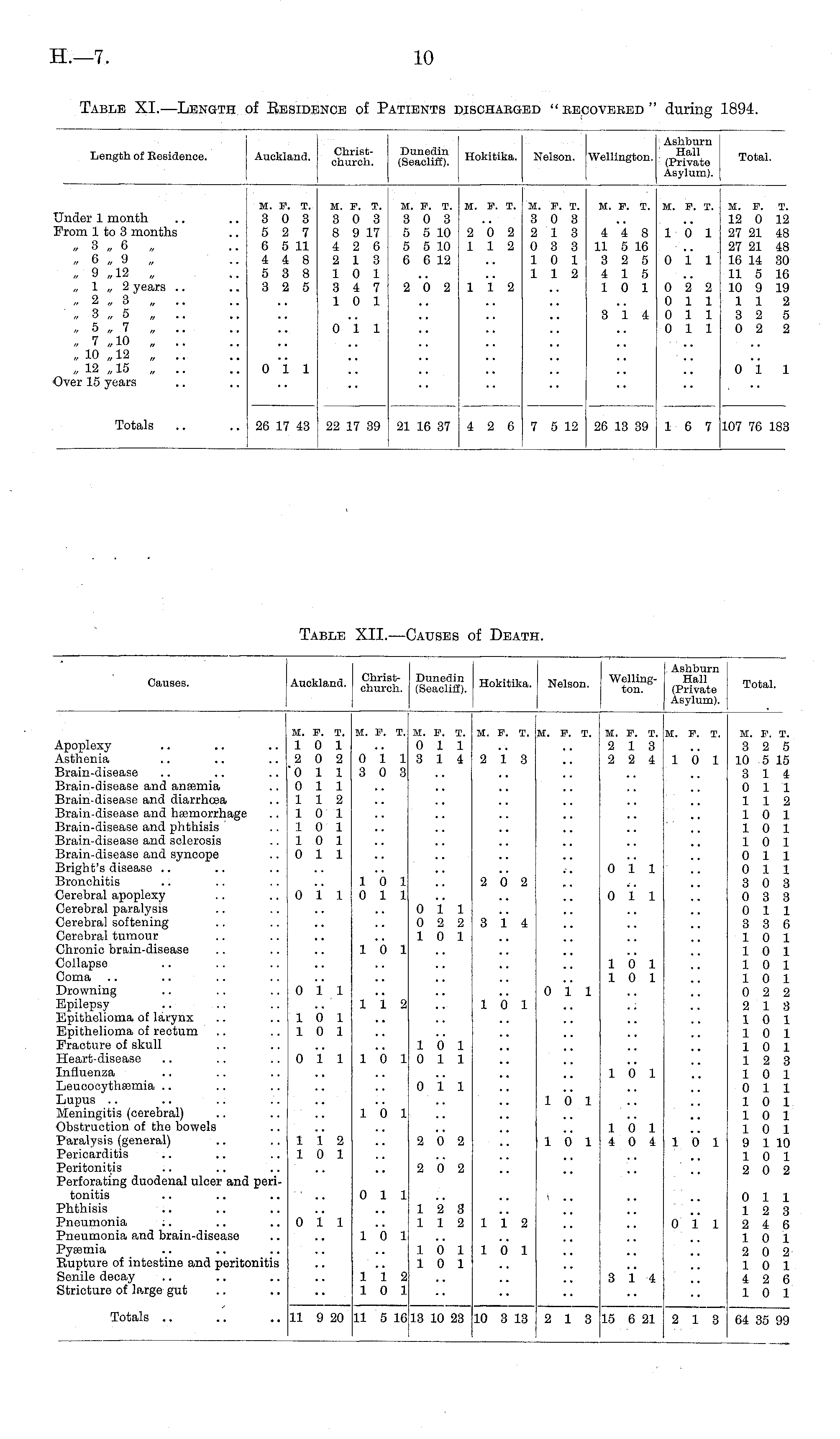 Causes. Auckland. Christchurch. &3& H ° ut «- *<*»"• w e ng - Ashburn Hall (Private Asylum). Total. Apoplexy Asthenia Brain-disease Brain-disease and aneemia Brain-disease and diarrhoea Brain-disease and haemorrhage Brain-disease and phthisis Brain-disease and sclerosis Brain-disease and syncope Bright's disease Bronchitis Cerebral apoplexy Cerebral paralysis Cerebral softening Cerebral tumour Chronic brain-disease Collapse Coma Drowning Epilepsy Epithelioma of larynx Epithelioma of rectum Fracture of skull Heart-disease Influenza Leucocythsemia Lupus Meningitis (cerebral) Obstruction of the bowels Paralysis (general) Pericarditis Peritonitis Perforating duodenal ulcer and peritonitis Phthisis Pneumonia Pneumonia and brain-disease Pyaemia Bupture of intestine and peritonitis Senile decay Stricture of large gut M. F. 1. 10 1 2 0 2 '0 11 Oil 112 10 1 10 1 10 1 Oil M. F. T. oil 3 0 3 II. F. T. Oil 3 14 M. F. T. 2 13 11. F. T. St. F. T. 2 13 2 2 4 M. F. T. 10 1 M. F. T. 3 2 5 10 5 15 3 14 0 11 112 10 1 10 1 10 1 0 11 0 11 3 0 3 0 3 3 0 11 3 3 6 10 1 10 1 10 1 10 1 0 2 2 2 13 10 1 10 1 10 1 12 3 10 1 0 11 10 1 10 1 10 1 9 1 10 10 1 2 0 2 10 1 0 11 2 0 2 0 1 1 0 1 1 Oil 0 2 2 10 1 0 1 1 3 1 4 1 '6 1 1 0 1 10 1 0 1 1 l 'i 2 1 0 1 Oil 1 0 1 10 1 0 1 1 l '6 l 1 0 1 Oil 0 1 1 10 1 10 1 10 1 112 10 1 2 0 2 10 1 1 0 1 4 0 4 1 0 1 2 0 2 0 11 12 3 112 0 11 12 3 2 4 6 10 1 2 0 2 10 1 4 2 6 10 1 Oil 112 0 1 1 10 1 10 1 10 1 1 0 1 112 10 1 3 V 4 Totals .. 2 13 15 6 21 2 13 64 35 99 11 9 20 11 5 16 13 10 23 10 3 13