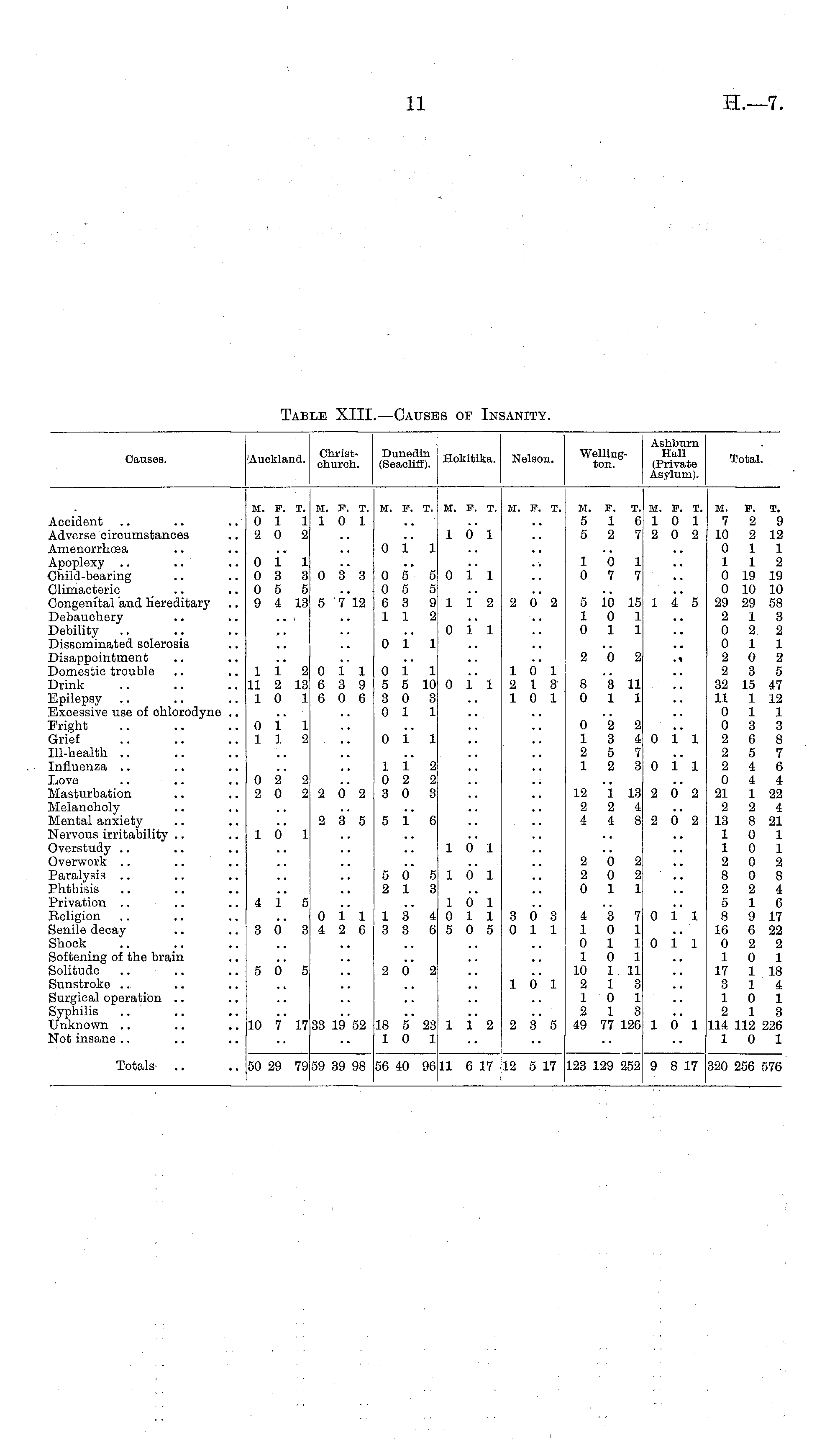Causes. 'AiiHrlnnri Christ- Duneain Auckland. churchf (Soaoliff). Hokitika. Ashburn Nfllson Welling- Hall JNeison. t0Hi (Private Asylum). Total. Accident Adverse circumstances Amenorrhea Apoplexy Child-bearing Climacteric Congenital and Hereditary Debauchery Debility .. Disseminated sclerosis Disappointment Domestic trouble Drink Epilepsy Excessive use of chlorodyne .. Fright .. .. Grief Ill-health .. Influenza Love Masturbation Melancholy Mental anxiety Nervous irritability Overstudy Overwork Paralysis Phthisis Privation Religion Senile decay Shock Softening of the brain Solitude Sunstroke Surgical operation Syphilis Unknown Not insane M. P. T. 0 11 2 0 2 M. F. T. 10 1 M. F. T. M. F. T. M. F. T. M. F. T. 5 16 5 2 7 M. F. T. 10 1 2 0 2 M. F. T. 7 2 9 10 2 12 Oil 112 0 19 19 0 10 10 29 29 58 2 13 0 2 2 Oil 2 0 2 2 3 5 32 15 47 11 1 12 Oil 0 3 3 2 6 8 2 5 7 2 4 6 0 4 4 21 1 22 2 2 4 13 8 21 10 1 10 1 2 0 2 8 0 8 2 2 4 5 16 8 9 17 16 6 22 0 2 2 10 1 17 1 18 3 14 10 1 2 13 114 112 226 10 1 10 1 oil 1 '6 1 0 7 7 0 11 0 3 3 0 5 5 9 4 13 0 33 0 5 5 0 5 5 6 3 9 112 Oil 5 7*12 l i" 2 2 6' 2 5 10 15 10 1 Oil 1 i 5 oil 0 i' 1 2 0 2 112 11 2 13 10 1 Oil 6 3 9 6 0 6 0 11 5 5 10 3 0 3 0 11 10 1 2 13 10 1 . t oil 8 3 11 Oil oil 112 Oil 0 2 2 13 4 2 5 7 12 3 Oil 0 2 2 2 0 2 112 0 2 2 3 0 3 12 1 13 2 2 4 4 4 8 oil 2 0 2 2 6' 2 101 2 3 5 5 16 2 6' 2 101 5 0 5 2 13 10 1 2 0 2 2 0 2 Oil 4 15 oil 4 2 6 13 4 3 3 6 10 1 Oil 5 0 5 3 6' 3 Oil 4 3 7 10 1 Oil 10 1 10 1 11 2 13 10 1 2 13 49 77 126 oil 3 03 o i' i 5 0 5 2 0 2 101 10 7 17 33 19 52 18 5 23 10 1 l i' 2 2 3 5 101 Totals .. 123 129 252 50 29 79 59 39 98 56 40 96 11 6 17 12 5 17 9 8 17 320 256 576