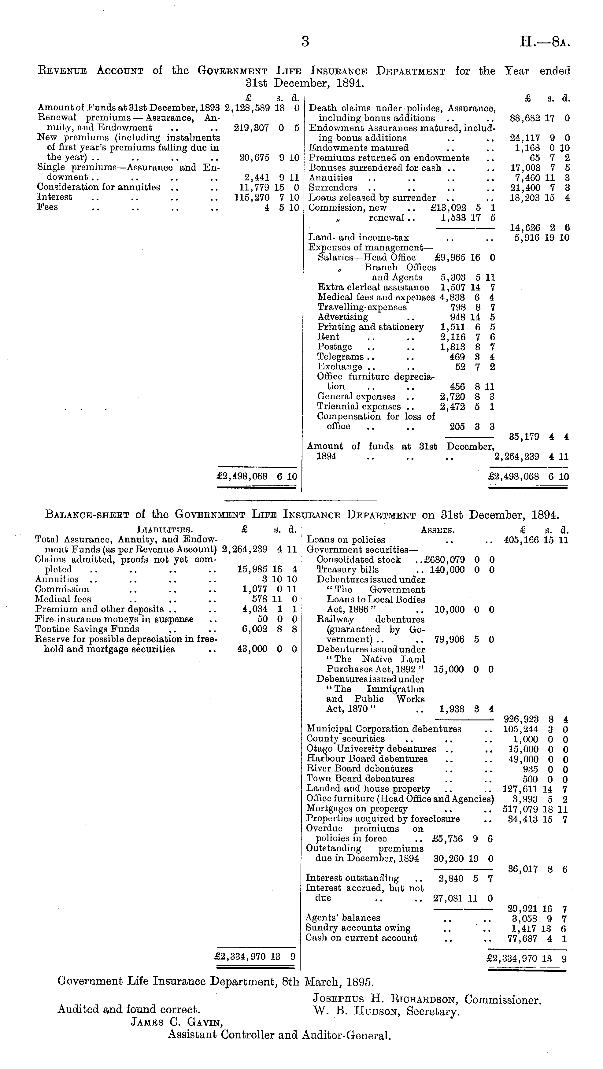 Balance-sheet of the Government Life Insurance Department on 31st December, 1894. Liabilities. £ s. d. Assets. £ s. d. Total Assurance, Annuity, and Endow- Loans on policies .. .. 405,166 15 11 ment Funds (as per Revenue Account) 2,264,239 4 11 Government securities — Claims admitted, proofs not yet com- Consolidated stock ..£680,079 0 0 pleted .. .. .. .. 15,985 16 4 Treasury bills .. 140,000 0 0 Annuities .. .. .. .. 310 10 Debentures issued under Commission .. .. .. 1,077 0 11 "The Government Medical fees .. .. .. 578 11 0 Loans to Local Bodies Premium and other deposits .. .. 4,034 1 1 Act, 1886" .. 10,000 0 0 Fire-insurance moneys in suspense .. 50 0 0 Railway debentures Tontine Savings Funds .. .. 6,002 8 8 (guaranteed by GoReserve for possible depreciation in free- vernment) .. .. 79,906 5 0 hold and mortgage securities .. 43,000 0 0 Debentures issued under "The Native Land Purchases Act, 1892 " 15,000 0 0 Debentures issued under " The Immigration and Public Works Act, 1870" .. 1,938 3 4 926,923 8 4 Municipal Corporation debentures .. 105,244 3 0 County securities .. .. .. 1,000 0 0 Otago University debentures .. .. 15,000 0 0 Harbour Board debentures .. .. 49,000 0 0 River Board debentures .. .. 935 0 0 Town Board debentures .. .. 500 0 0 Landed and house property .. .. 127,611 14 7 Office furniture (Head Office and Agencies) 3,993 5 2 Mortgages on property .. .. 517,079 18 11 Properties acquired by foreclosure .. 34,413 15 7 Overdue premiums on policies in force .. £5,756 9 6 Outstanding premiums due in December, 1894 30,260 19 0 36,017 8 6 Interest outstanding .. 2,840 5 7 Interest accrued, but not due .. .. 27,081 11 0 29,921 16 7 Agents'balances .. .. 3,058 9 7 Sundry accounts owing .. .. 1,417 13 6 Cash on current account .. .. 77,687 4 1 £2,334,970 13 9 £2,334,970 13 9 Government Life Insurance Department, Bth March, 1895. Josephus H. Richardson, Commissioner. Audited and found correct. W. B. Hudson, Secretary. Jambs C. Gavin, Assistant Controller and Auditor-General.