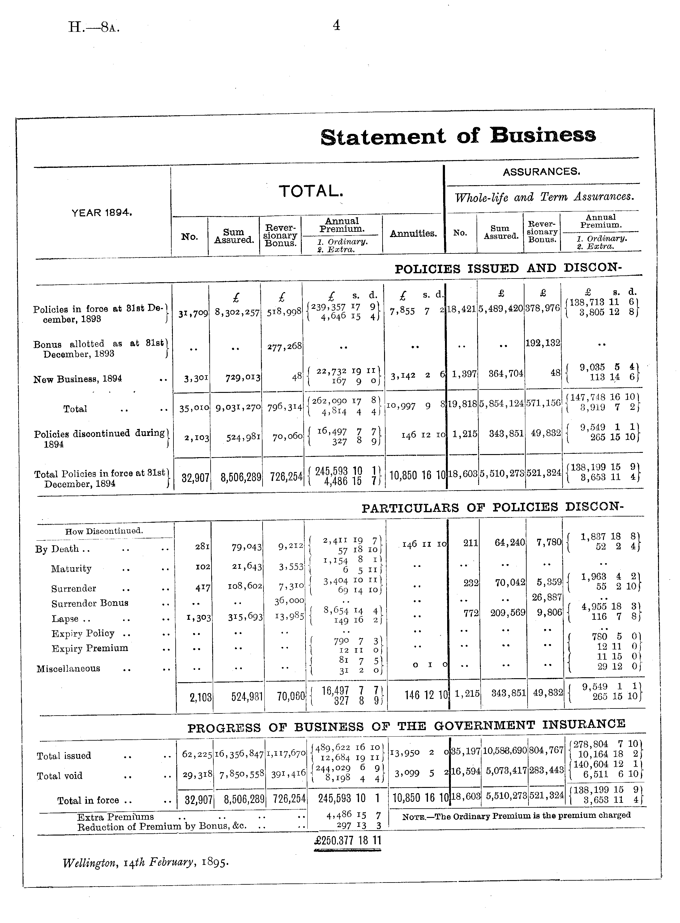 ASSURANCES. TOTAL. ile-life and Term Assurances. YEAR 1894. No. Sum Assured. Reversionary Bonus. Annual Premium. 1. Ordinary. t. Extra. Annual Premium. - Annuities. No. Sum Assured. Reversionary — Bonus. Annual Premium. 1. Ordinary. 2. Extra. poLicr S I SUED AND DISGON- £ £ £ s - d ' (239,357 17 9) \ 4,646 15 4| £ ■■ d. £ £ £ s. d. (138,713 11 61 { 3,805 12 8) Policies in foroe at Slat Dβ-) eember, 1893 f 31.7O9 8,302,257 518,998 7.855 7 2 18,421 5,489,420 378,976 Bonus allotted as at 81st) December, 1893 f 277, 268 • • 192,132 New Business, 1894 3.301 729.013 48 f 22,732 19 ill 1 167 9 of 3,142 2 6 1,397 364,704 48 I 9,035 5 41 { 113 14 6f Total 9,031,270 796,3H (262,090 17 1 4> Sl 4 4 4) 10,997 9 8 19,818 5,854,124 571,156 (147,748 16 101 \ 3,919 7 2f 35,010 Policies discontinued during) 1894 f 2,103 524,981 70, 060 ( 16,497 7 7} 1 327 8 9 f 146 12 10 1,215 343,851 49,832 ( 9,549 1 1) \ 265 15 10f Total Policies in force at 31st) December, 1894 ] 32,907 8,506,289 728,254 f 245,593 10 1) 1 4,436 15 7f 10,850 16 10 18,603 5,510,273 521,324 f138,199 15 91 \ 3,653 11 4j particula: ,S OF POLI ilES DXSCQNHow Discontinued. By Death 281 f 1 J i 2,411 19 7) 57 18 10) 1,154 8 1) 6 5 "I 3,404 10 ill 69 14 10J 146 11 10 211 64,240 7,780 f 1,837 18 81 \ 52 2 4f 79,O43 9,212 Maturity 102 21,643 3,553 Surrender 4*7 108,602 7,3io 232 70,042 5,359 ( 1,963 4 21 { 55 2 10) Surrender Bonus 36,000 26,887 ( 4,955 18 3) \ 116 7 8[ Lapse 1.303 315.693 13,985 I 8,654 14 4I 149 16 2) 772 209,369 9,806 Expiry Policy Expiry Premium f j 79° 7 3] 12 11 O) 81 7 5) 31 2 of f 780 5 01 1 12 11 Of / 11 15 0) { 29 12 Of Miscellaneous 010 524,981 70,080 J 16,497 7 71 { 327 8 9) 146 12 1 1,215 343,851 49,832 ( 9,549 1 11 265 15 10J 2,103 GRESS OF B SINESS O THE G 1VERNMEN 1 IN HJRANCE PR 16,356,847 1,117,670 J48g,622 16 101 ( 12,684 19 11f [244,029 6 9) I 8,198 4 4) 35,19710,586,690 804,767 (278,804 7 10) I 10,164 18 2f (140,604 12 II \ 6,511 6 10) Total issued 62,225 13,950 2 o Total void 29,318 7,850,558 391,416 3,099 5 2 16,594 5,073,417 283,443 Total in force .. 32,907 8,506,289 726,254 245,593 10 1 10,850 16 10 18,603 5,510,273 521,324 (138,199 15 9) I 3,653 11 4f Extra Premiums Eeduction of Premium by Bonus, &c. 4,486 15 7 297 13 3 Note.—The Ordinary Premium is the premium charged £250.377 18 11 Wellington, i\th February, 1895.