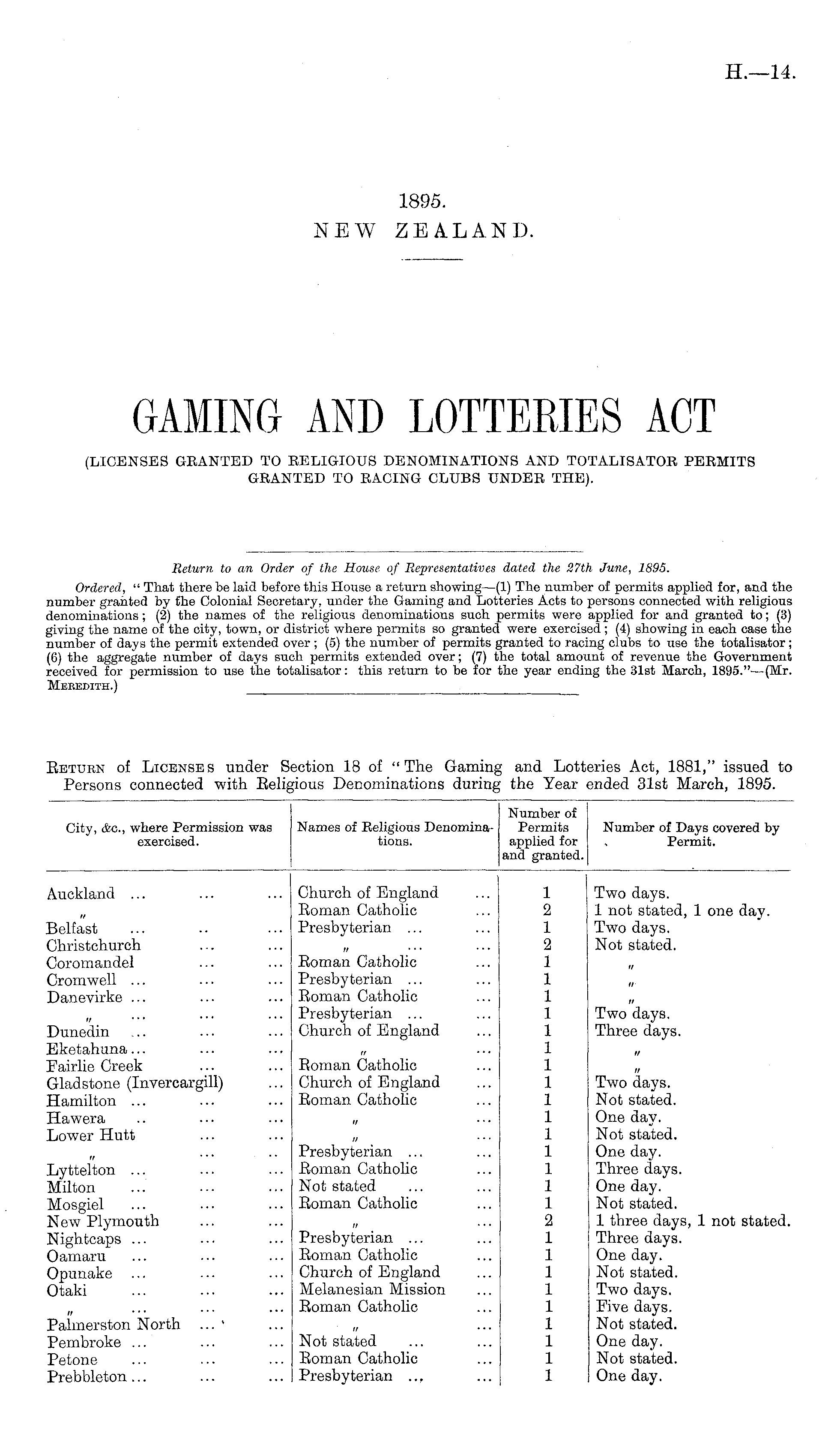 Return to an Order of the House of Representatives dated the 27th June, 1895. Ordered, " That there be laid before this House a return showing—(l) The number of permits applied for, and the number granted by the Colonial Secretary, under the Gaming and Lotteries Acts to persons connected with religious denominations; (2) the names of the religious denominations such permits were applied for and granted to; (3) giving the name of the city, town, or district where permits so granted were exercised ; (4) showing in each case the number of days the permit extended over ; (5) the number of permits granted to racing clubs to use the totalisator; (6) the aggregate number of days such permits extended over; (7) the total amount of revenue the Government received for permission to use the totalisator: this return to be for the year ending the 31st March, 1895." —(Mr. Mekedith.)