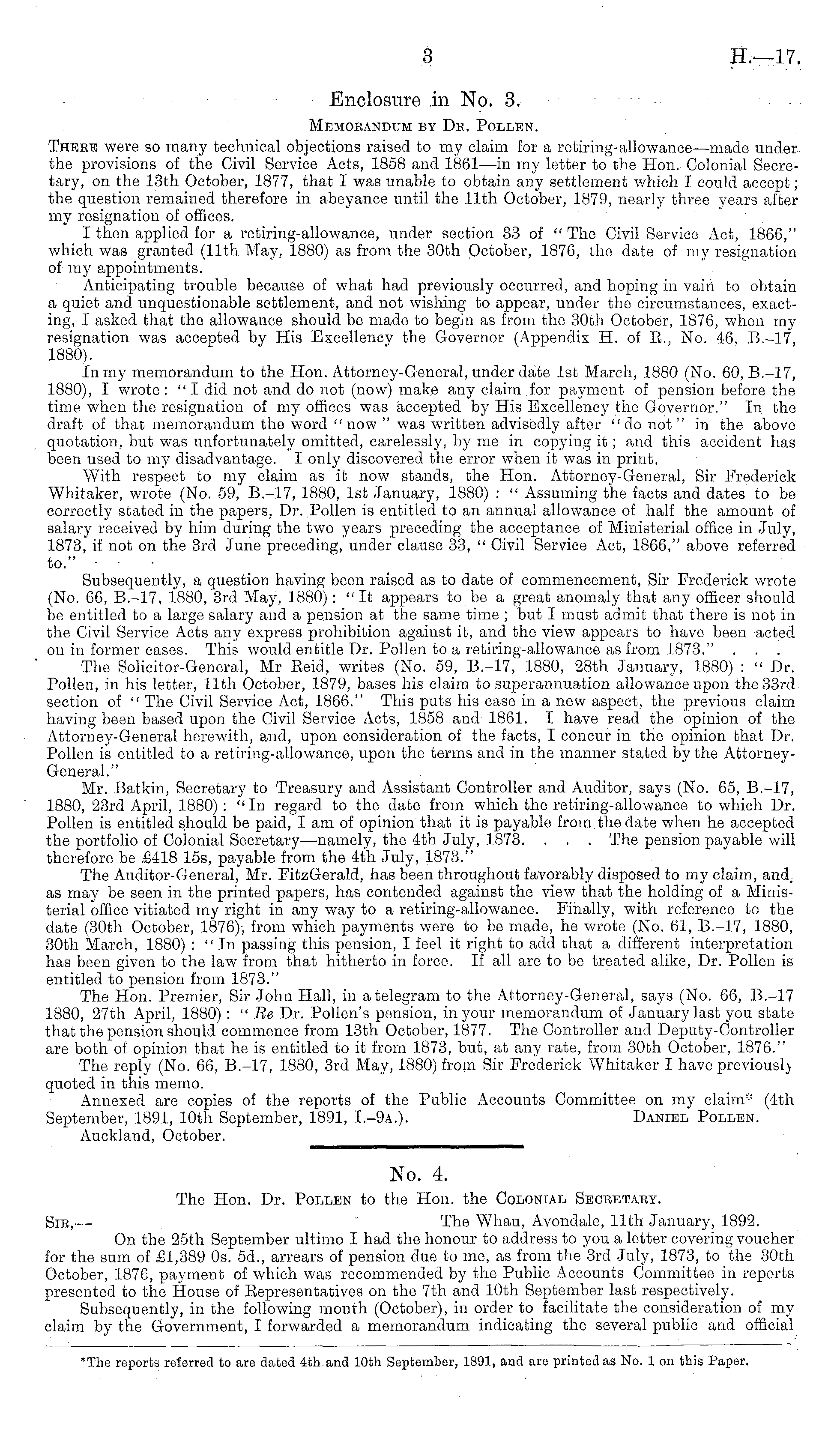 No. 4. The Hon. Dr. Pollen to the Hon. the Colonial Secbetaby. Sir,— The Whau, Avondale, 11th January, 1892. On the 25th September ultimo I had the honour to address to you a letter covering voucher for the sum of £1,389 Os. 5d., arrears of pension due to me, as from the 3rd July, 1873, to the 30th October, 1876, payment of which was recommended by the Public Accounts Committee in reports presented to the House of Eepresentatives on the 7th and 10th September last respectively. Subsequently, in the following month (October), in order to facilitate the consideration of my claim by the Government, I forwarded a memorandum indicating the several public and official "The reports referred to are dated 4th. and 10th September, 1891, and are printed as No. 1 on this Paper.