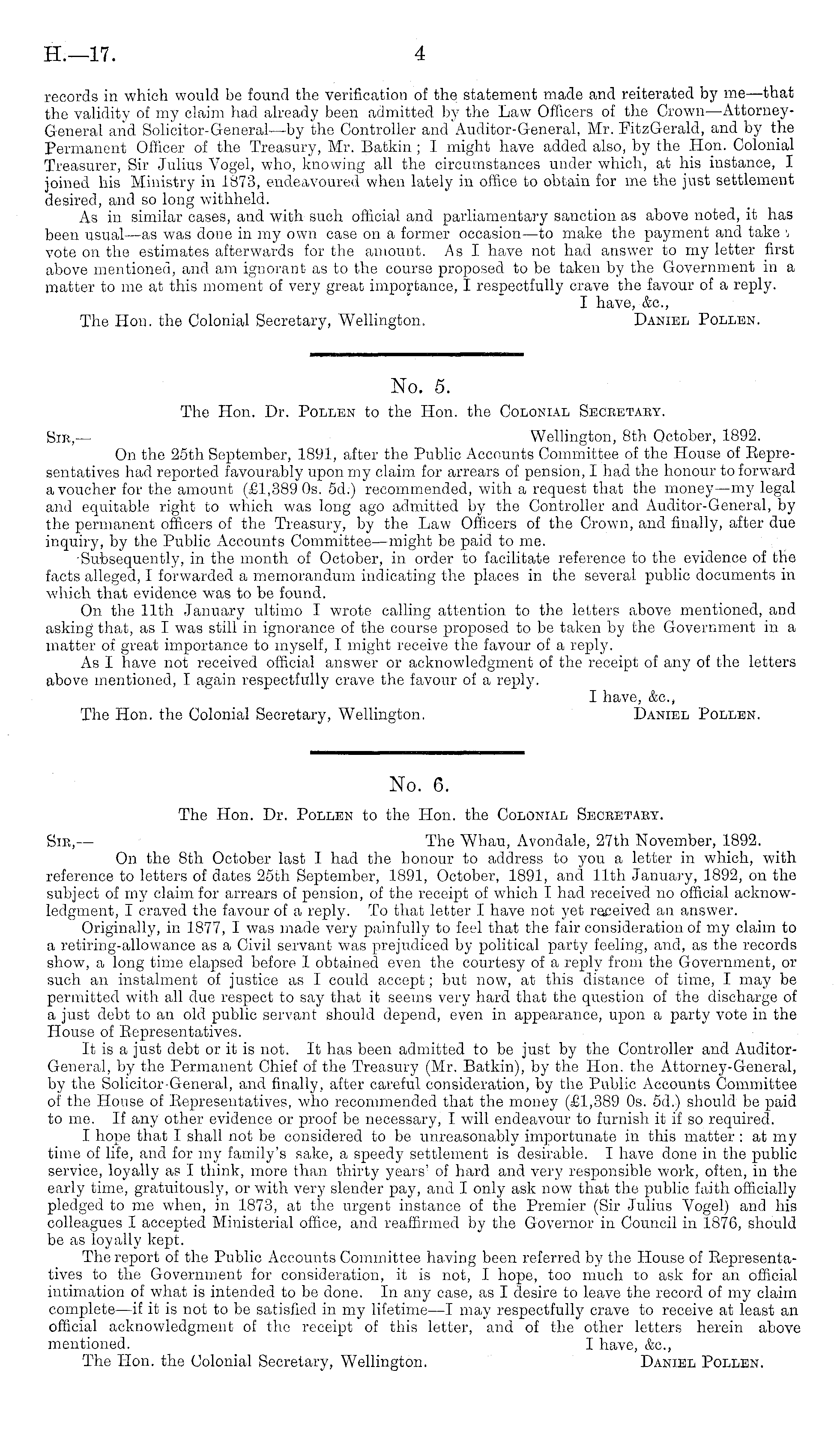 No. 5. The Hon. Dr. Pollen to the Hon. the Colonial Secretary. Sir,— Wellington, Bth October, 1892. On the 25th September, 1891, after the Public Accounts Committee of the House of Eepresentatives had reported favourably upon my claim for arrears of pension, I had the honour to forward a voucher for the amount (£1,389 Os. 5d.) recommended, with a request that the money—my legal and equitable right to which was long ago admitted by the Controller and Auditor-General, by the permanent officers of the Treasury, by the Law Officers of the Crown, and finally, after due inquiry, by the Public Accounts Committee—might be paid to me. •Subsequently, in the month of October, in order to facilitate reference to the evidence of the facts alleged, I forwarded a memorandum indicating the places in the several public documents in which that evidence was to be found. On the 11th January ultimo I wrote calling attention to the letters above mentioned, and asking that, as I was still in ignorance of the course proposed to be taken by the Government in a matter of great importance to myself, I might receive the favour of a reply. As I have not received official answer or acknowledgment of the receipt of any of the letters above mentioned, I again respectfully crave the favour of a reply. I have, &c, The Hon. the Colonial Secretary, Wellington. Daniel Pollen.