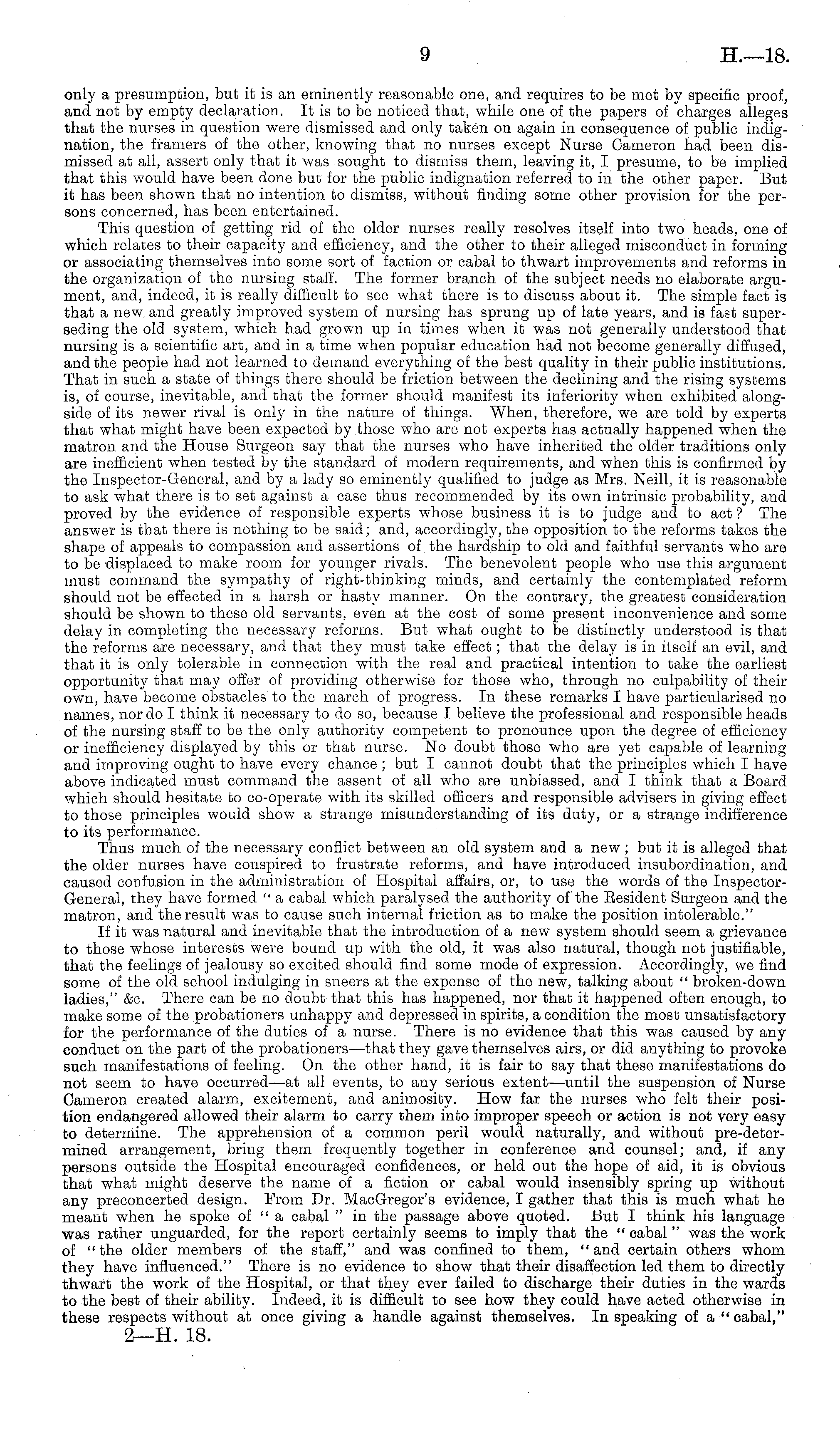 only a presumption, but it is an eminently reasonable one, and requires to be met by specific proof, and not by empty declaration. It is to be noticed that, while one of the papers of charges alleges that the nurses in question were dismissed and only taken on again in consequence of public indignation, the framers of the other, knowing that no nurses except Nurse Cameron had been dismissed at all, assert only that it was sought to dismiss them, leaving it, I presume, to be implied that this would have been done but for the public indignation referred to in the other paper. But it has been shown that no intention to dismiss, without finding some other provision for the persons concerned, has been entertained. This question of getting rid of the older nurses really resolves itself into two heads, one of which relates to their capacity and efficiency, and the other to their alleged misconduct in forming or associating themselves into some sort of faction or cabal to thwart improvements and reforms in the organization of the nursing staff. The former branch of the subject needs no elaborate argument, and, indeed, it is really difficult to see what there is to discuss about it. The simple fact is that a new and greatly improved system of nursing has sprung up of late years, and is fast superseding the old system, which had grown up in times when it was not generally understood that nursing is a scientific art, and in a time when popular education had not become generally diffused, and the people had not learned to demand everything of the best quality in their public institutions. That in such a state of things there should be friction between the declining and the rising systems is, of course, inevitable, and that the former should manifest its inferiority when exhibited alongside of its newer rival is only in the nature of things. When, therefore, we are told by experts that what might have been expected by those who are not experts has actually happened when the matron and the House Surgeon say that the nurses who have inherited the older traditions only are inefficient when tested by the standard of modern requirements, and when this is confirmed by the Inspector-General, and by a lady so eminently qualified to judge as Mrs. Neill, it is reasonable to ask what there is to set against a case thus recommended by its own intrinsic probability, and proved by the evidence of responsible experts whose business it is to judge and to act ? The answer is that there is nothing to be said; and, accordingly, the opposition to the reforms takes the shape of appeals to compassion and assertions of the hardship to old and faithful servants who are to be displaced to make room for younger rivals. The benevolent people who use this argument must command the sympathy of right-thinking minds, and certainly the contemplated reform should not be effected in a harsh or hasty manner. On the contrary, the greatest consideration should be shown to these old servants, even at the cost of some present inconvenience and some delay in completing the necessary reforms. But what ought to be distinctly understood is that the reforms are necessary, and that they must take effect; that the delay is in itself an evil, and that it is only tolerable in connection with the real and practical intention to take the earliest opportunity that may offer of providing otherwise for those who, through no culpability of their own, have become obstacles to the march of progress. In these remarks I have particularised no names, nor do I think it necessary to do so, because I believe the professional and responsible heads of the nursing staff to be the only authority competent to pronounce upon the degree of efficiency or inefficiency displayed by this or that nurse. No doubt those who are yet capable of learning and improving ought to have every chance ; but I cannot doubt that the principles which I have above indicated must command the assent of all who are unbiassed, and I think that a Board which should hesitate to co-operate with its skilled officers and responsible advisers in giving effect to those principles would show a strange misunderstanding of its duty, or a strange indifference to its performance. Thus much of the necessary conflict between an old system and a new ; but it is alleged that the older nurses have conspired to frustrate reforms, and have introduced insubordination, and caused confusion in the administration of Hospital affairs, or, to use the words of the InspectorGeneral, they have formed " a cabal which paralysed the authority of the Eesident Surgeon and the matron, and the result was to cause such internal friction as to make the position intolerable." If it was natural and inevitable that the introduction of a new system should seem a grievance to those whose interests were bound up with the old, it was also natural, though not justifiable, that the feelings of jealousy so excited should find some mode of expression. Accordingly, we find some of the old. school indulging in sneers at the expense of the new, talking about " broken-down ladies," &c. There can be no doubt that this has happened, nor that it happened often enough, to make some of the probationers unhappy and depressed in spirits, a condition the most unsatisfactory for the performance of the duties of a nurse. There is no evidence that this was caused by any conduct on the part of the probationers—that they gave themselves airs, or did anything to provoke such manifestations of feeling. On the other hand, it is fair to say that these manifestations do not seem to have occurred —at all events, to any serious extent —until the suspension of Nurse Cameron created alarm, excitement, and animosity. How far the nurses who felt their position endangered allowed their alarm to carry them into improper speech or action is not very easy to determine. The apprehension of a common peril would naturally, and without pre-deter-mined arrangement, brin