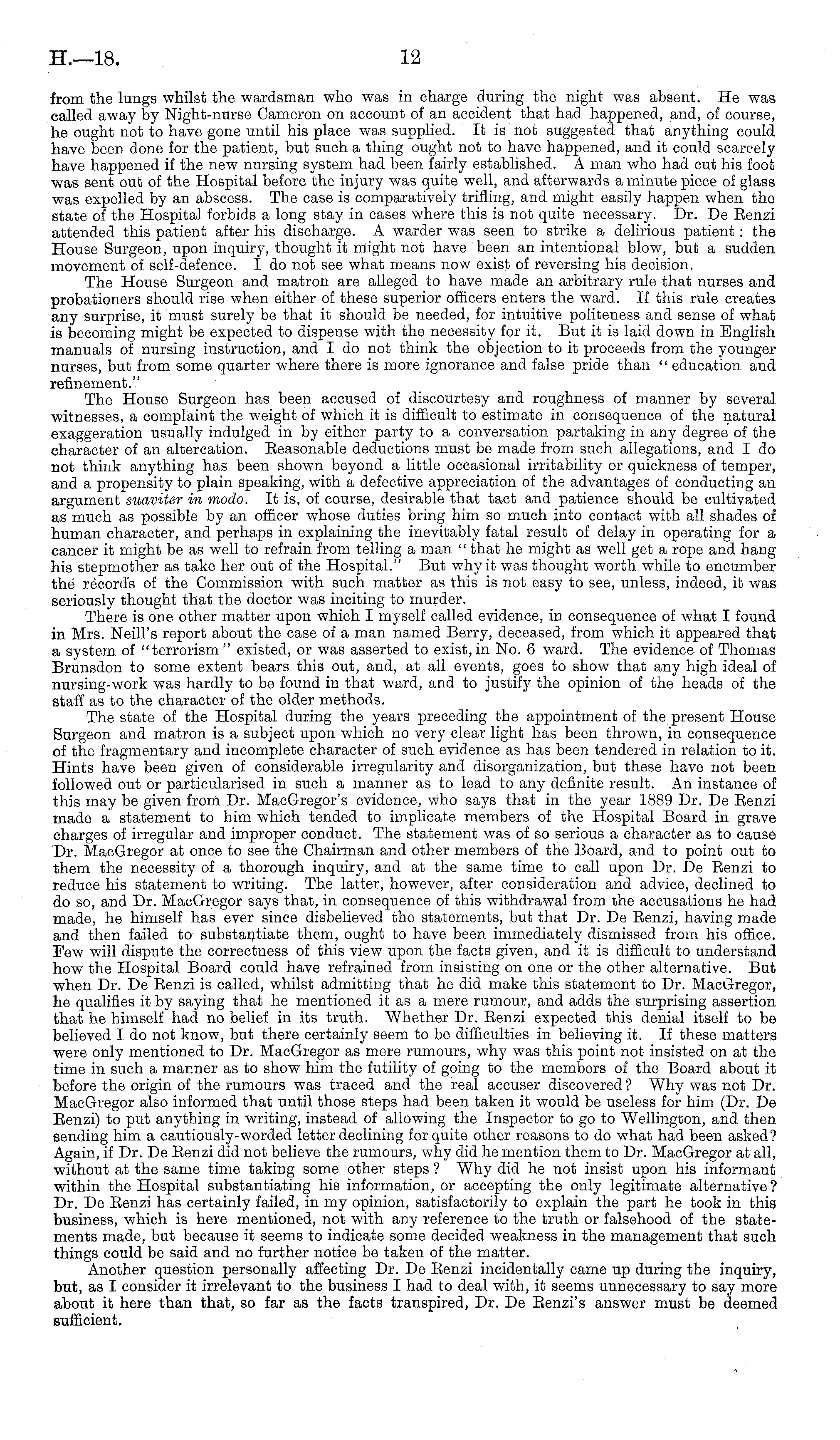 from the lungs whilst the wardsman who was in charge during the night was absent. He was called away by Night-nurse Cameron on account of an accident that had happened, and, of course, he ought not to have gone until his place was supplied. It is not suggested that anything could have been done for the patient, but such a thing ought not to have happened, and it could scarcely have happened if the new nursing system had been fairly established. A man who had cut his foot was sent out of the Hospital before the injury was quite well, and afterwards a minute piece of glass was expelled by an abscess. The case is comparatively trifling, and might easily happen when the state of the Hospital forbids a long stay in cases where this is not quite necessary. Dr. De Eenzi attended this patient after his discharge. A warder was seen to strike a delirious patient : the House Surgeon, upon inquiry, thought it might not have been an intentional blow, but a sudden movement of self-defence. I do not see what means now exist of reversing his decision. The House Surgeon and matron are alleged to have made an arbitrary rule that nurses and probationers should rise when either of these superior officers enters the ward. If this rule creates any surprise, it must surely be that it should be needed, for intuitive politeness and sense of what is becoming might be expected to dispense with the necessity for it. But it is laid down in English manuals of nursing instruction, and I do not think the objection to it proceeds from the younger nurses, but from some quarter where there is more ignorance and false pride than " education and refinement." The House Surgeon has been accused of discourtesy and roughness of manner by several witnesses, a complaint the weight of which it is difficult to estimate in consequence of the natural exaggeration usually indulged in by either party to a conversation partaking in any degree of the character of an altercation. Seasonable deductions must be made from such allegations, and Ido not think anything has been shown beyond a little occasional irritability or quickness of temper, and a propensity to plain speaking, with a defective appreciation of the advantages of conducting an argument suaviter in moclo. It is, of course, desirable that tact and patience should be cultivated as much as possible by an officer whose duties bring him so much into contact with all shades of human character, and perhaps in explaining the inevitably fatal result of delay in operating for a cancer it might be as well to refrain from telling a man " that he might as well get a rope and hang his stepmother as take her out of the Hospital." But why it was thought worth while to encumber the record's of the Commission with such matter as this is not easy to see, unless, indeed, it was seriously thought that the doctor was inciting to murder. There is one other matter upon which I myself called evidence, in consequence of what I found in Mrs. Neill's report about the case of a man named Berry, deceased, from which it appeared that a system of "terrorism" existed, or was asserted to exist, in No. 6 ward. The evidence of Thomas Brunsdon to some extent bears this out, and, at all events, goes to show that any high ideal of nursing-work was hardly to be found in that ward, and to justify the opinion of the heads of the staff as to the character of the older methods. The state of the Hospital during the years preceding the appointment of the present House Surgeon and matron is a subject upon which no very clear light has been thrown, in consequence of the fragmentary and incomplete character of such evidence as has been tendered in relation to it. Hints have been given of considerable irregularity and disorganization, but these have not been followed out or particularised in such a manner as to lead to any definite result. An instance of this may be given from Dr. MacGregor's evidence, who says that in the year 1889 Dr. De Eenzi made a statement to him which tended to implicate members of the Hospital Board in grave charges of irregular and improper conduct. The statement was of so serious a character as to cause Dr. MacGregor at once to see the Chairman and other members of the Board, and to point out to them the necessity of a thorough inquiry, and at the same time to call upon Dr. De Eenzi to reduce his statement to writing. The latter, however, after consideration and advice, declined to do so, and Dr. MacGregor says that, in consequence of this withdrawal from the accusations he had made, he himself has ever since disbelieved the statements, but that Dr. De Eenzi, having made and then failed to substantiate them, ought to have been immediately dismissed from his office. Few will dispute the correctness of this view upon the facts given, and it is difficult to understand how the Hospital Board could have refrained from insisting on one or the other alternative. But when Dr. De Eenzi is called, whilst admitting that he did make this statement to Dr. MacGregor, he qualifies it by saying that he mentioned it as a mere rumour, and adds the surprising assertion that he himself had no belief in its truth. Whether Dr. Eenzi expected this denial itself to be believed Ido not know, but there certainly seem to be difficulties in believing it. If these matters were only mentioned to Dr. MacGregor as mere rumours, why was this point not insisted on at the time in such a manner as to show him the futility of going to the members of the Board about it before the origin of the rumours was traced and the real accuser discovered ? Why was not Dr. MacGregor also informed that until those steps had been taken it would be useless for him (Dr. De Eenzi) to put anything in writing, instead of allowing the Inspector to go to Wellington, and then sending him a cautiously-worded letter declining for quite other reasons to do what had been asked? Again, if Dr. De Eenzi did not believe the rumours, why did he mention them to Dr. Ma