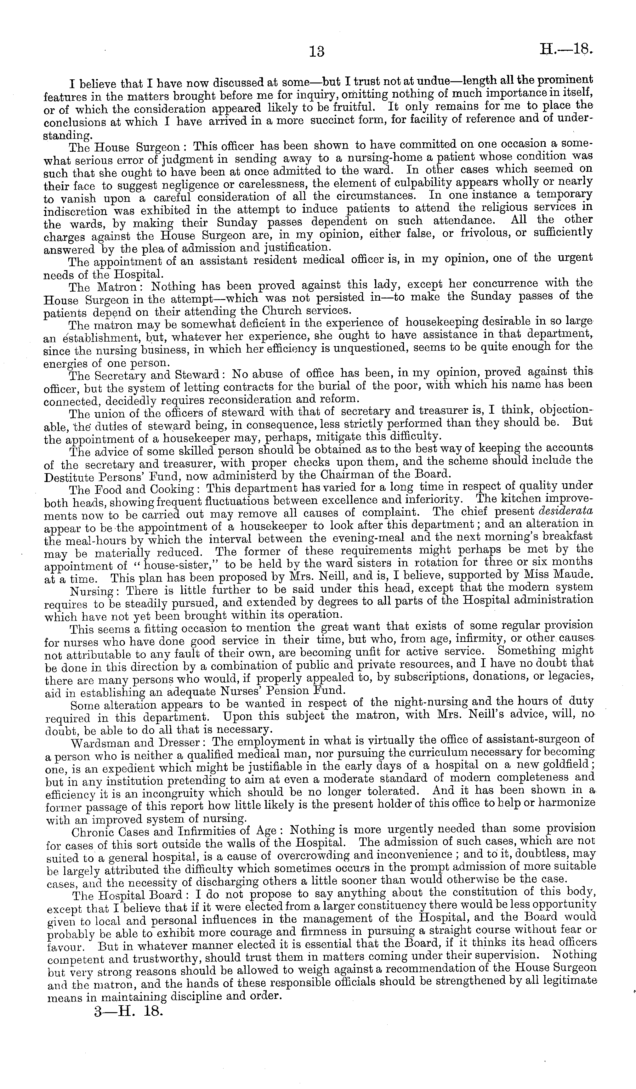 I believe that I have now discussed at some— but I trust not at undue—length all the prominent features in the matters brought before me for inquiry, omitting nothing of much importance m itself, or of which the consideration appeared likely to be fruitful. It only remains for me to place the conclusions at which I have arrived in a more succinct form, for facility of reference and of understanding. The House Surgeon : This officer has been shown to have committed on one occasion a somewhat serious error of judgment in sending away to a nursing-home a patient whose_ condition was such that she ought to have been at once admitted to the ward. In other eases which seemed on their face to suggest negligence or carelessness, the element of culpability appears wholly or nearly to vanish upon a careful consideration of all the circumstances. In one instance a temporary indiscretion was exhibited in the attempt to induce patients to attend the religious services in the wards by making their Sunday passes dependent on such attendance. All the other charges against the House Surgeon are, in my opinion, either false, or frivolous, or sufficiently answered by the plea of admission and justification. The appointment of an assistant resident medical officer is, in my opinion, one of the urgent needs of the Hospital. The Matron: Nothing has been proved against this lady, except her concurrence with the House Surgeon in the attempt—which was not persisted in—to make the Sunday passes of the patients depend on their attending the Church services. The matron may be somewhat deficient in the experience of housekeeping desirable in so large an establishment, but, whatever her experience, she ought to have assistance inthat department, since the nursing business, in which her efficiency is unquestioned, seems to be quite enough for the energies of one person. . . . . . The Secretary and Steward: No abuse of office has been, in my opinion, proved against this officer, but the system of letting contracts for the burial of the poor, with which his name has been connected, decidedly requires reconsideration and reform. , The union of the officers of steward with that of secretary and treasurer is, I think, objectionable, "the duties of steward being, in consequence, less strictly performed than they should be. But the appointment of a housekeeper may, perhaps, mitigate this difficulty. The advice of some skilled person should be obtained as to the best way of keeping the accounts of the secretary and treasurer, with proper checks upon them, and the scheme should include the Destitute Persons' Fund, now administerd by the Chairman of the Board. The Food and Cooking: This department has varied for a long time in respect of quality under both heads, showing frequent fluctuations between excellence and inferiority. The kitchen improvements now'to be carried out may remove all causes of complaint. The chief present desiderata appear to be the appointment of a housekeeper to look after this department; and an alteration m the meal-hours by which the interval between the evening-meal and the next morning's breakfast may be materially reduced. The former of these requirements might perhaps be met by the appointment of " house-sister," to be held by the ward sisters in rotation for three or six months at a time This plan has been proposed by Mrs. Neill, and is, I believe, supported by Miss Maude. Nursing: There is little further to be said under this head, except that the modern system requires to be steadily pursued, and. extended by degrees to all parts of the Hospital administration which have not yet been brought within its operation. _ _ This seems a fitting occasion to mention the great want that exists of some regular provision for nurses who have done good service in their time, but who, from age, infirmity, or other causes not attributable to any fault of their own, are becoming unfit for active service. Something might be done in this direction by a combination of public and private resources, and I have no doubt that there are many persons who would, if properly appealed to, by subscriptions, donations, or legacies, aid in establishing an adequate Nurses' Pension Fund. Some alteration appears to be wanted in respect of the mght-nursmg and the hours ot duty required in this department. Upon this subject the matron, with Mrs. Neill's advice, will, no doubt, be able to do all that is necessary. Wardsman and Dresser: The employment in what is virtually the office of assistant-surgeon ot a person who is neither a qualified medical man, nor pursuing the curriculum necessary for becoming one, is an expedient which might be justifiable in the early days of a hospital on a new goldfield; but'in any institution pretending to aim at even a moderate standard of modem completeness and efficiency it is an incongruity which should be no longer tolerated. And it has been shown in a former passage of this report how little likely is the present holder of this office to help or harmonize with an improved system of nursing. Chronic Cases and Infirmities of Age : Nothing is more urgently needed than some provision for cases of this sort outside the walls of the Hospital. The admission of such cases, which are not suited to a general hospital, is a cause of overcrowding and inconvenience ; and to it, doubtless, may be largely attributed the difficulty which sometimes occurs in the prompt admission of more suitable cases and the necessity of discharging others a little sooner than would otherwise be the case. The Hospital Board : I do not propose to say anything about the constitution of this body, except that I believe that if it were elected from a larger constituency there would be less opportunity given to local and personal influences in the management of the Hospital, and the Board would probably be able to" exhibit more courage and firmness in pursuing a straight course without fear or favour. But in whatever manner