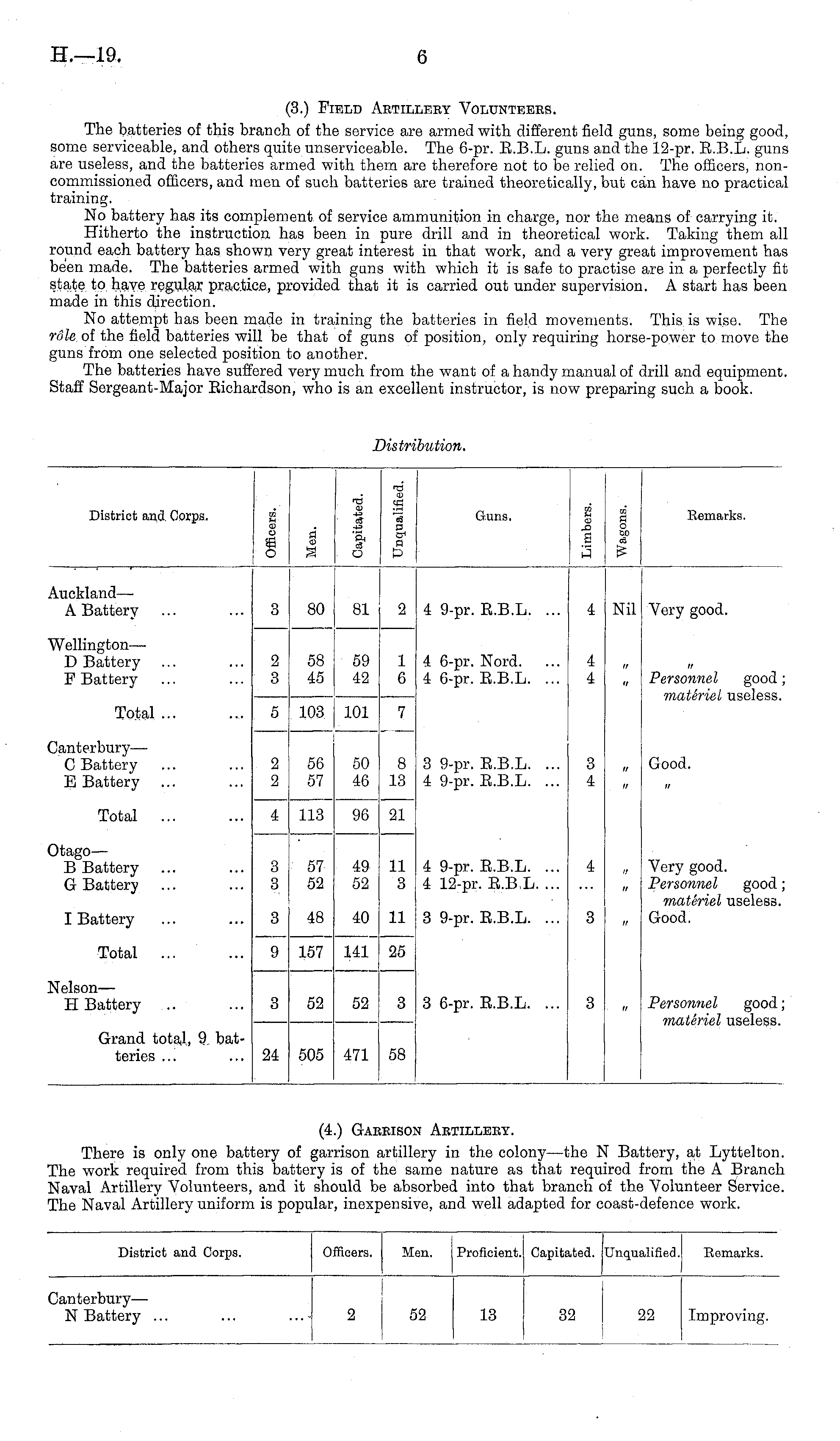 (4.) Gaekison Aetillbey. There is only one battery of garrison artillery in the colony—the N Battery, at Lyttelton. The work required from this battery is of the same nature as that required from the A Branch Naval Artillery Volunteers, and it should be absorbed into that branch of the Volunteer Service. The Naval Artillery uniform is popular, inexpensive, and well adapted for coast-defence work. District and Corps. Officers. Men. Proficient. Capitated. Unqualified. Remarks. Canterbury— N Battery ... ... ...- 2 52 13 32 22 Improving.