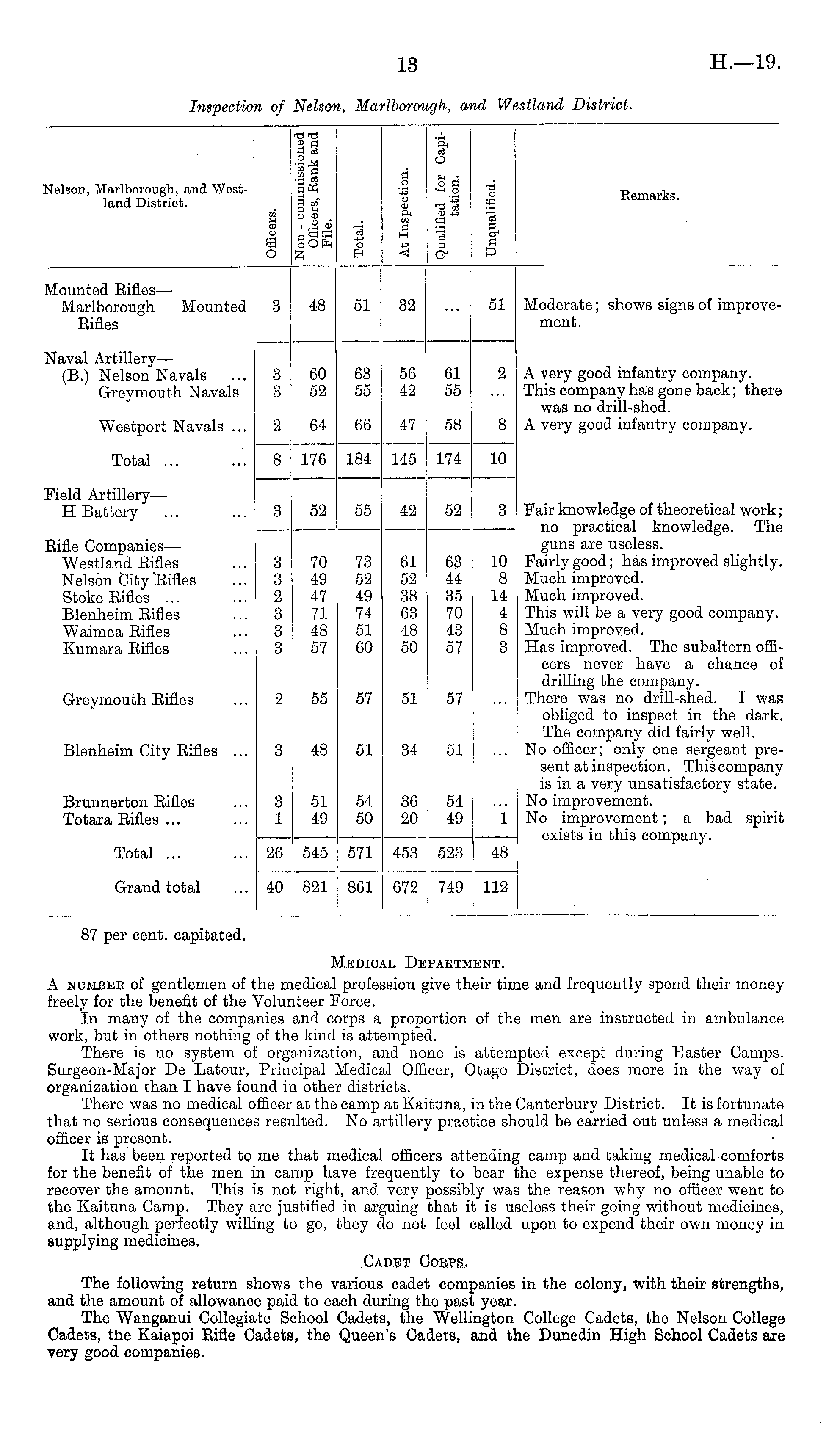 'elson, Marlborough, and Westland District. •a is © a a c3 ■i-a ■ <M CO a co o M CD CD h cfi :a 3 "3 43 O EH d o CD & CQ a M c3 O ©•a © 43 ca "3 a <y 13 © 9 "3 a en a P Remarks. CO © o o Mounted Eifles— Marlborough Mounted Eifles 48 51 32 51 Moderate; shows signs of improvement. Naval Artillery— (B.) Nelson Navals Greymouth Navals 3 3 60 52 63 55 56 42 61 55 2 A very good infantry company. This company has gone back; there was no drill-shed. A very good infantry company. Westport Navals ... 2 64 66 47 58 8 Total ... 8 176 184 145 174 10 Field Artillery— H Battery Eifle Companies — Westland Eifles Nelson City Eifles Stoke Eifles ... Blenheim Eifles Waimea Eifles Kumara Eifles 3 3 3 2 3 3 3 52 70 49 47 71 48 57 55 73 52 49 74 51 60 42 61 52 38 63 48 50 52 63 44 35 70 43 57 3 10 8 14 4 8 3 Fair knowledge of theoretical work; no practical knowledge. The guns are useless. Fairly good; has improved slightly. Much improved. Much improved. This will be a very good company. Much improved. Has improved. The subaltern officers never have a chance of drilling the company. There was no drill-shed. I was obliged to inspect in the dark. The company did fairly well. No officer; only one sergeant present at inspection. This company is in a very unsatisfactory state. No improvement. No improvement; a bad spirit exists in this company. Greymouth Eifles 55 57 51 57 Blenheim City Eifles ... 48 51 34 51 Brunnerton Eifles Totara Eifles ... 3 1 51 49 54 50 36 20 54 49 i Total ... 26 545 571 453 523 48 Grand total 40 821 861 672 749 112 87 per cent, capitated.