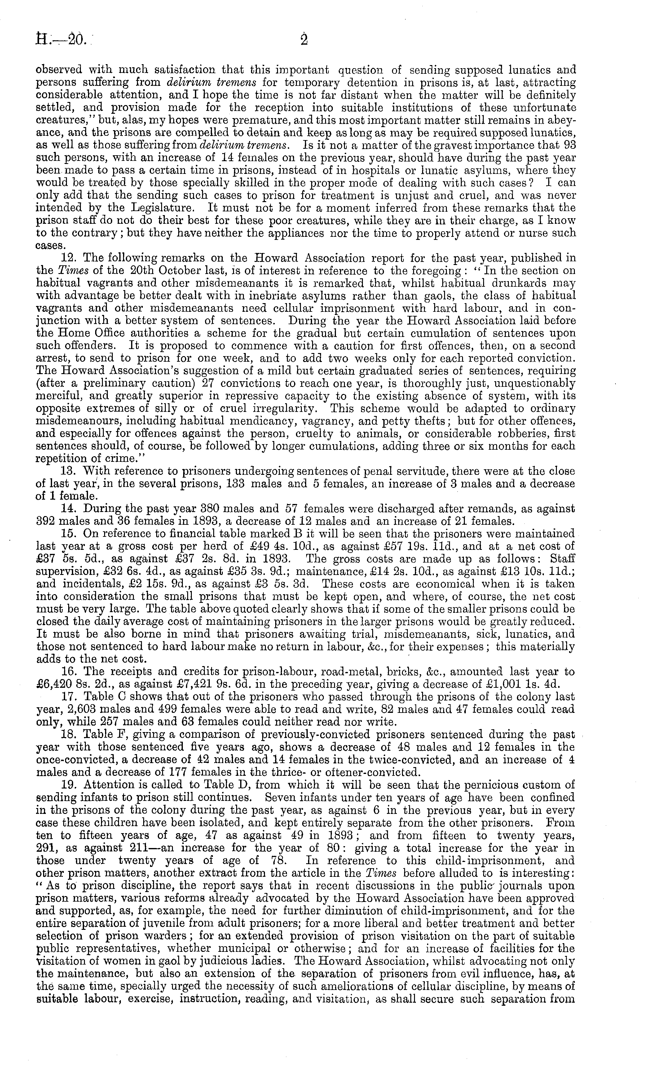 observed with much satisfaction that this important question of sending supposed lunatics and persons suffering from delirium tremens for temporary detention in prisons is, at last, attracting considerable attention, and I hope the time is not far distant when the matter will be definitely settled, and provision made for the reception into suitable institutions of these unfortunate creatures," but, alas, my hopes were premature, and this most important matter still remains in abeyance, and the prisons are compelled to detain and keep as long as may be required supposed lunatics, as well as those suffering from delirium tremens. Is it not a matter of the gravest importance that 93 such persons, with an increase of 14 females on the previous year, should have during the past year been made to pass a certain time in prisons, instead of in hospitals or lunatic asylums, where they would be treated by those specially skilled in the proper mode of dealing with such cases ? I can only add that the sending such cases to prison for treatment is unjust and cruel, and was never intended by the Legislature. It must not be for a moment inferred from these remarks that the prison staff do not do their best for these poor creatures, while they are in their charge, as I know to the contrary; but they have neither the appliances nor the time to properly attend or nurse such cases. 12. The following remarks on the Howard Association report for the past year, published in the Times of the 20th October last, is of interest in reference to the foregoing : " In the section on habitual vagrants and other misdemeanants it is remarked that, whilst habitual drunkards may with advantage be better dealt with in inebriate asylums rather than gaols, the class of habitual vagrants and other misdemeanants need cellular imprisonment with hard labour, and in conjunction with a better system of sentences. During the year the Howard Association laid before the Home Office authorities a scheme for the gradual but certain cumulation of sentences upon such offenders. It is proposed to commence with a caution for first offences, then, on a second arrest, to send to prison for one week, and to add two weeks only for each reported conviction. The Howard Association's suggestion of a mild but certain graduated series of sentences, requiring (after a preliminary caution) 27 convictions to reach one year, is thoroughly just, unquestionably merciful, and greatly superior in repressive capacity to the existing absence of system, with its opposite extremes of silly or of cruel irregularity. This scheme would be adapted to ordinary misdemeanours, including habitual mendicancy, vagrancy, and petty thefts; but for other offences, and especially for offences against the person, cruelty to animals, or considerable robberies, first sentences should, of course, be followed by longer cumulations, adding three or six months for each repetition of crime." 13. With reference to prisoners undergoing sentences of penal servitude, there were at the close of last year, in the several prisons, 133 males and 5 females, an increase of 3 males and a decrease of 1 female. 14. During the past year 380 males and 57 females were discharged after remands, as against 392 males and 36 females in 1893, a decrease of 12 males and an increase of 21 females. 15. On reference to financial table marked B it will be seen that the prisoners were maintained last year at a gross cost per herd of £49 4s. 10d., as against £57 19s. lid., and at a net cost of £37 ss. 5d., as against £37 2s. Bd. in 1893. The gross costs are made up as follows: Staff supervision, £32 6s. 4d., as against £35 3s. 9d.; maintenance, £14 2s. 10d., as against £13 10s. lid.; and incidentals, £2 15s. 9d., as against £3 ss. 3d. These costs are economical when it is taken into consideration the small prisons that must be kept open, and where, of course, the net cost must be very large. The table above quoted clearly shows that if some of the smaller prisons could be closed the daily average cost of maintaining prisoners in the larger prisons would be greatly reduced. It must be also borne in mind that prisoners awaiting trial, misdemeanants, sick, lunatics, and those not sentenced to hard labour make no return in labour, &c, for their expenses; this materially adds to the net cost. 16. The receipts and credits for prison-labour, road-metal, bricks, &c, amounted last year to £6,420 Bs. 2d., as against £7,421 9s. 6cL in the preceding year, giving a decrease of £1,001 Is. 4d. 17. Table C shows that out of the prisoners who passed through the prisons of the colony last year, 2,603 males and 499 females were able to read and write, 82 males and 47 females could read only, while 257 males and 63 females could neither read nor write. 18. Table P, giving a comparison of previously-convicted prisoners sentenced during the past year with those sentenced five years ago, shows a decrease of 48 males and 12 females in the once-convicted, a decrease of 42 males and 14 females in the twice-convicted, and an increase of 4 males and a decrease of 177 females in the thrice- or oftener-convicted. 19. Attention is called to Table D, from which it will be seen that the pernicious custom of sending infants to prison still continues. Seven infants under ten years of age have been confined in the prisons of the colony during the past year, as against 6 in the previous year, but in every case these children have been isolated, and kept entirely separate from the other prisoners. From ten to fifteen years of age, 47 as against 49 in 1893; and from fifteen to twenty years, 291, as against 211—an increase for the year of 80: giving a total increase for the year in those under twenty years of age of 78. In reference to this child-imprisonment, and other prison matters, another extract from the article in the Times before alluded to is interesting: " As to prison discipline, the report says that in recent discussions 