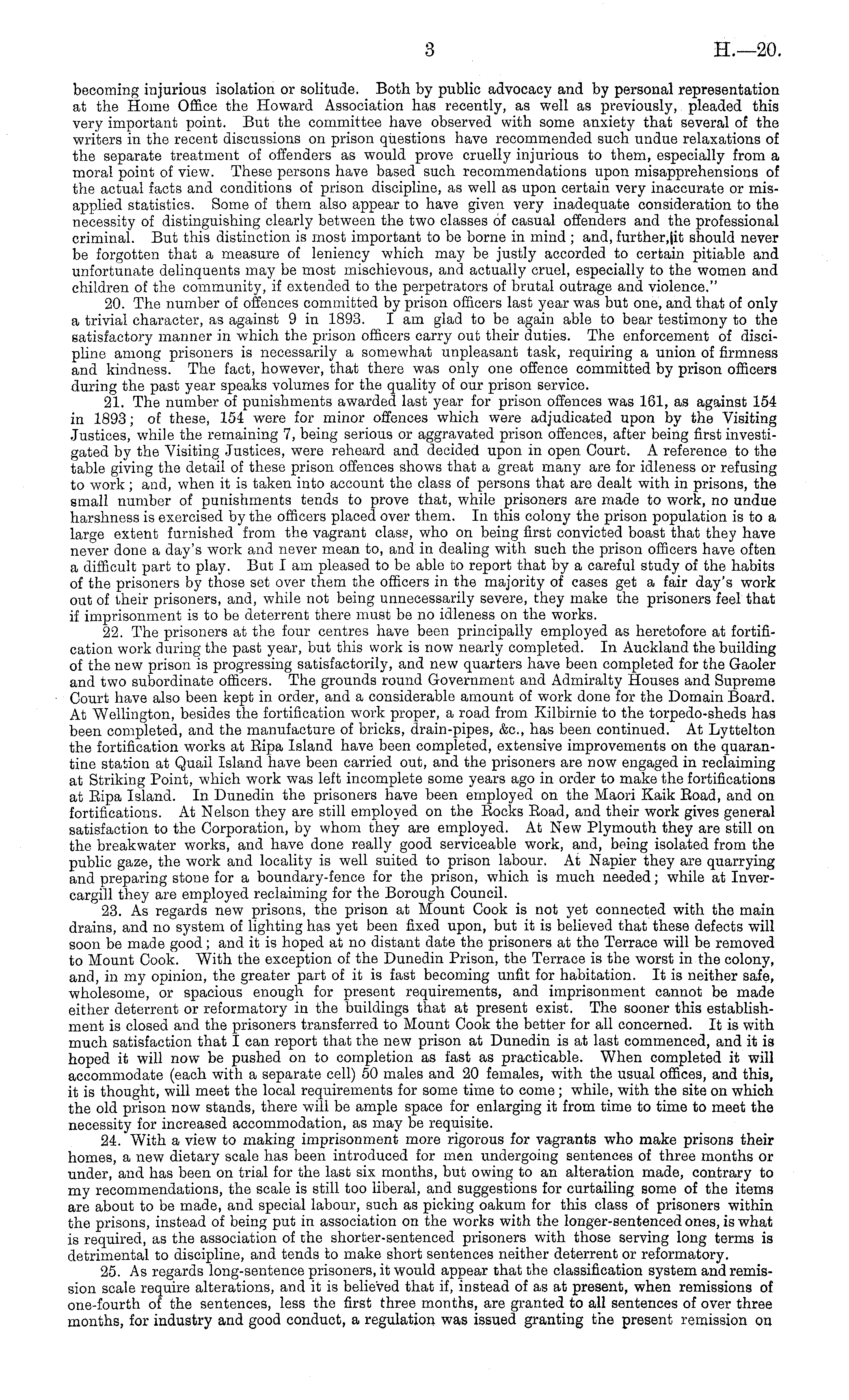 becoming injurious isolation or solitude. Both by public advocacy and by personal representation at the Home Office the Howard Association has recently, as well as previously, pleaded this very important point. But the committee have observed with some anxiety that several of the writers in the recent discussions on prison questions have recommended such undue relaxations of the separate treatment of offenders as would prove cruelly injurious to them, especially from a moral point of view. These persons have based such recommendations upon misapprehensions of the actual facts and conditions of prison discipline, as well as upon certain very inaccurate or misapplied statistics. Some of them also appear to have given very inadequate consideration to the necessity of distinguishing clearly between the two classes of casual offenders and the professional criminal. But this distinction is most important to be borne in mind ; and, further.jit should never be forgotten that a measure of leniency which may be justly accorded to certain pitiable and unfortunate delinquents may be most mischievous, and actually cruel, especially to the women and children of the community, if extended to the perpetrators of brutal outrage and violence." 20. The number of offences committed by prison officers last year was but one, and that of only a trivial character, as against 9in 1893. lam glad to be again able to bear testimony to the satisfactory manner in which the prison officers carry out their duties. The enforcement of discipline among prisoners is necessarily a somewhat unpleasant task, requiring a union of firmness and kindness. The fact, however, that there was only one offence committed by prison officers during the past year speaks volumes for the quality of our prison service. 21. The number of punishments awarded last year for prison offences was 161, as against 154 in 1893; of these, 154 were for minor offences which were adjudicated upon by the Visiting Justices, while the remaining 7, being serious or aggravated prison offences, after being first investigated by the Visiting Justices, were reheard and decided upon in open Court. A reference to the table giving the detail of these prison offences shows that a great many are for idleness or refusing to work; and, when it is taken into account the class of persons that are dealt with in prisons, the small number of punishments tends to prove that, while prisoners are made to work, no undue harshness is exercised by the officers placed over them. In this colony the prison population is to a large extent furnished from the vagrant class, who on being first convicted boast that they have never done a day's work and never mean to, and in dealing with such the prison officers have often a difficult part to play. But lam pleased to be able to report that by a careful study of the habits of the prisoners by those set over them the officers in the majority of cases get a fair day's work out of their prisoners, and, while not being unnecessarily severe, they make the prisoners feel that if imprisonment is to be deterrent there must be no idleness on the works. 22. The prisoners at the four centres have been principally employed as heretofore at fortification work during the past year, but this work is now nearly completed. In Auckland the building of the new prison is progressing satisfactorily, and new quarters have been completed for the Gaoler and two subordinate officers. The grounds round Government and Admiralty Houses and Supreme Court have also been kept in order, and a considerable amount of work done for the Domain Board. At Wellington, besides the fortification work proper, a road from Kilbirnie to the torpedo-sheds has been completed, and the manufacture of bricks, drain-pipes, &c, has been continued. At Lyttelton the fortification works at Eipa Island have been completed, extensive improvements on the quarantine station at Quail Island have been carried out, and the prisoners are now engaged in reclaiming at Striking Point, which work was left incomplete some years ago in order to make the fortifications at Bipa Island. In Dunedin the prisoners have been employed on the Maori Kaik Boad, and on fortifications. At Nelson they are still employed on the Bocks Boad, and their work gives general satisfaction to the Corporation, by whom they are employed. At New Plymouth they are still on the breakwater works, and have done really good serviceable work, and, being isolated from the public gaze, the work and locality is well suited to prison labour. At Napier they are quarrying and preparing stone for a boundary-fence for the prison, which is much needed; while at Invercargill they are employed reclaiming for the Borough Council. 23. As regards new prisons, the prison at Mount Cook is not yet connected with the main drains, and no system of lighting has yet been fixed upon, but it is believed that these defects will soon be made good; and it is hoped at no distant date the prisoners at the Terrace will be removed to Mount Cook. With the exception of the Dunedin Prison, the Terrace is the worst in the colony, and, in my opinion, the greater part of it is fast becoming unfit for habitation. It is neither safe, wholesome, or spacious enough for present requirements, and imprisonment cannot be made either deterrent or reformatory in the buildings that at present exist. The sooner this establishment is closed and the prisoners transferred to Mount Cook the better for all concerned. It is with much satisfaction that I can report that the new prison at Dunedin is at last commenced, and it is hoped it will now be pushed on to completion as fast as practicable. When completed it will accommodate (each with a separate cell) 50 males and 20 females, with the usual offices, and this, it is thought, will meet the local requirements for some time to come; while, with the site on which the old prison now stands, there will be ample space for enlarging it from time to