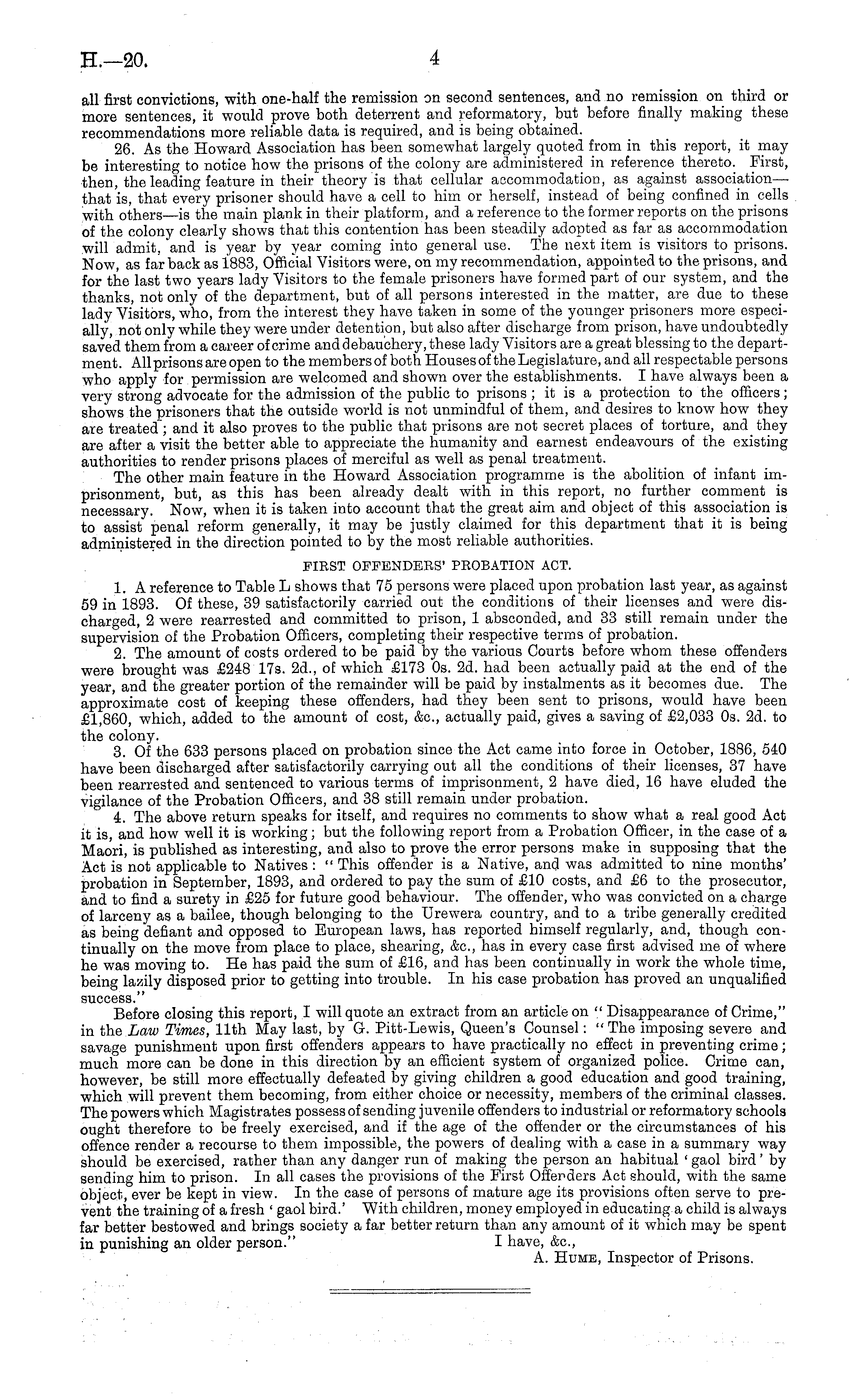 all first convictions, with one-half the remission on second sentences, and no remission on third or more sentences, it would prove both deterrent and reformatory, but before finally making these recommendations more reliable data is required, and is being obtained. 26. As the Howard Association has been somewhat largely quoted from in this report, it may be interesting to notice how the prisons of the colony are administered in reference thereto. First, then, the leading feature in their theory is that cellular accommodation, as against association—■ that is, that every prisoner should have a cell to him or herself, instead of being confined in cells with others —is the main plank in their platform, and a reference to the former reports on the prisons of the colony clearly shows that this contention has been steadily adopted as far as accommodation will admit, and is year by year coming into general use. The next item is visitors to prisons. Now, as far back as 1883, Official Visitors were, on my recommendation, appointed to the prisons, and for the last two years lady Visitors to the female prisoners have formed part of our system, and the thanks, not only of the department, but of all persons interested in the matter, are due to these lady Visitors, who, from the interest they have taken in some of the younger prisoners more especially, not only while they were under detention, but also after discharge from prison, have undoubtedly saved them from a career of crime and d ebauchery, these lady Visitors are a great blessing to the department. All prisons are open to the members of both Houses of the Legislature, and all respectable persons who apply for permission are welcomed and shown over the establishments. I have always been a very strong advocate for the admission of the public to prisons ; it is a protection to the officers; shows the prisoners that the outside world is not unmindful of them, and desires to know how they are treated"; and it also proves to the public that prisons are not secret places of torture, and they are after a visit the better able to appreciate the humanity and earnest endeavours of the existing authorities to render prisons places of merciful as well as penal treatment. The other main feature in the Howard Association programme is the abolition of infant imprisonment, but, as this has been already dealt with in this report, no further comment is necessary. Now, when it is taken into account that the great aim and object of this association is to assist penal reform generally, it may be justly claimed for this department that it is being administered in the direction pointed to by the most reliable authorities. FIRST OFFENDERS' PROBATION ACT. 1. A reference to Table L shows that 75 persons were placed upon probation last year, as against 59 in 1893. Of these, 39 satisfactorily carried out the conditions of their licenses and were discharged, 2 were rearrested and committed to prison, 1 absconded, and 33 still remain under the supervision of the Probation Officers, completing their respective terms of probation. 2. The amount of costs ordered to be paid by the various Courts before whom these offenders were brought was £248 17s. 2d., of which £173 Os. 2d. had been actually paid at the end of the year, and the greater portion of the remainder will be paid by instalments as it becomes due. The approximate cost of keeping these offenders, had they been sent to prisons, would have been £1,860, which, added to the amount of cost, &c, actually paid, gives a saving of £2,033 os. 2d. to the colony. 3. Of the 633 persons placed on probation since the Act came into force in October, 1886, 540 have been discharged after satisfactorily carrying out all the conditions of their licenses, 37 have been rearrested and sentenced to various terms of imprisonment, 2 have died, 16 have eluded the vigilance of the Probation Officers, and 38 still remain under probation. 4. The above return speaks for itself, and requires no comments to show what a real good Act it is, and how well it is working; but the following report from a Probation Officer, in the case of a Maori, is published as interesting, and also to prove the error persons make in supposing that the Act is not applicable to Natives: " This offender is a Native, and was admitted to nine months' probation in September, 1893, and ordered to pay the sum of £10 costs, and £6 to the prosecutor, and to find a surety in £25 for future good behaviour. The offender, who was convicted on a charge of larceny as a bailee, though belonging to the Urewera country, and to a tribe generally credited as being defiant and opposed to European laws, has reported himself regularly, and, though continually on the move from place to place, shearing, &c, has in every case first advised me of where he was moving to. He has paid the sum of £16, and has been continually in work the whole time, being lazily disposed prior to getting into trouble. In his case probation has proved an unqualified success." Before closing this report, I will quote an extract from an article on " Disappearance of Crime," in the Law Times, 11th May last, by G. Pitt-Lewis, Queen's Counsel: " The imposing severe and savage punishment upon first offenders appears to have practically no effect in preventing crime; much more can be done in this direction by an efficient system of organized police. Crime can, however, be still more effectually defeated by giving children a good education and good training, which will prevent them becoming, from either choice or necessity, members of the criminal classes. The powers which Magistrates possess of sending j uvenile offenders to industrial or reformatory schools ought therefore to be freely exercised, and if the age of the offender or the circumstances of his offence render a recourse to them impossible, the powers of dealing with a case in a summary way should be exercised, rather than any danger run of making the 