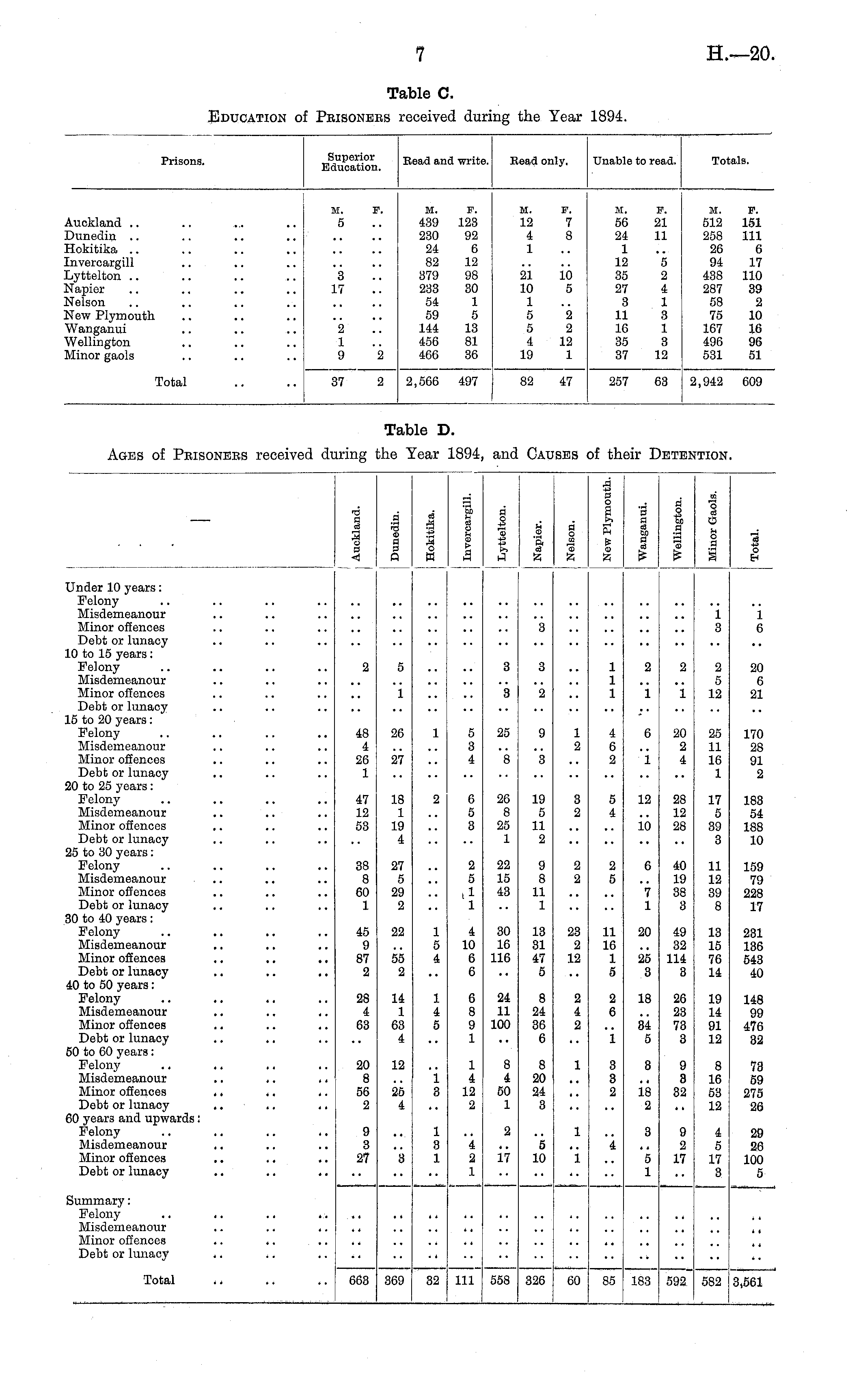 Prisons. Superior Education. Bead and write. Bead only. Unable to read. Totals. Auckland .. Dunedin .. Eokitika .. invercargill jyttelton .. STapier kelson Sfew Plymouth Wanganui Wellington Minor gaols t M. 5 8 17 F. M. 439 230 24 82 379 233 54 59 144 456 466 F. 123 92 6 12 98 30 1 5 13 81 36 M. 12 4 1 21 10 1 5 5 4 19 F. 7 8 io 5 2 2 12 1 M. 56 24 1 12 35 27 3 11 16 35 37 F. 21 11 "s 2 4 1 3 1 3 12 M. 512 258 26 94 438 287 58 75 167 496 531 F. 151 111 6 17 110 39 2 10 16 96 51 2 1 9 "2 Total 37 2,566 497 82 47 257 63 2,942 609