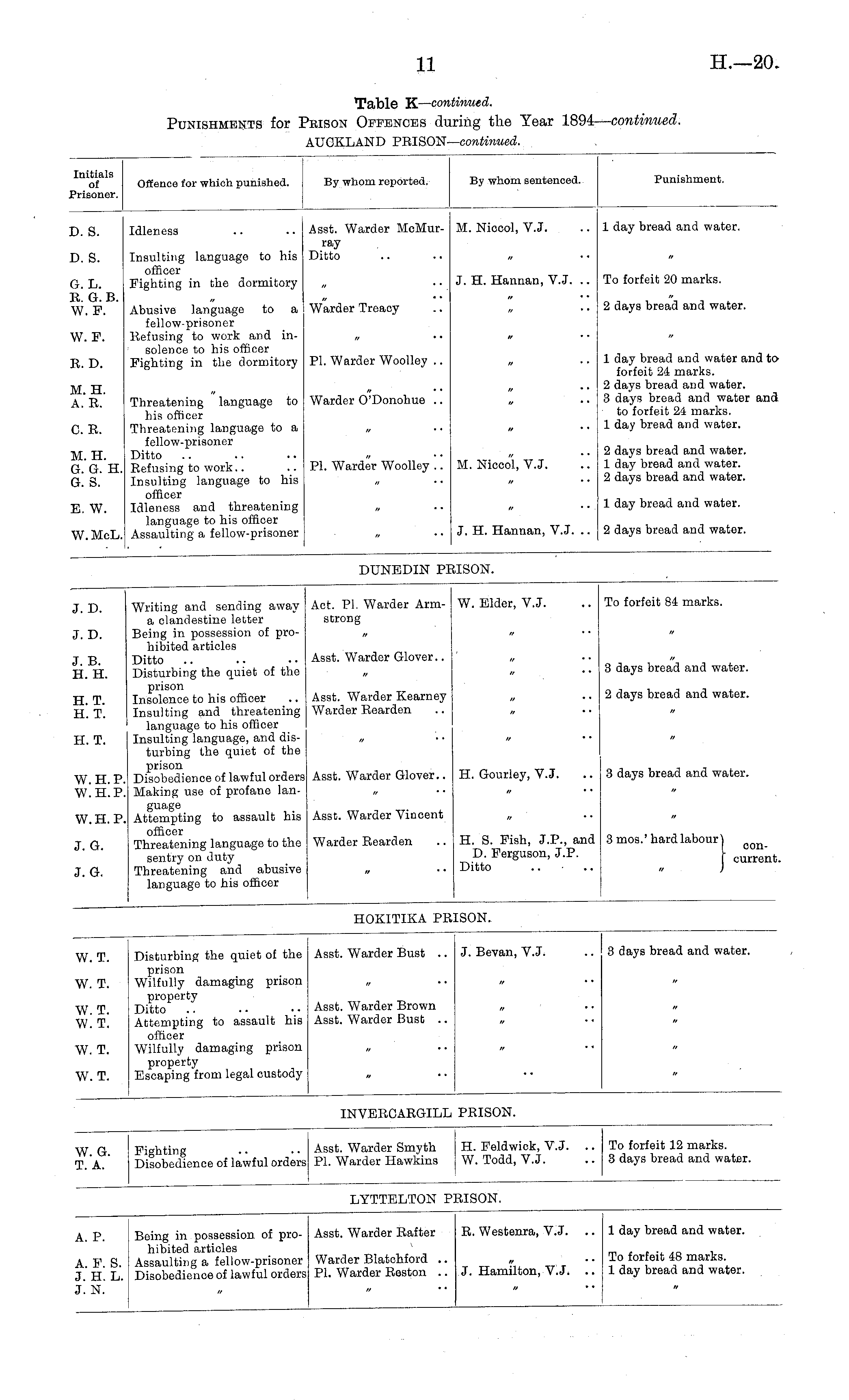 Initials of Prisoner. Punishment. Offence lor which punished. By whom reported. By whom sentenced. D. S. Idleness Asst. Warder McMurray Ditto M. Niccol, V.J. 1 day bread and water. D. S. Insulting language to his officer Fighting in the dormitory J. H. Hannan, V.J. .. To forfeit 20 marka. G. L. R. G. B. W. F. Abuaive language to a fellow-prisoner Refusing to work and insolence to his officer Fighting in the dormitory Warder Treacy 2 days bread and water. W. F. R. D. M. H. A. R. Threatening language to his officer Threatening language to a fellow-prisoner Ditto Refuaing to work Inaulting language to his officer Idleneas and threatening language to his officer Aaaaulting a fellow-prisoner PL Warder Woolley .. Warder O'Donohue .. 1 day bread and water and to forfeit 24 marks. 2 days bread and water. 3 days bread and water and to forfeit 24 marks. 1 day bread and water. C. R. M. H. G. G. H. G. S. PI. Warder Woolley .. M. Niccol, V.J. 2 days bread and water. 1 day bread and water. 2 days bread and water. E. W. 1 day bread and water. W.MoL. J. H. Hannan, V.J. .. 2 days bread and water. DUNEDIN PRISON. J. D. Writing and sending away a clandestine letter Being in possession of prohibited articles Ditto .. Disturbing the quiet of the prison Insolence to his officer Insulting and threatening language to his officer Insulting language, and disturbing the quiet of the prison Disobedience of lawful ordera Making uae of profane language _ Attempting to aasault his officer Threatening language to the sentry on duty Threatening and abusive language to his officer Act. PI. Warder Armstrong W. Elder, V.J. To forfeit 84 marks. J. D. it J. B. H. H. Asst. Warder Glover.. 3 days bread and water. H. T. H. T. Asat. Warder Kearney Warder Rearden 2 days bread and water. H. T. W. H.P. W.H.P. Asst. Warder Glover.. H. Gourley, V.J. 3 days bread and water. W.H. P. Asst. Warder Vincent « J. G. Warder Rearden H. S. Fish, J.P., and D. Ferguson, J.P. Ditto 3 mos.'hard labour 1 | current. J. G. HOKITIKA PR: SON. W. T. Disturbing the quiet of the prison Wilfully damaging prison property Ditto .. Attempting to assault his officer Wilfully damaging prison property Escaping from legal custody Asst. Warder Bust .. J. Bevan, V.J. 3 days bread and water. W. T. W. T. W. T. Asst. Warder Brown Asst. Warder Bust .. W. T. W. T. INVERCARGILL PRISON. W. G. T. A. Fighting .. Disobedience of lawful orders Asst. Warder Smyth PI. Warder Hawkins H. Feldwick, V.J. W. Todd, V.J. To forfeit 12 marks. 3 days bread and water. LYTTELTON P: ,ISON. A. P. Being in poasession of prohibited articles Assaulting a fellow-prisoner Disobedience of lawful orders Asst. Warder Rafter R. Westenra, V.J. 1 day bread and water. A. F. S. J. H. L. J.N. Warder Blatchford .. PI. Warder Reston .. J. Hamilton, V.J. To forfeit 48 marks. 1 day bread and water.