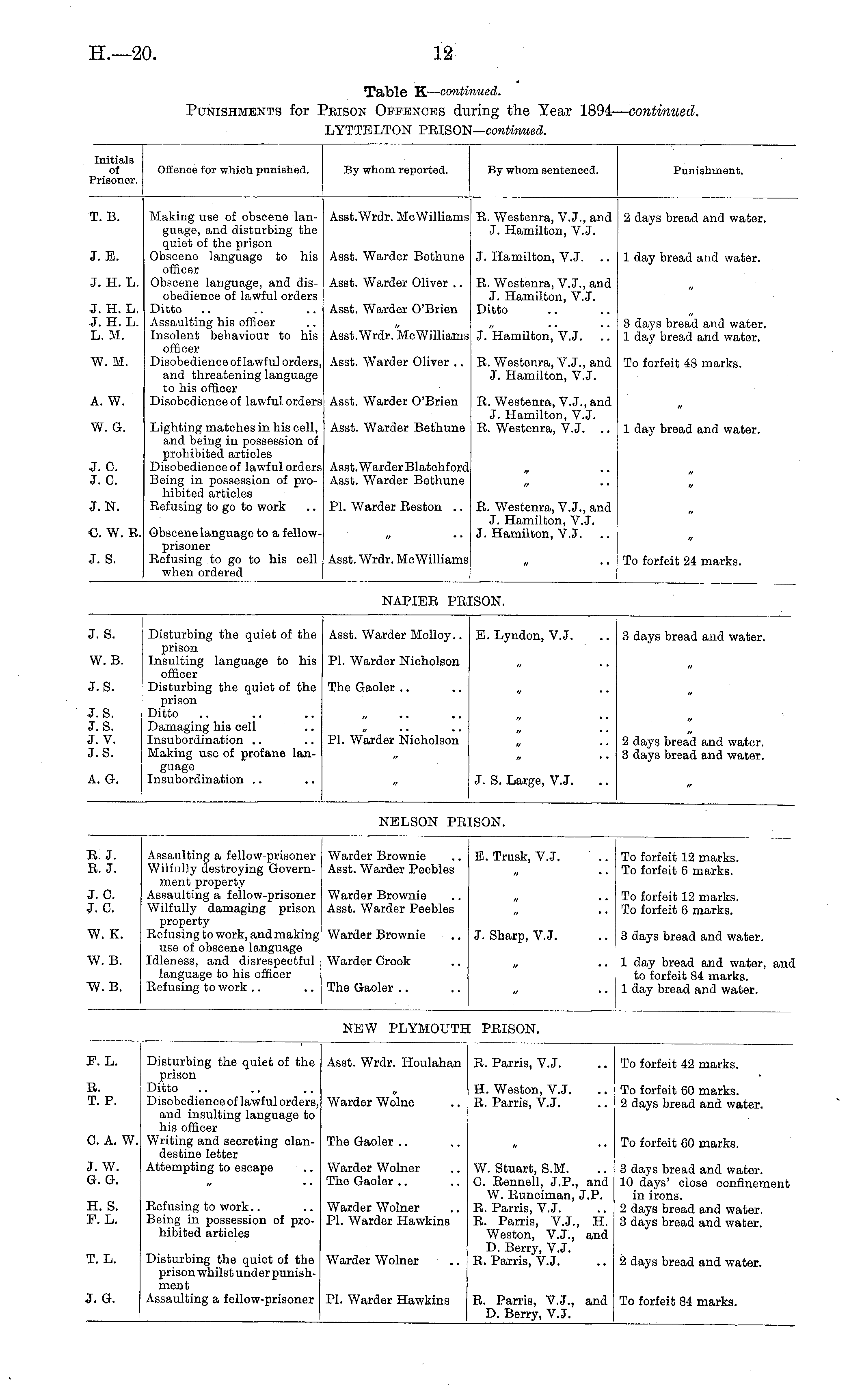 Initials of Prisoner. Offence for which punished. By whom reported. By whom sentenced. Punishment. T. B. Making use of obscene language, and disturbing the quiet of the prison Obscene language to his officer Obscene language, and disobedience of lawful orders Ditto .. Assaulting his officer Insolent behaviour to his officer Disobedience of lawful orders, and threatening language to his officer Disobedience of lawful orders Asst.Wrdr. Me Williams R. Westenra, V.J., and J. Hamilton, V.J. 2 days bread and water. J. E. Asst. Warder Bethune J. Hamilton, V.J. 1 day bread and water. J. H. L. Asst. Warder Oliver .. R. Westenra, V.J., and J. Hamilton, V.J. Ditto J. H. L. J. H. L. L. M. Asst. Warder O'Brien 3 days bread and water. 1 day bread and water. Asst.Wrdr. Me Williams J. Hamilton, V.J. W. M. Asst. Warder Oliver .. R. Westenra, V.J., and J. Hamilton, V.J. To forfeit 48 marks. A. W. Asst. Warder O'Brien R. Westenra, V.J., and J. Hamilton, V.J. R. Westenra, V.J. .. W. G. Lighting matches in his cell, and being in possession of prohibited articles Disobedience of lawful orders Being in possession of prohibited articles Refusing to go to work Asst. Warder Bethune 1 day bread and water. J. C. J. C. Asst. Warder Blatchf ord Asst. Warder Bethune J.N. O. W. R. Obscene language to a fellowprisoner Refusing to go to his cell when ordered PI. Warder Reston .. R. Westenra, V.J., and J. Hamilton, V.J. J. Hamilton, V.J. it J. S. Asst. Wrdr. McWilliams To forfeit 24 marks.