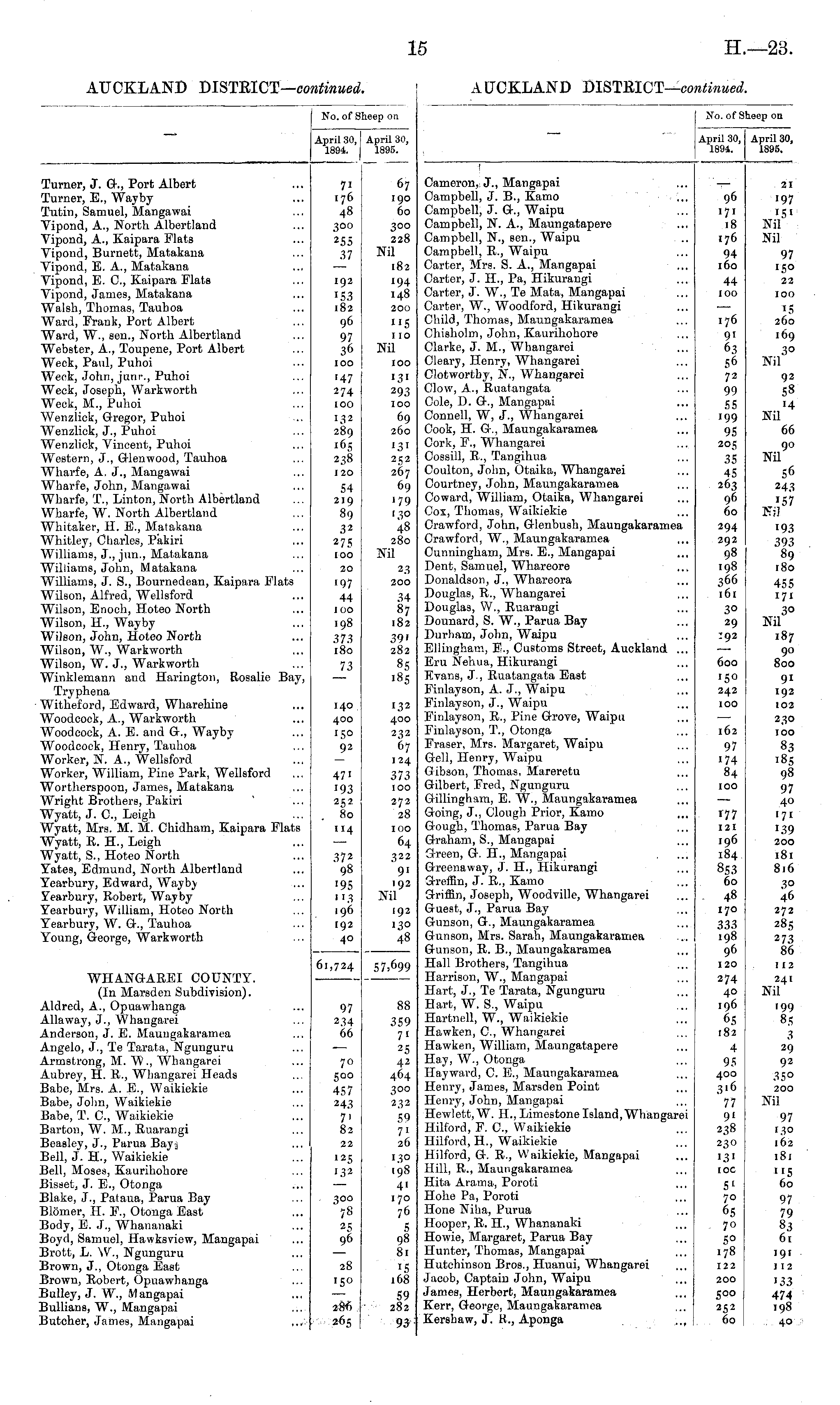 No. of Sheep on April 30, April 3 1894. 1895. April 30, 1895. 1 Cameron, J., Mangapai Campbell, J. B., Kamo Campbell, J. G., Waipu Campbell, N. A., Maungatapere Campbell, N., sen., Waipu Campbell, R., Waipu Carter, Mrs. S. A., Mangapai Carter, J. IL, Pa, Hikurangi Carter, J. W., Te Mata, Mangapai Carter, W., Woodford, Hikurangi Child, Thomas, Maungakaramea Chishohn, John, Kaurihohore Clarke, J. M., Whangarei Cleary, Henry, Whangarei Clotworthy, N., Whangarei Clow, A., Ruatangata Cole, D. G., Mangapai Connell, W, J., Whangarei Cook, H. G., Maungakaramea Cork, P., Whangarei Cossill, R., Tangihua Coulton, John, Otaika, Whangarei Courtney, John, Maungakaramea Coward, William, Otaika, Whangarei Cox, Thomas, Waikiekie Crawford, John, Glenbush, Maungakaramea Crawford, W., Maungakaramea Cunningham, Mrs. E., Mangapai Dent, Samuel, Whareore Donaldson, J., Whareora Douglas, R., Whangarei DouglaB, W., Ruarangi Dounard, S. W., Parua Bay Durham, John, Waipu Ellingham, E., Customs Street, Auckland ... Em Nehua, Hikurangi Evans, J., Ruatangata East Finlayson, A. J., Waipu Finlayson, J., Waipu Finlayson, R., Pine Grove, Waipu Finlayson, T., Otonga Fraser, Mrs. Margaret, Waipu Gell, Henry, Waipu Gibson, Thomas, Mareretu Gilbert, Fred, Ngunguru Gillingham, E. W., Maungakaramea Going, J., Clough Prior, Kamo Gough, Thomas, Parua Bay Graham, S., Mangapai Green, G. H., Mangapai Greenaway, J. H., Hikurangi Greffln, J. R., Kamo Griffin, Joseph, Woodville, Whangarei Guest, J., Parua Bay Gunson, G., Maungakaramea Gunson, Mrs. Sarah, Maungakaramea Gunson, R. B., Maungakaramea Hall Brothers, Tangihua Harrison, W., Mangapai Hart, J., Te Tarata, Ngunguru . . Hart, W. S., Waipu Hartnell, W., Waikiekie Hawken, C, Whangarei Hawken, William, Maungatapere Hay, W., Otonga Hay ward, C. E., Maungakaramea Henry, James, Marsden Point Henry, John, Mangapai Hew)ett,W. IL, Limestone Island, Whangarei Hilford, F. C, Waikiekie Hilford, H., Waikiekie Hilford, G. R., Waikiekie, Mangapai Hill, R., Maungakaramea Hita Arama, Poroti Hohe Pa, Poroti Hone Niha, Puma Hooper, R. IL, Whananaki Howie, Margaret, Parua Bay Hunter, Thomas, Mangapai Hutchinson Bros., Huanui, Whangarei Jacob, Captain John, Waipu James, Herbert, Maungakaramea Kerr, George, Maungakaramea Kershaw, J. E., Aponga 9 6 i 7 i 18 .76 94 160 44 100 176 9' 6,3 56 72 99 55 '99 95 205 35 45 263 96 60 294 292 98 198 366 161 30 29 : 9 2 600 '5° 242 100 162 97 174 84 100 21 197 "5< Nil Nil 97 150 22 100 15 260 169 3° Nil 92 58 '4 Nil 66 90 Nil 56 2 43 '57 Nil '93 393 89 180 455 171 3° Nil .87 90 800 91 192 102 230 100 83 185 98 97 40 171 '39 200 181 816 177 121 ,96 184 853 60 48 170 333 198 96 120 274 40 196 65 182 3° 46 272 285 273 86 112 241 Nil 4 95 400 316 '77 9' 238 230 '3' IOC '99 8,5 3 29 92 35° 200 Nil 97 '3° 162 181 5' 70 65 70 5° .78 122 "5 60 97 79 83 61 191 112 '33 474 198 40 200 500 252 60