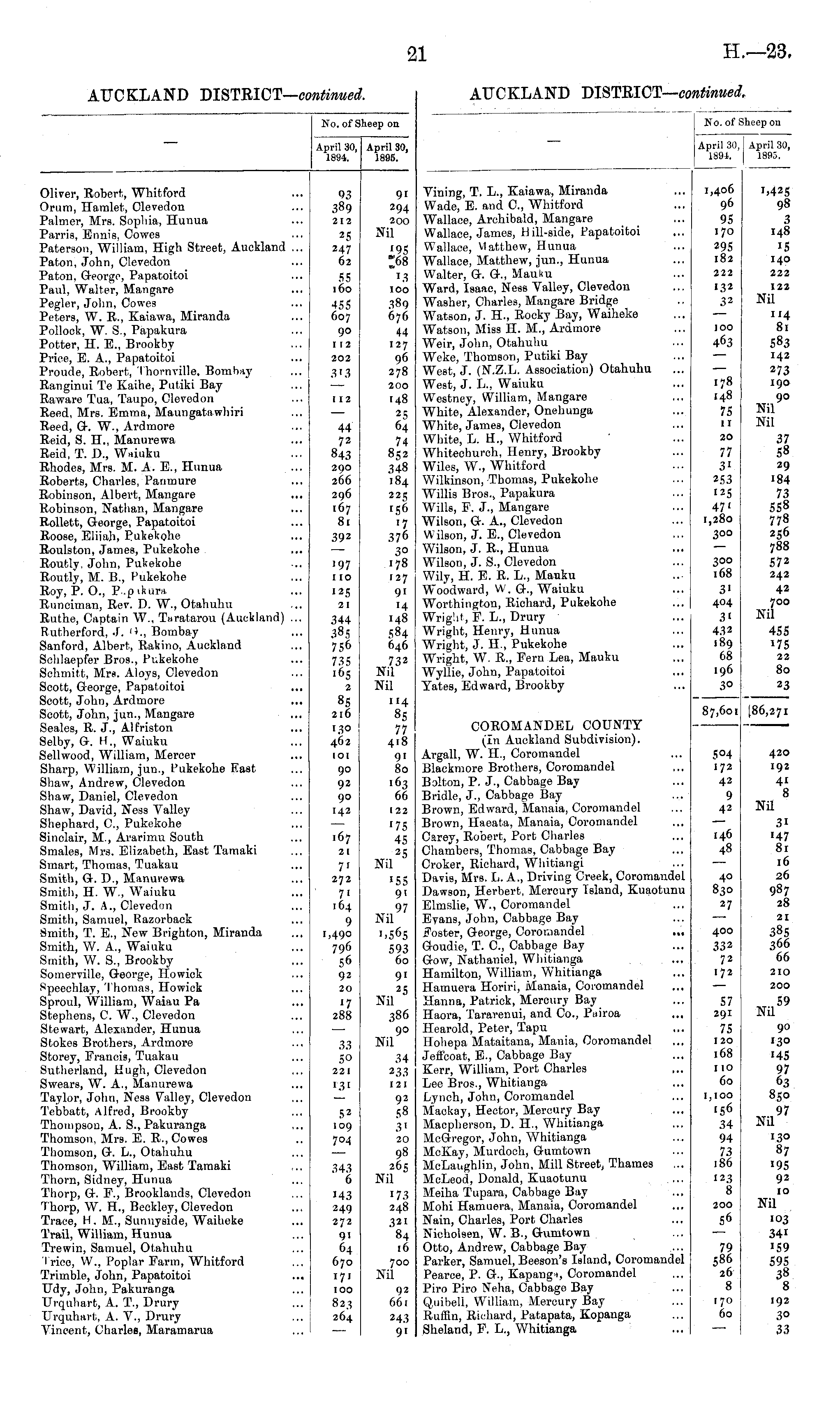 No. of Sheep on April 30, April 30, 1894. 1895. Oliver, Robert, Whitford Orum, Hamlet, Clevedon Palmer, Mrs. Sophia, Hunua Parris, Ennis, Cowes Paterson, William, High Street, Auckland ... Paton, John, Clevedon Paton, George, Papatoitoi Paul, Walter, Mangare Pegler, John, Cowes Peters, W. R., Kaiawa, Miranda Pollock, W. S., Papakura Potter, H. E., Brookby Price, E. A., Papatoitoi Proude, Robert, Thornville. Bombay Ranginui Te Kaihe, Putiki Bay Raware Tua, Taupo, Clevedon Reed, Mrs. Emma, Maungatawhiri Reed, G. W., Ardmore Reid, S. H, Manurewa Reid, T. D., Waiuku Rhodes, Mrs. M. A. E., Hunua Roberts, Charles, Panmure Robinson, Albert, Mangare Robinson, Nathan, Mangare Rollett, George, Papatoitoi Roose, Elijah, Pukekohe Roulston, James, Pukekohe Routly. John, Pukekohe Routlv, M. B., Pukekohe Roy, P. O., P,.piku_. Runciman, Rev. D. W., Otahuhu Ruthe, Captain W., Taratarou (Auckland) ... Rutherford, J. ''., Bombay Sanford, Albert, Rakino, Auckland Schlaepfer Bros., Pukekohe Schmitt, Mrs. Aloys, Clevedon Scott, George, Papatoitoi Scott, John, Ardmore Scott, John, jun., Mangare Seales, R. J., Alfriston Selby, G. H., Waiuku Sell wood, William, Mercer Sharp, William, jun., Pukekohe East Shaw, Andrew, Clevedon Shaw, Daniel, Clevedon Shaw, David, Ness Valley Shephard, C, Pukekohe Sinclair, M., Ararimu South Smales, Mrs. Elizabeth, East Tamaki Smart, Thomas, Tuakau Smith, G. D., Manurewa Smith, H. W., Waiuku Smith, J. A., Clevedon Smith, Samuel, Kazorback Smith, T. E., New Brighton, Miranda Smith, W. A., Waiuku Smith, W. S., Brookby Somerville, George, Howick Speechlay, Thomas, Howick Sproul, William, Waiau Pa Stephens, C. W., Clevedon Stewart, Alexander, Hunua Stokes Brothers, Ardmore Storey, Francis, Tuakau Sutherland, Hugh, Clevedon Swears, W. A., Manurewa Taylor, John, Ness Valley, Clevedon Tebbatt, Alfred, Brookby Thompson, A. S., Pakuranga Thomson, Mrs. E. R., Cowes Thomson, G. L., Otahuhu Thomson, William, East Tamaki Thorn, Sidney, Hunua Thorp, G. F., Brooklands, Clevedon Thorp, W. H, Beckley, Clevedon Trace, H. M., Sunnyside, Waiheke Trail, William, Hunua Trewin, Samuel, Otahuhu 1 rice, W., Poplar Farm, Whitford Trimble, John, Papatoitoi Udy, John, Pakuranga Urquhart, A. T., Drury Urquhart, A. V., Drury Vincent, Charles, Maramarua 93 389 212 25 247 62 55 i6o 455 607 90 112 202 3'3 112 44 72 843 290 266 296 167 81 392 '97 110 125 21 344 385 756 735 '65 2 85 216 130 462 101 9' 294 200 Nil •95 _S 8 '3 100 389 676 44 127 96 278 200 148 25 64 74 852 348 184 225 '56 '7 376 30 178 127 9' '4 148 584 646 732 Nil Nil 114 8S 77 418 9' 80 163 66 122 9° 92 9° 142 167 21 '75 45 25 Nil 7' 272 7' 164 9 1,490 796 56 92 20 '55 9' 97 Nil 1,565 593 60 9' 25 Nil 386 90 Nil '7 288 33 SO 221 131 34 2.33 121 92 58 3' 20 98 265 Nil 52 109 704 343 6 143 249 272 9' 64 670 171 100 823 264 '73 248 321 84 16 700 Nil 92 661 243 9'
