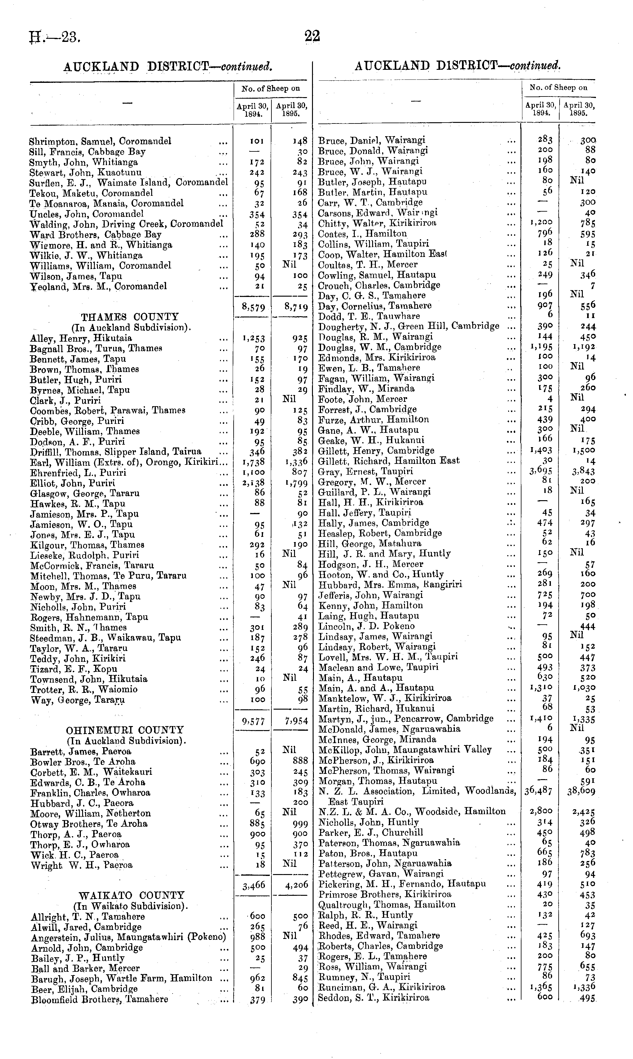 No. of Sheep on April 30, April 30, 1894. 1895. Shrimpton, Samuel, Coromandel Sill, Francis, Cabbage Bay Smyth, John, Whitianga Stewart, John, Kuaotunu Surflen, E. J., Waimate Island, Coromandel Tekou, Maketu, Coromandel Te Moanaroa, Manaia, Coromandel Uncles, John, Coromandel Walding, John, Driving Creek, Coromandel Ward Brothers, Cabbage Bay Wiemore, H. and R., Whitianga Wilkie, J. W., Whitianga Williams, William, Coromandel Wilson, James, Tapu Yeoland, Mrs. M., Coromandel 101 172 242 95 67 32 354 52 288 148 30 82 243 9' 168 26 354 34 293 183 '73 Nil 140 '95 50 94 21 100 25 THAMES COUNTY (In Auckland Subdivision). Alley, Henry, Hikutaia Bagnall Bros., Turua, Thames Bennett, James, Tapu Brown, Thomas, Thames Butler, Hugh, Puriri Byrnes, Michael, Tapu Clark, J., Puriri Coombes, Robert, Parawai, Thames Cribb, George, Puriri Deeble, William, Thames Dodson, A. F., Puriri Driffill, Thomas, Slipper Island, Tairua Earl, William (Extrs. of), Orongo, Kirikiri... Ehrenfried, L., Puriri Elliot, John, Puriri Glasgow, George, Tararu Hawkes, R. M., Tapu Jamieson, Mrs. P., Tapu Jamieson, W. O., Tapu Jones, Mrs. E. J., Tapu Kilgour, Thomas, Thames Lieseke, Rudolph, Puriri McCormick, Francis, Tararu Mitchell, Thomas, Te Puru, Tararu Moon, Mrs. M., Thames Newby, Mrs. J. D., Tapu Nicholls, John, Puriri Rogers, Hahnemann, Tapu Smith, R. N., Thames Steedman, J. B., Waikawau, Tapu Taylor, W. A., Tararu Teddy, John, Kirikiri Tizard, E. F., Kopu Townsend, John, Hikutaia Trotter, R. R., Waiomio Way, George, Tararu 8,579 8,719 1,253 70 '55 26 152 28 21 90 49 192 95 346 ',738 1,100 2,138 86 88 925 97 170 '9 97 29 Nil 125 8.3 95 85 382 1,336 807 1,799 S 2 81 9° L32 5' 190 Nil 84 96 Nil 95 61 292 16 5° 100 47 90 83 97 64 4' 289 278 96 87 24 Nil 301 '187 152 246 24 10 96 IOO 55 9'8 OHINEMURI COUNTY (In Auckland Subdivision). Barrett, James, Paeroa Bowler Bros., Te Aroba Corbett, E. M., Waitekauri Edwards, C. B., Te Aroha Franklin, Charles, Owharoa Hubbard, J. C, Paeora Moore, William, Netherton Otway Brothers, Te Aroha Thorp, A. J., Paeroa Thorp, E. J., Owharoa Wick. H. C, Paeroa Wright W. H, Paeroa 9,577 7,954 52 690 30.3 310 133 65 885 900 95 '5 18 Nil 888 245 3°9 '83 200 Nil 999 900 370 112 Nil WAIKATO COUNTY (In Waikato Subdivision). Allright, T. N, Tamahere Alwill, Jared, Cambridge Angerstein, Julius, Maungatawhiri (Pokeno) Arnold, John, Cambridge Bailey, J. P., Huntly Ball and Barker, Mercer Barugh, Joseph, Wartle Farm, Hamilton ... Beer, Elijah, Cambridge Bloomfield Brothers, Tamahere 3,466 4,206 600 265 988 500 25 962 81 379 500 76 Nil 494 37 29 845 60 39°