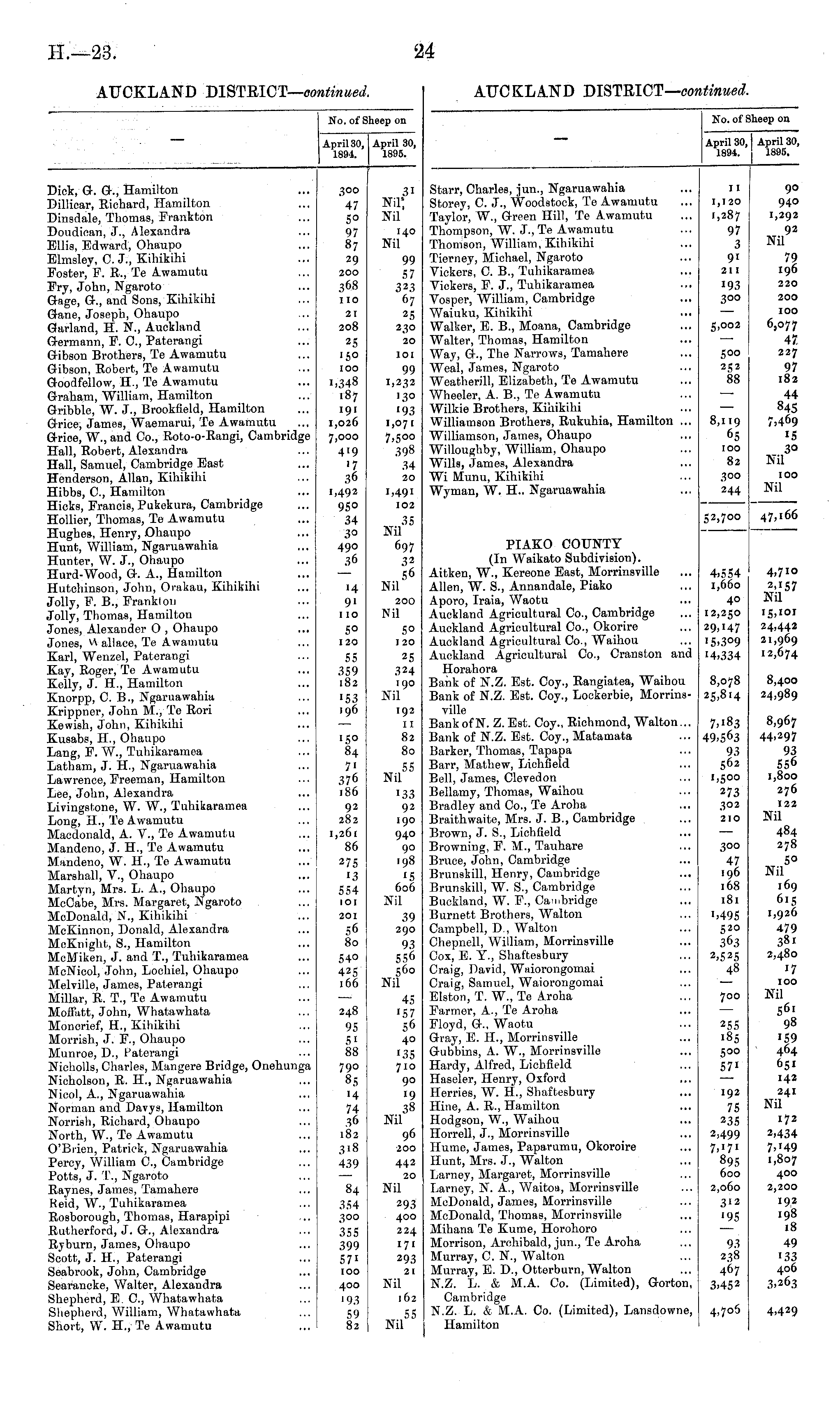 No. of Sheep on April 30, 1894. April 30, 1895. Dick, G. G., Hamilton Dilliear, Richard, Hamilton Dinsdale, Thomas, Frankton Doudican, J., Alexandra Ellis, Edward, Ohaupo Elmsley, C. J., Kihikihi Foster,*F. R., Te Awamutu Fry, John, Ngaroto Gage, G., and Sons, Kihikihi Gane, Joseph, Ohaupo Garland, H. _ ., Auckland Germann, F. C, Paterangi Gibson Brothers, Te Awamutu Gibson, Robert, Te Awamutu Goodfellow, H., Te Awamutu Graham, William, Hamilton Gribble, W. J., Brookfield, Hamilton Grice, James, Waemarui, Te Awamutu Grice, W., and Co., Roto-o-Rangi, Cambridge Hall, Robert, Alexandra Hall, Samuel, Cambridge East Henderson, Allan, Kihikihi Hibbs, C, Hamilton Hicks, Francis, Pukekura, Cambridge Hollier, Thomas, Te Awamutu Hughes, Henry, Ohaupo Hunt, William, Ngaruawahia Hunter, W. J., Ohaupo Hurd-Wood, G. A., Hamilton Hutchinson, John, Orakau, Kihikihi Jolly, F. B., Frankton Jolly, Thomas, Hamilton Jones, Alexander 0 , Ohaupo Jones, Wallace, Te Awamutu Karl, Wenzel, Paterangi Kay, Roger, Te Awamutu Kelly, J. IL, Hamilton Knorpp, C. B., Ngaruawahia Krippner, John M, Te Rori Kewish, John, Kihikihi Kusabs, H., Ohaupo Lang, F. W., Tuhikaramea Latham, J. H, Ngaruawahia Lawrence, Freeman, Hamilton Lee, John, Alexandra Livingstone, W. W., Tuhikaramea Long, H., Te Awamutu Macdonald, A. V., Te Awamutu Mandeno, J". H, Te Awamutu Mandeno, W. H., Te Awamutu Marshall, V., Ohaupo Martyn, Mrs. L. A., Ohaupo McCabe, Mrs. Margaret, Ngaroto McDonald, N., Kihikihi McKinnon, Donald, Alexandra McKnight, S., Hamilton McMiken, J. and T., Tuhikaramea McNicol, John, Lochiel, Ohaupo Melville, James, Paterangi Millar, R. T., Te Awamutu Moffatt, John, Whatawhata Moncrief, H, Kihikihi Morrish, J. F., Ohaupo Munroe, D., Paterangi Nicholls, Charles, Mangere Bridge, Onehunga Nicholson, R. H„ Ngaruawahia Nicol, A., Ngaruawahia Norman and Davys, Hamilton Norrish, Richard, Ohaupo North, W., Te Awamutu O'Brien, Patrick, Ngaruawahia Percy, William C., Cambridge Potts, J. _., Ngaroto Raynes, James, Tamahere Reid, W., Tuhikaramea Rosborough, Thomas, Harapipi Rutherford, J. G., Alexandra Ryburn, James, Ohaupo Scott, J. H., Paterangi Seabrook, John, Cambridge Searancke, Walter, Alexandra Shepherd, E. O, Whatawhata Shepherd, William, Whatawhata Short, W. H, Te Awamutu 3°° 47 5° 97 87 29 200 368 no 21 208 25 150 IOO 1,348 ,87 191 1,026 7,000 419 17 36 1,492 9SO 34 30 490 36 14 91 110 50 120 55 359 182 153 196 150 84 7i 376 186 3' Nii; Nil 140 Nil 99 57 323 67 25 230 20 101 99 1,232 '30 '93 1,071 7,500 398 34 20 1,491 102 35 Nil 697 32 56 Nil 200 Nil SO 120 25 324 190 Nil 192 11 82 80 55 Nil 92 282 1,261 86 275 '3 554 101 201 56 80 540 425 166 '33 92 190 940 90 198 '5 606 Nil 39 290 93 556 560 Nil 248 95 5' 88 45 '57 56 40 '35 710 9° '9 38 Nil 790 85 14 74 36 182 3'8 439 96 200 442 20 Nil 84 354 300 355 399 57' 100 293 400 224 171 293 21 Nil 162 55 Nil 400 '93 59 82