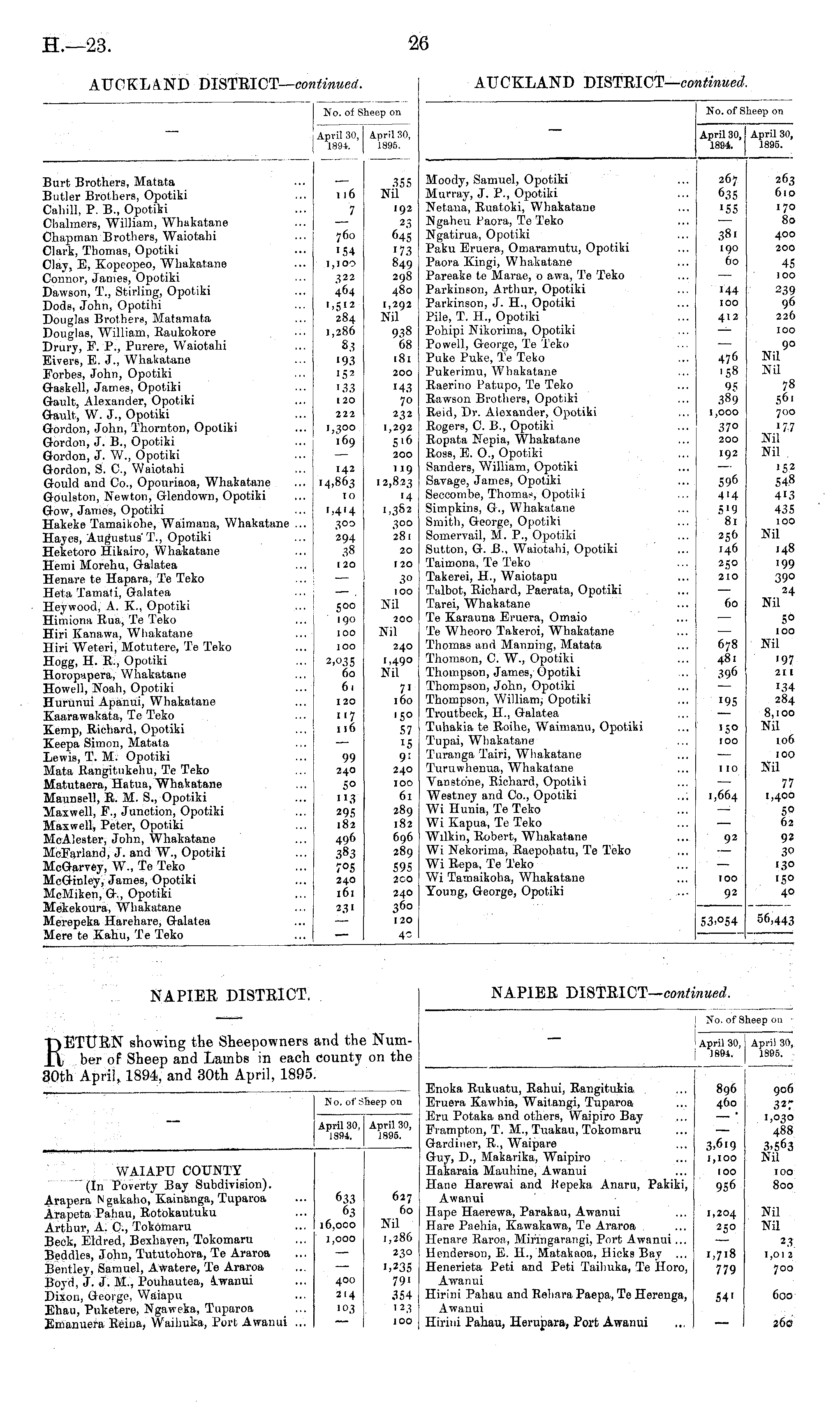 No. of Sheep ou - April 30, April 30, 1891. 1895. Enoka Rukuatu, Rahui, Rangitukia Eruera Kawhia, Waitangi, Tuparoa Eru Potaka and others, Waipiro Bay Frampton, T. M., Tuakau, Tokomaru Gardiner, R., Waipare Guy, D., Makarika, Waipiro Hakaraia Mauhine, Awanui Hane Harewai and Kepeka Anaru, Pakiki, Awanui Hape Haerewa, Parakau, Awanui Hare Paehia, Kawakawa, Te Araroa Henare Raroa, Miringarangi, Port Awanui... Henderson, E. H, Matakaoa, Hicks Bay ... Henerieta Peti and Peti Taihuka, Te Horo, Awanui Hirini Pahau and Rehnra Paepa, Te Herenga, Awanui Hirini Pahau, Herupara, Port Awanui 896 460 3,619 1,100 IOO 956 1,204 250 1,718 779 906 327 1,030 488 3,563 Nil 100 800 Nil Nil «... 1,012 700 54' 600 260