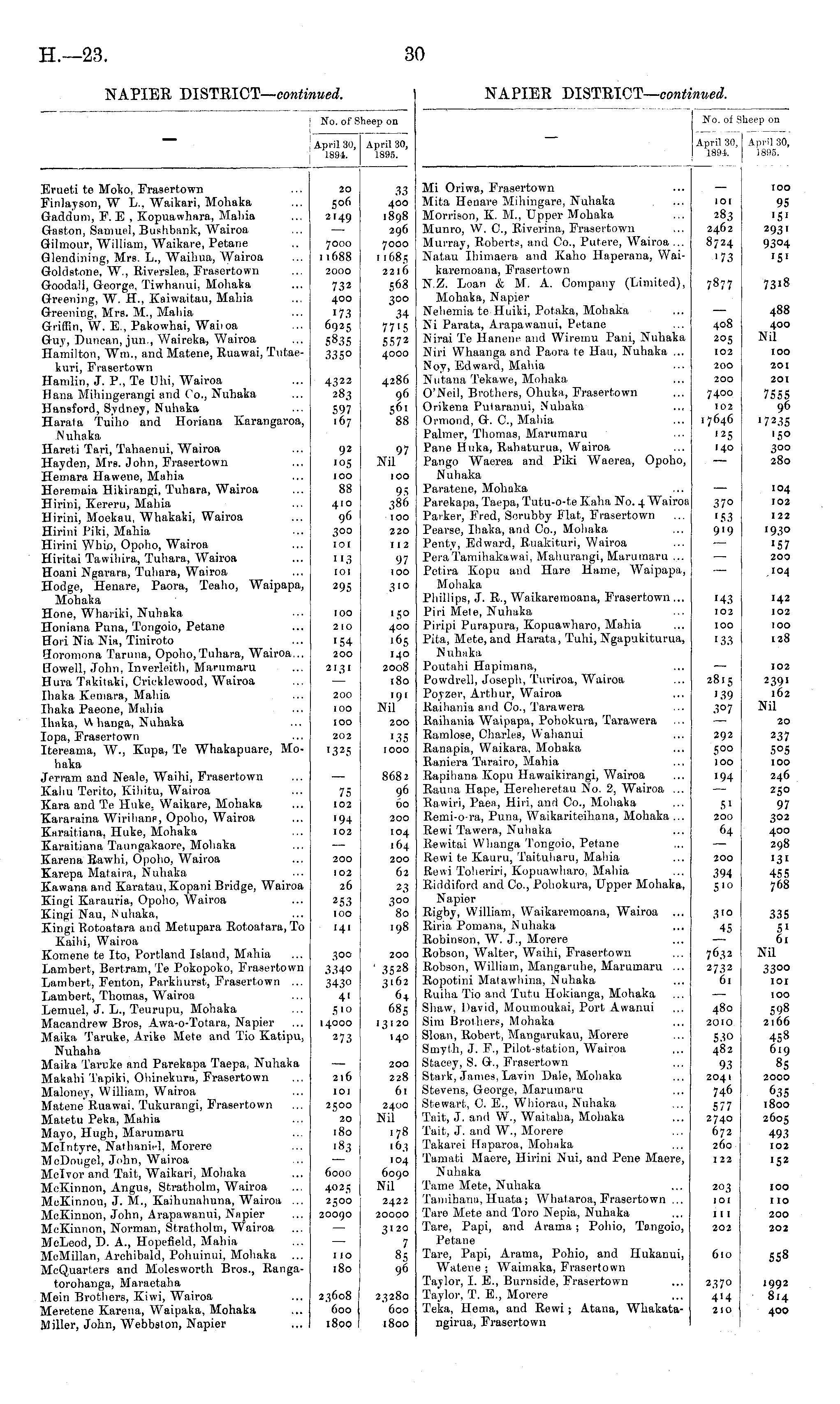 j No. of Sheep on I April 30, April 30, j 1894. 1895. Erueti te Moko, Frasertown Finlayson, W L., Waikari, Mohaka Gaddum, F. E , Kopuawhara, Mahia Gaston, Samuel, Bushbank, Wairoa Gilmour, William, Waikare, Petane Glendining, Mrs. L., Waihua, Wairoa Goldstone, W., Riverslea, Frasertown Goodall, George, Tiwhanui, Mohaka Greening, W. H, Kaiwaitau, Mahia Greening, Mrs. M., Mahia Griffin, W. E., Pakowhai, Waiioa Guy, Duncan, jun., Waireka, Wairoa Hamilton, Wm., and Matene, Ruawai, Tutaekuri, Frasertown Hamlin, J. P., Te Uhi, Wairoa liana Mihingerangi and Co., Nuhaka Hansford, Sydney, Nuhaka Harata Tuiho and Horiana Karangaroa, Nuhaka Hareti Tari, Tahaenui, Wairoa Hayden, Mrs. John, Frasertown Hemara Hawene, Mahia Heremaia Hikirangi, Tuhara, Wairoa Hirini, Kereru, Mahia Hirini, Moeknu, Whakaki, Wairoa Hirini Piki, Mahia Hirini Whip, Opoho, Wairoa Hiritai Tawihira, Tuhara, Wairoa Hoani Ngarara, Tuhara, Wairoa Hodge, Henare, Paora, Teabo, Waipapa, Mohaka Hone, Whaviki, Nuhaka Honiana Puna, Tongoio, Petane Hori Nia Nia, Tiniroto Horomona Taruna, Opoho,Tuhara, Wairoa... Howell, John, Inverleith, Marumaru Hura Takitaki, Cricklewood, Wairoa Ihaka Kemara, Mahia Ihaka Paeone, Mahia Ihaka, V\ hanga, Nuhaka Iopa, Frasertown Itereama, W., Kupa, Te Whakapuare, Mohaka 20 5°6 2149 7000 11688 2000 732 400 173 6925 S835 335° 4322 283 597 167 92 i°5 100 88 410 96 300 101 33 400 1898 296 7000 11685 2216 568 300 34 77'5 5572 4000 4286 96 56. 88 97 Nil 100 95 386 100 220 112 i"3 101 295 97 100 310 IOO 210 '5° 400 '65 140 2008 180 ■54 200 2131 200 100 IOO 191 Nil 200 202 '35 1000 I325 Jerram and Neale, Waihi, Frasertown Kaliu Terito, Kihitu, Wairoa Kara and Te Huke, Waikare, Mohaka Kararaina Wirihanp, Opoho, Wairoa Karaitiana, Huke, Mohaka Karaitiana Taungakaore, Mohaka Karena Rawhi, Opoho, Waiioa Karepa Mataira, Nuhaka Kawana and Karatau, Kopani Bridge, Wairoa Kingi Karauria, Opoho, Wairoa Kingi Nau, Nuhaka, Kingi Rotoatara and Metupara Rotoatara, To Kaihi, Wairoa Komene te Ito, Portland Island, Mahia Lambert, Bertram, Te Pokopoko, Frasertown Lambert, Fenton, Parkhurst, Frasertown ... Lambert, Thomas, Wairoa Lemuel, J. L., Teurupu, Mohaka Macandrew Bros, Awa-o-Totara, Napier Maika Taruke, Arike Mete and Tio Katipu, Nuhaha Maika Taruke and Parekapa Taepa, Nuhaka Makahi Tapiki, Ohinekura, Frasertown Maloney, William, Wairoa Matene Ruawai, Tukurangi, Frasertown Matetu Peka, Mahia Mayo, Hugh, Marumaru Mclntyre, Nathaniel, Morere McDougel, John, Wairoa Mclvor and Tait, Waikari, Mohaka McKinnon, Angus, Stratholm, Wairoa McKinnon, J. M., Kaihunahuna, W T airoa ... McKinnon, John, Arapawanui, Napier McKinnon, Norman, Stratholm, Wairoa McLeod, D. A., Hopefield, Mahia McMillan, Archibald, Pohuinui, Mohaka ... McQuarters and Molesworlh Bros., Rangatorohanga, Maraetaha Mein Brothers, Kiwi, Wairoa Meretene Karena, Waipaka, Mohaka Miller, John, Webbston, Napier 75 102 8682 96 60 '94 102 200 104 164 200 62 23 300 80 198 200 102 26 253 100 141 300 334° 343° 4' 5'0 14000 2 73 200 ' 3528 3162 6+ 685 13120 140 216 200 228 61 101 2500 20 180 '83 2400 Nil 178 '63 104 6090 Nil 2422 20000 6000 4025 2500 20090 3120 110 180 7 85 96 23608 600 1800 23280 600 1800