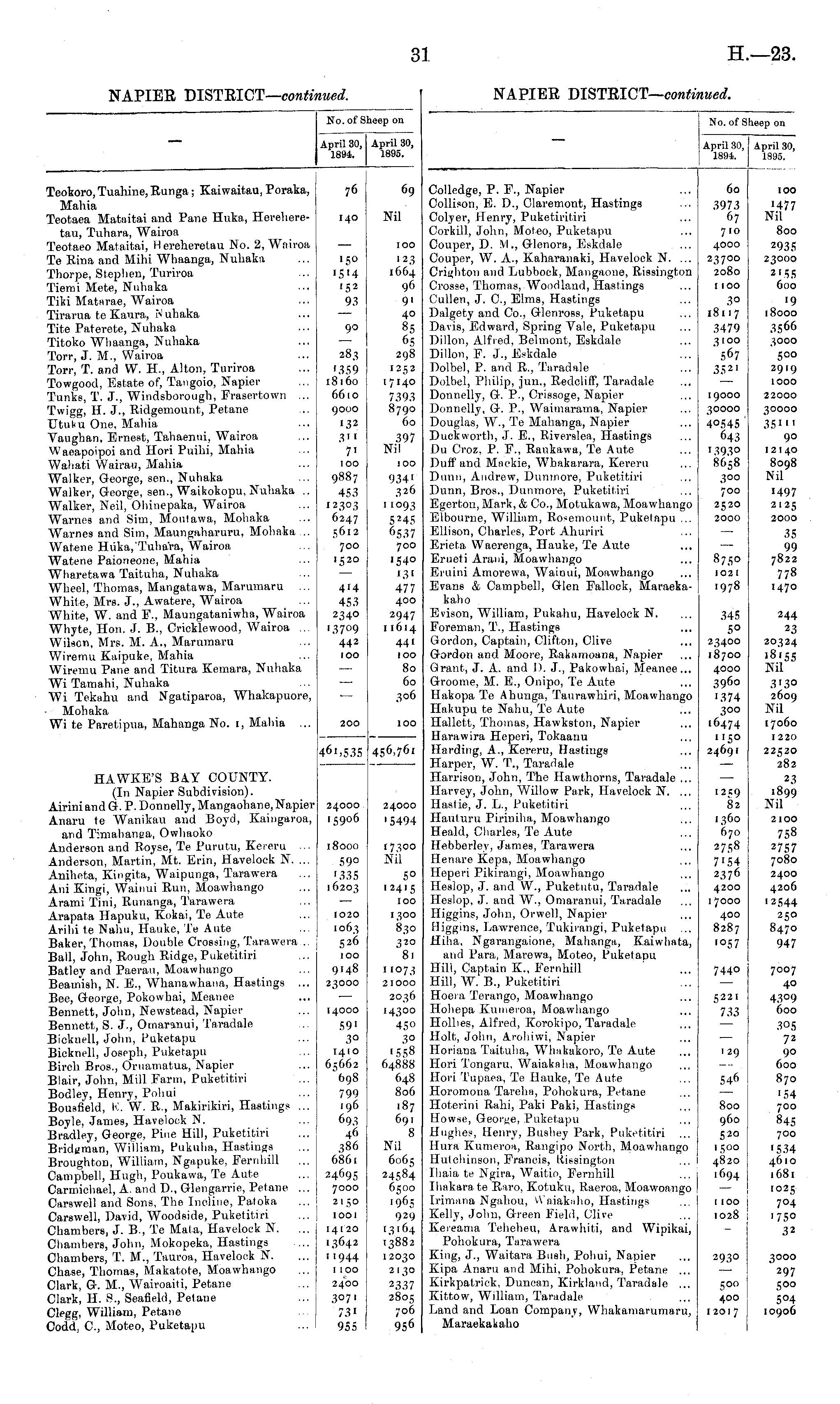 No, of Sheep on April 30, I April 3 1891. 1895. April 30, 1895. Colledge, P. F., Napier Collison, E. D., Claremont, Hastings Colyer, Henry, Puketiritiri Corkill, John, Moleo, Puketapu Couper, D. VI., Glenora, Eskdale Couper, W. A., Kaharanaki, Havelock N. ... Crighton and Lubbock, Mangaone, Rissington Crosse, Thomas, Woodland, Hastings Cullen, J. C, Elms, Hastings Dalgcty and Co., Glenross, Puketapu Davis, Edward, Spring Vale, Puketapu Dillon, Alfred, Belmont, Eskdale Dillon, F. J., Eskdale Dolbel, P. and R., Taradale Dolbel, Philip, jun., Redcliff, Taradale Donnelly, G. P., Crissoge, Napier Donnelly, G. P., Waimarama, Napier Douglas, W., Te Mabanga, Napier Duckworth, J. E., Riverslea, Hastings Du Croz, P. F., Raukawa, Te Aute Duff and Mackie, Whakarara, Kereru Dunn, Andrew, Dunniore, Puketitiri Dunn, Bros., Dunmore, Puketitii'i Egerton, Mark, & Co., Motukawa, Moawbango Elbourne, William, Rosemounfc, Puketapu ... Ellison, Charles, Port Ahuriri Erieta Waerenga, Hauke, Te Aute Erueti Arani, Moawbango Eruini Amorewa, Wainui, Moawbango Evans & Campbell, Glen Fallock, Maraekakaho Evison, William, Pukahu, Havelock N. Foreman, T\, Hastings Gordon, Captain, Clifton, Clive Gordon and Moore, Rakamoana, Napier Grant, J. A. and 1). J., Pakowhai, Meanee... Groome, M. E., Onipo, Te Aute Hakopa Te Ahunga, Taurawhiri, Moawliango Hakupu te Nabu, Te Aute Hallett, Thomas, Hawkston, Napier Harawira Heperi, Tokaanu Harding, A., Kereru, Hastings Harper, W. T., Taradale Harrison, John, The Hawthorns, Taradale ... Harvey, John, Willow Park, Havelock N. ... Haslie, J. L., Puketitiri Hauluru Piriniha, Moawbango Heald, Charles, Te Aute Hebberley, James, Tarawera Henare Kepa, Moawbango Heperi Pikirangi, Moawliango Heslop, J. and W., Pukctutu, Taradale Heslop, J. and W., Omaranui, Taradale Higgins, John, Orwell, Napier Higgins, Lawrence, Tukirangi, Puketapu Hiha. Ngarangaione, Mabanga, Kaiwhnta, and Para, Marewa, Moteo, Puketapu Hill, Captain K., Eernhill Hill, W. B., Puketitiri Hoera Terango, Moawbango Hohepa Kuineroa, Moawliango Hollies, Alfred, Korokipo, Taradale Holt, John, Arohiwi, Napier Horiana Taituha, Whakakoro, Te Aute Hori Tongaru, Waiaksiha, Moawhango Hori Tupaea, Te Hauke, Te Aute Horomona Tareba, Pohokura, Petane Hoterini Rahi, Paki Paki, Hastings Howse, George, Puketapu Hughes, Henry, Bushey Park, Puketitiri Hura Kumeroa, Rangipo North, Moawhango Hutchinson, Francis, Rissington Ihaia te Ngira, Waitio, Fernhill Thakarate Raro, Kotuku, Raeroa, Moawoango trimana Ngahou, vVaiakaho, Hastings Kelly, John, Green Field, Clive Kereama Teheheu, Arawhiti, and Wipikai, Pohokura, Tarawera King, J., Waitara Bush, Pohui, Napier Kipa Anaru and Mihi, Pohokura, Petane ... Kirkpatrick, Duncan, Kirkland, Taradale ... Kittow, William, Taradale Land and Loan Company, Whakamarumaru, Maraekakaho 6o 3973 67 710 4000 23700 2080 1100 30 18117 3479 3100 '567 35 2 ' 100 '477 Nil 800 2935 23000 2'55 600 '9 18000 3566 3000 500 2919 1000 19000 30000 40545 643 13930 8658 300 700 2520 2000 22000 30000 35"' 90 12140 8098 Nil 1497 2125 2000 8750 1021 1978 35 99 7822 778 1470 345 5° 2.3400 18700 4000 3960 1374 300 16474 1150 24691 244 23 20324 18155 Nil 3130 2609 Nil 17060 1220 22520 282 23 1899 Nil 121:9 82 1360 670 2758 7'54 2376 4200 17000 400 8287 '°57 2100 758 2757 7080 2400 4206 1 2544 250 8470 947 7440 7007 40 4309 600 5221 733 1 29 546 800 960 520 1500 4820 1694 3°5 72 90 600 870 '54 700 845 700 '534 4610 1681 1025 7°4 '750 32 1 100 1028 2930 3000 297 500 5°4 10906 500 400 I 12017