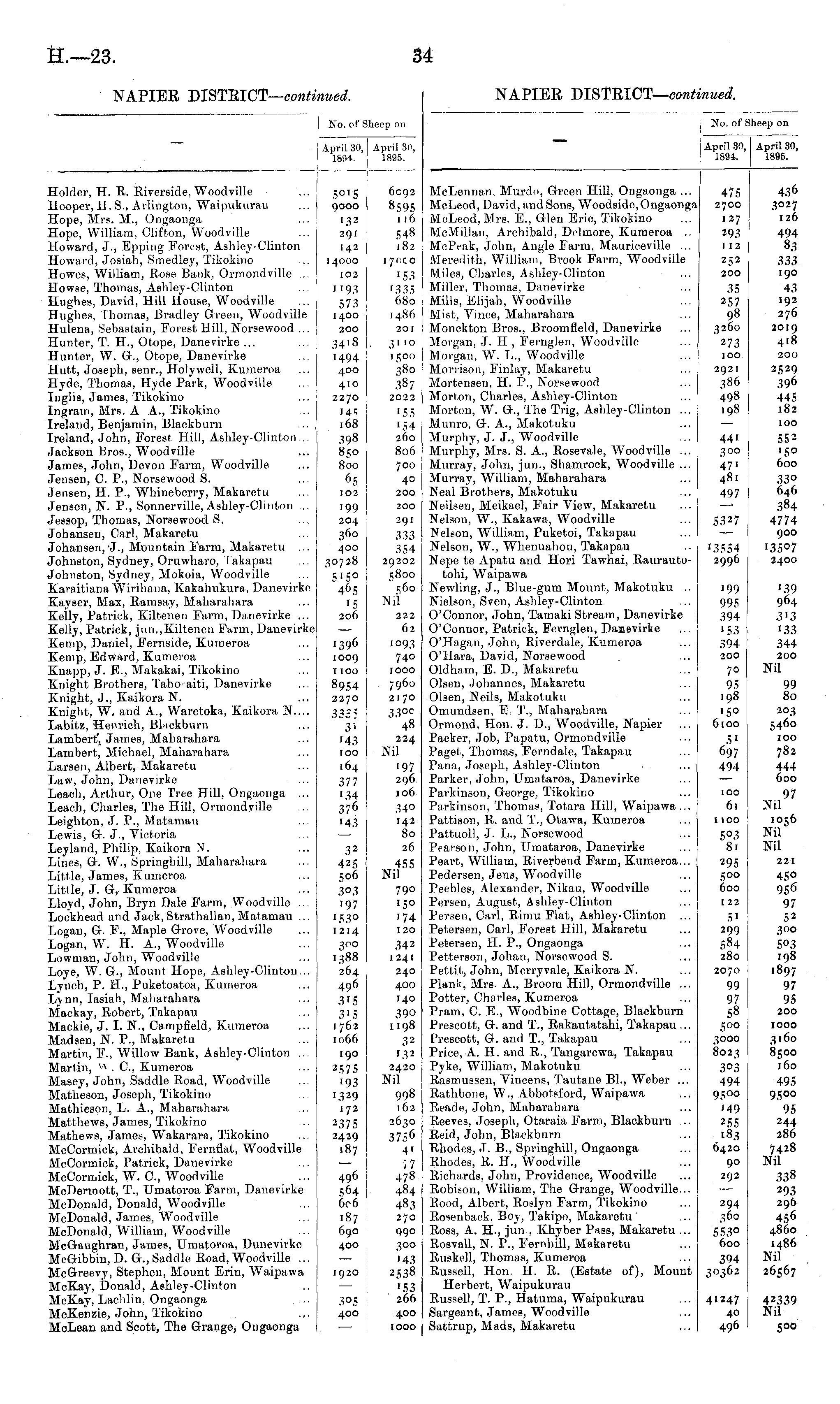No. of Sheep on April 30, April 30, 1894. 1895. McLennan, Murdo, Green Hill, Ongaonga ... McLeod, David, and Sons, Woodside, Ongaonga McLeod, Mrs. E., Glen Erie, Tikokino McMillan, Archibald, Delmore, Kumeroa ... McPeak, John, Angle Farm, Maurieeville ... Meredith, William, Brook Farm, Woodville Miles, Charles, Ashley-Clinton Miller, Thomas, Danevirke Mills, Elijah, Woodville Mist, Vince, Maharahara Monckton Bros., Broomfleld, Danevirke Morgan, J. H , Fernglen, Woodville Morgan, W. L., Woodville Morrison, Finlay, Makaretu Mortensen, H. P., Norsewood Morton, Charles, Ashley-Clinton Morton, W. G., The Trig, Ashley-Clinton ... Munro, G. A., Makotuku Murphy, J. J., Woodville Murphy, Mrs. S. A., Rosevale, Woodville ... Murray, John, jun., Shamrock, Woodville ... Murray, William, Maharahara Neal Brothers, Makotuku Neilsen, Meikael, Fair View, Makaretu Nelson, W., Kakawa, Woodville Nelson, William, Puketoi, Takapau Nelson, W., Whenuabou, Takapau Nepe te Apatu and Hori Tawhai, Raurautotohi, Waipawa Newling, J., Blue-gum Mount, Makotuku ... Nielson, Sven, Ash ley-Clin ton O'Connor, John, Tamaki Stream, Danevirke O'Connor, Patrick, Fernglen, Danevirke O'Hagan, John, Riverdale, Kumeroa O'Hara, David, Norsewood Oldham, E. D., Makaretu Olsen, Johannes, Makaretu Olsen, Neils, Makotuku Omundsen, _, T\, Maharahara Ormond, Hon. J. D., Woodville, Napier Packer, Job, Papatu, Ormondville Paget, Thomas, Ferndale, Takapau Pana, Joseph, Ashley-Clinton Parker, John, Umataroa, Danevirke Parkinson, George, Tikokino Parkinson, Thomas, Totara Hill, Waipawa ... Pattison, R. and T., Otawa, Kumeroa Pattuoll, J. L., Norsewood Pearson, John, Umataroa, Danevirke Peart, William, Riverbend Farm, Kumeroa... Pedersen, Jens, Woodville Peebles, Alexander, Nikau, Woodville Persen, August, Ashley-Clinton Persen, Carl, Rimu Flat, Ashley-Clinton ... Petersen, Carl, Forest Hill, Makaretu Petersen, H. P., Ongaonga Petterson, Johan, Norsewood S. Pettit, John, Merry vale, Kaikora N. Plank, Mrs. A., Broom Hill, Ormondville ... Potter, Charles, Kumeroa Pram, C. E., Woodbine Cottage, Blackburn Prescott, G. and T., Rakautatahi, Takapau ... Prescott, G. and T., Takapau Price, A. H. and R., Tangarewa, Takapau Pyke, William, Makotuku Rasmussen, Vincens, Tautane Bl., Weber ... Rathbone, W., Abbotsford, Waipawa Reade, John, Maharahara Reeves, Joseph, Otaraia Farm, Blackburn .. Reid, John, Blackburn Rhodes, J. B., Springhill, Ongaonga Rhodes, R. H., Woodville Richards, John, Providence, Woodville Robison, William, The Grange, Woodville... Rood, Albert, Roslyn Farm, Tikokino Rosenback, Boy, Takipo, Makaretu ... Ross, A. H, jun , Khyber Pass, Makaretu ... Rosvall, N. P., Fernhill, Makaretu Ruskell, Thomas, Kumeroa Russell, Hon. H. R. (Estate of), Mount Herbert, Waipukurau Russell, T. P., Hatuma, Waipukurau Sargeant, James, Woodville Sattrup, Mads, Makaretu 475 2700 127 293 112 252 200 35 257 98 3260 273 100 436 302 7 126 494 8.3 333 190 43 192 276 2019 4.8 200 2529 396 445 182 2921 386 498 198 100 44' 300 47' 481 497 552 '5° 600 5327 330 646 384 4774 900 13507 2400 '3554 2996 '99 995 394 '53 394 200 7° 95 .98 '5° 6100 '39 964 3'3 '33 344 200 Nil 99 80 203 546o 100 782 444 600 5' 697 494 100 61 97 Nil I IOO 50.3 81 1056 Nil Nil 295 500 600 221 I 22 5' 299 584 280 207O 99 97 58 500 3000 8023 30,3 494 9500 '49 255 183 6420 9° 292 45° 956 97 52 300 503 198 .897 97 95 200 1000 3160 8500 160 495 9500 95 244 286 7428 Nil 294 360 5530 600 338 293 296 456 4860 i486 Nil 26567 394 30362 41247 40 496 42.339 Nil 500