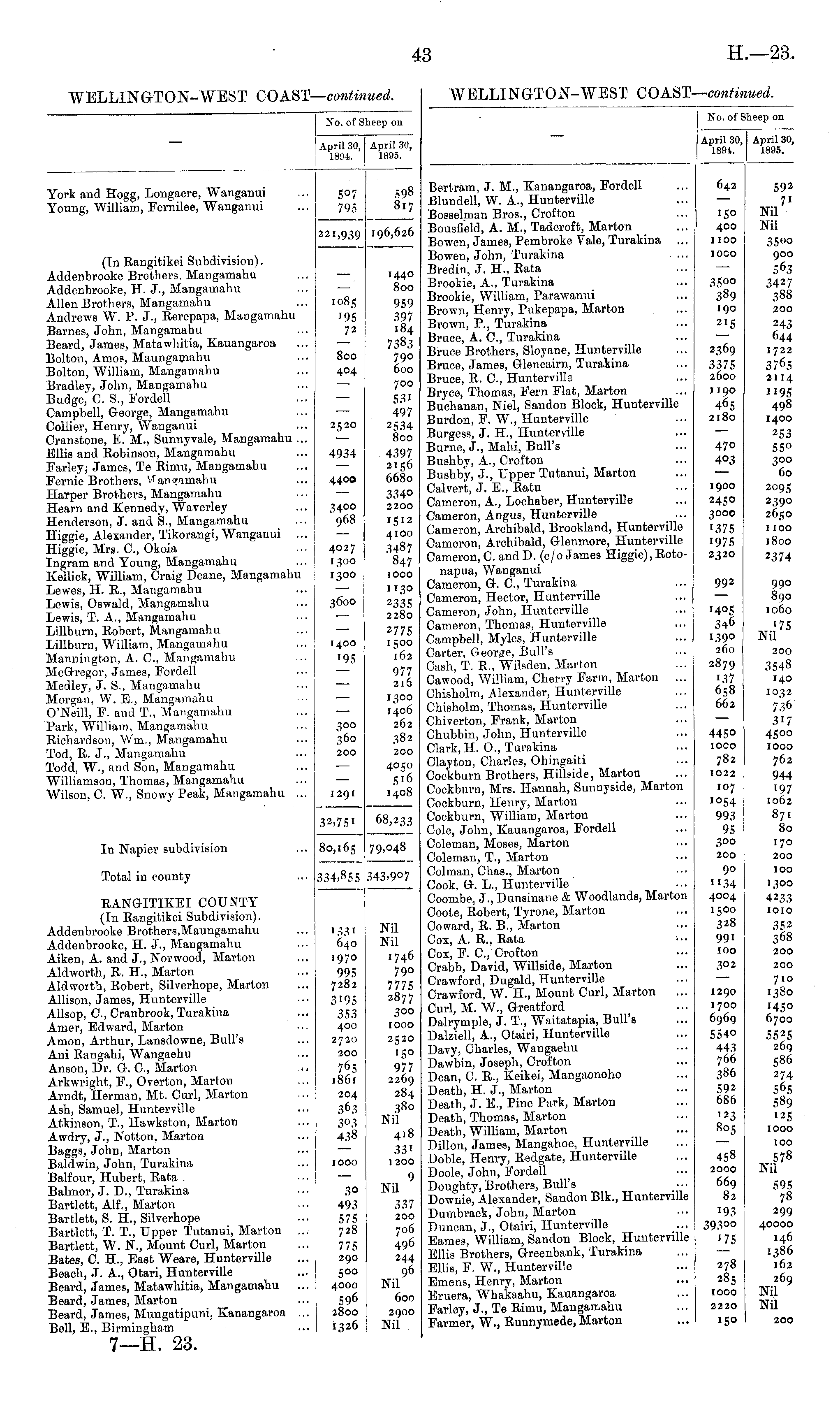 April 30, April 30, 1894. 1895. Bertram, J. M., Kanangaroa, Fordell Blundell, W. A., Hunterville Bosselman Bros., Crofton Bousfield, A. M., Tadcroft, Marton Bowen, James, Pembroke Yale, Turakina ... Bowen, John, Turakina Bredin, J. H, Rata Brookie, A., Turakina Brookie, William, Parawanui Brown, Henry, Pukepapa, Marton Brown, P., Turakina Bruce, A. O, Turakina Bruce Brothers, Sloyane, Hunterville Bruce, James, Glencairn, Turakina Bruce, R. C, Hunterville Bryce, Thomas, Fern Flat, Marton Buchanan, Niel, Sandon Block, Hunterville Burdon, F. W., Hunterville Burgess, J. H, Hunterville Burne, J., Mahi, Bull's Bushby, A., Crofton Bushby, J., Upper Tutanui, Marton Calvert, J. E., Ratu Cameron, A., Lochaber, Hunterville Cameron, Angus, Hunterville Cameron, Archibald, Brookland, Hunterville Cameron, Archibald, Glenmore, Hunterville Cameron, C. andD. (c/o James Higgie),Rotonapua, Wanganui Cameron, G. C, Turakina _ Cameron, Hector, Hunterville Cameron, John, Hunterville Cameron, Thomas, Hunterville Campbell, Myles, Hunterville Carter, George, Bull's Cash, T. R., W T ilsden, Marton Cawood, William, Cherry Farm, Marton ... Chisholm, Alexander, Hunterville Chisholm, Thomas, Hunterville Chiverton, Frank, Marton Chubbin, John, Hunterville Clark, H. 0., Turakina Clayton, Charles, Ohingaiti Cockburn Brothers, Hillside, Marton Cockburn, Mrs. Hannah, Sunnyside, Marton Cockburn, Henry, Marton Cockburn, William, Marton Cole, John, Kauangaroa, Fordell Coleman, Moses, Marton Coleman, T., Marton Colman, Chas., Marton Cook, G. L., Hunterville Coombe, J., Dunsinane & Woodlands, Marton Coote, Robert, Tyrone, Marton Coward, R. B., Marton Cox, A. R., Rata Cox, F. C, Crofton Crabb, David, Willside, Marton Crawford, Dugald, Hunterville Crawford, W. H., Mount Curl, Marton Curl, M. W., Greatford Dalrymple, J. T., Waitatapia, Bull's Dalziell, A., Otairi, Hunterville Davy, Charles, Wangaehu Dawbin, Joseph, Crofton Dean, C. R., Keikei, Mangaonoho Death, H. J., Marton Death, J. E., Pine Park, Marton Death, Thomas, Marton Death, William, Marton Dillon, James, Mangahoe, Hunterville Doble, Henry, Redgate, Hunterville Doole, John, Fordell Doughty, Brothers, Bull's Downie, Alexander, Sandon Blk., Hunterville Dumbrack, John, Marton Duncan, J., Otairi, Hunterville Fames, William, Sandon Block, Hunterville Ellis Brothers, Greenbank, Turakina Ellis, F. W., Hunterville Emens, Henry, Marton Eruera, Whakaahu, Kauangaroa Farley, J., Te Rimu, Mangamahu Farmer, W., Runnymede, Marton 642 150 400 1100 IOCO 35°° 389 190 215 2369 3375 2600 1190 465 2180 47° 403 1900 2450 3000 ■375 1975 2320 992 1405 346 1390 260 2879 1.37 658 662 445° IOCO 782 1022 107 1054 993 95 300 200 90 "34 4004 1500 328 991 100 302 1290 1700 6969 5540 443 766 386 592 686 123 805 458 2000 669 82 '93 39300 175 278 285 IOOO 2220 150 592 7' Nil Nil 35"o 900 56.3 3427 388 200 243 644 1722 3765 2114 "95 498 1400 253 55° 300 60 2095 2.39° 2650 1100 1800 2.374 990 890 1060 '75 Nil 200 3548 140 1032 736 317 4500 IOOO 762 944 197 1062 871 80 170 200 IOO 1300 4233 IOIO 352 368 200 200 710 1380 1450 6700 5525 269 586 274 565 589 125 IOOO IOO 578 Nil 595 78 299 40000 146 1386 162 269 Nil Nil 200