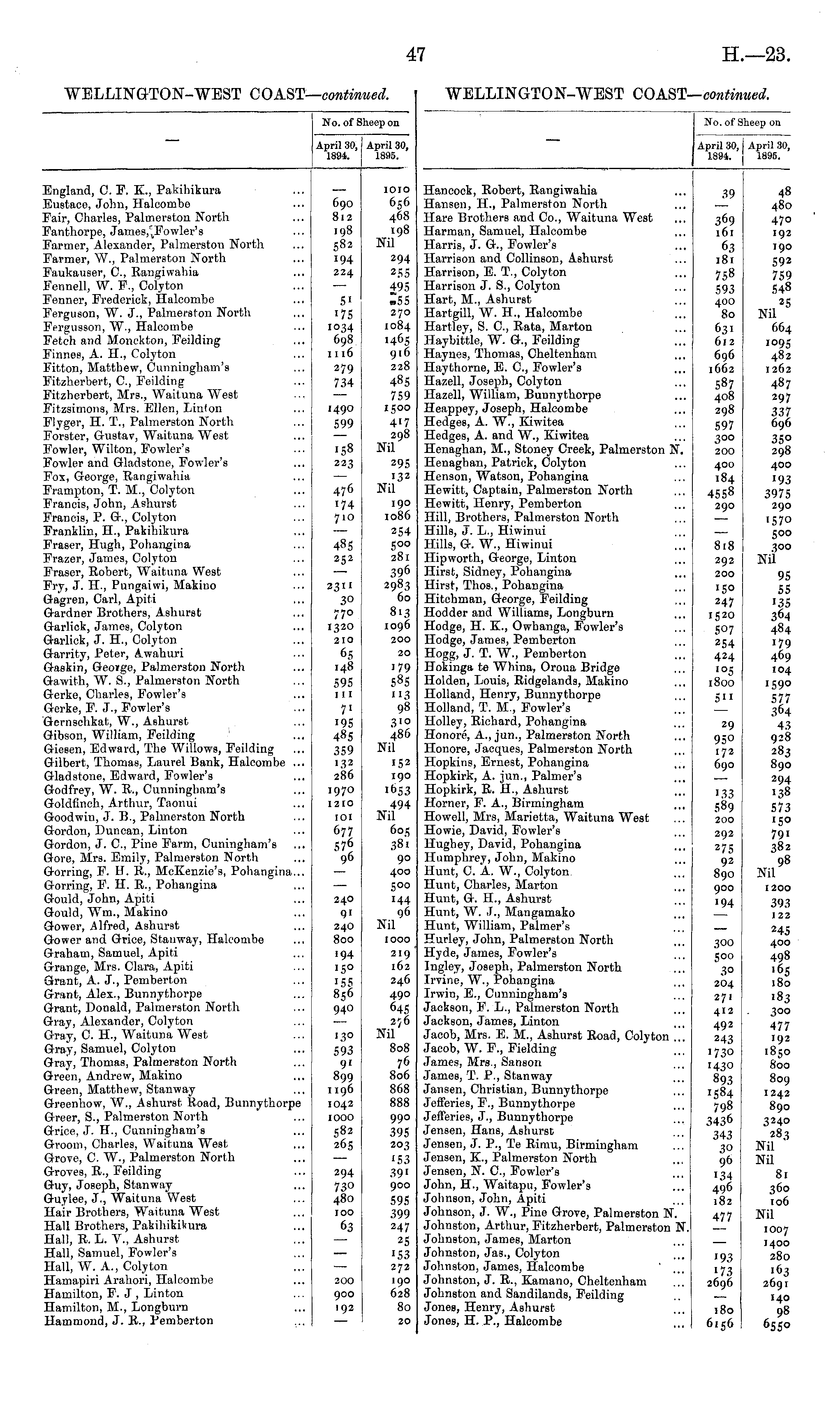 No. of Sheep on April 30, April* 1894. 1895. April 30, 1895. England, C. F. K., Pakihikura Eustace, John, Halcombe Fair, Charles, Palmerston North Fanthorpe, James/^Fowler's Farmer, Alexander, Palmerston North Farmer, W., Palmerston North Faukauser, C, Rangiwahia Fennell, W. _., Colyton Fenner, Frederick, Halcombe Ferguson, W. J., Palmerston North Fergusson, W., Halcombe Fetch and Monckton, Feilding Finnes, A. H., Colyton Fitton, Matthew, Cunningham's Fitzherbert, C, Feilding Fitzherbert, Mrs., Waituna West Fitzsimons, Mrs. Ellen, Linton Flyger, H. T., Palmerston North Forster, Gustav, Waituna West Fowler, Wilton, Fowler's Fowler and Gladstone, Fowler's Fox, George, Rangiwahia Franrpton, T. M., Colyton Francis, John, Ashurst Francis, P. G., Colyton Franklin, H., Pakihikura Fraser, Hugh, Pohangina Frazer, James, Colyton Fraser, Robert, Waituna West Fry, J. H., Pungaiwi, Makino Gagren, Carl, Apiti Gardner Brothers, Ashurst Garlick, James, Colyton Garlick, J. H, Colyton Garrity, Peter, Awahuri Gaskin, Geoige, Palmerston North Gawith, W. S., Palmerston North Gerke, Charles, Fowler's Gerke, F. J., Fowler's Gernschkat, W., Ashurst Gibson, William, Feilding Giesen, Edward, The Willows, Feilding Gilbert, Thomas, Laurel Bank, Halcombe ... Gladstone, Edward, Fowler's Godfrey, W. R., Cunningham's Goldfinch, Arthur, Taonui Goodwin, J. B., Palmerston North Gordon, Duncan, Linton Gordon, J. C, Pine Farm, Cuningham's Gore, Mrs. Emily, Palmerston North Gorring, F. H. R., McKenzie's, Pohangina... Gorring, F. H. R., Pohangina Gould, John, Apiti Gould, Wm., Makino Gower, Alfred, Ashurst Gower and Grice, Stanway, Halcombe Graham, Samuel, Apiti Grange, Mrs. Clara, Apiti Grant, A. J., Pemberton Grant, Alex., Bunnythorpe Grant, Donald, Palmerston North Gray, Alexander, Colyton Gray, C. H, Waituna West Gray, Samuel, Colyton Gray, Thomas, Palmerston North Green, Andrew, Makino Green, Matthew, Stanway Greenhow, W., Ashurst Road, Bunnythorpe Greer, S., Palmerston North Grice, J. H., Cunningham's Groom, Charles, Waituna West Grove, C. W., Palmerston North Groves, R., Feilding Guy, Joseph, Stanway Guylee, J., Waituna West Hair Brothers, Waituna West Hall Brothers, Pakihikikura Hall, R. L. V., Ashurst Hall, Samuel, Fowler's Hall, W. A., Colyton Hamapiri Arahori, Halcombe Hamilton, F. J , Linton Hamilton, M., Longburn Hammond, J. R., Pemberton 690 Si 2 .98 582 194 224 5' '75 1034 698 1116 279 734 1490 599 >S8 223 476 '74 710 485 252 2311 30 77o 1320 210 65 148 595 111 7' '95 485 359 132 286 1970 1210 101 677 576 96 IOIO 656 468 198 Nil 294 255 4. S .55 270 1084 '465 916 228 485 759 1500 4'7 298 Nil 295 132 Nil 190 1086 254 5°o 281 396 2983 60 813 1096 200 20 i79 58S "3 98 310 486 Nil 152 190 1653 494 Nil 605 ..'' 9° 400 500 144 96 Nil IOOO 240 9' 240 800 '94 '5° '55 856 940 219 162 246 490 645 2j6 Nil 808 76 806 868 888 99° 395 203 '53 39' 900 595 399 247 25 'S3 272 190 628 80 20 130 593 9' 899 1196 1042 IOOO 582 265 294 730 480 IOO 63 200 900 192