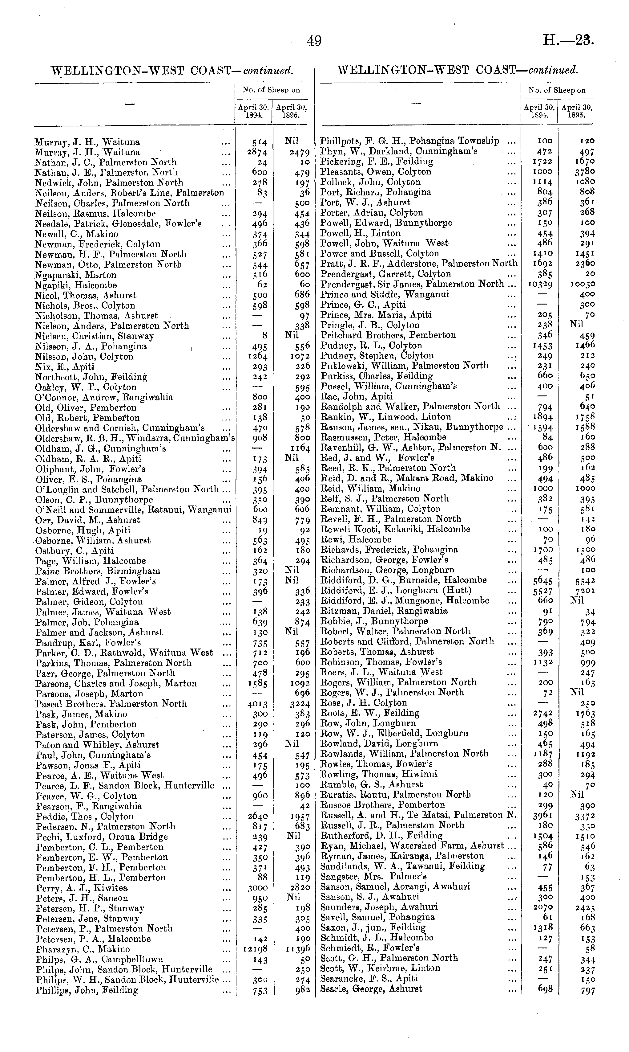 No. of Sheep on April 30, April 30, 1894. 1895. Murray, J. H, Waituna Murray, J. H, Waituna Nathan, J. C, Palmerston North Nathan, J. E., Palmerston North Nedwick, John, Palmerston North Neilson, Anders, Robert's Line, Palmerston Neilson, Charles, Palmerston North Neilson, Rasmus, Halcombe Nesdale, Patrick, Glenesdale, Fowler's Newall, C, Makino Newman, Frederick, Colyton Newman, H. F., Palmerston North Newman, Otto, Palmerston North Ngaparaki, Marton Ngapiki, Halcombe Nicol, Thomas, Ashurst Nichols, Bros., Colyton Nicholson, Thomas, Ashurst Nielson, Anders, Palmerston North Nielsen, Christian, Stanway Nilsson, J. A., Pohangina I Nilsson, John, Colyton Nix, E., Apiti Northcott, John, Feilding Oakley, W. T., Colyton O'Connor, Andrew, Rangiwahia Old, Oliver, Pemberton Old, Robert, Pemberton Oldershaw and Cornish, Cunningham's Oldershaw, R. B. H., Windarra, Cunningham's Oldham, J. G., Cunningham's Oldham, R. A. R., Apiti Oliphant, John, Fowler's Oliver, E. S., Pohangina O'Louglin and Satchell, Palmerston North ... Olson, C. P., Bunnythorpe O'Neill and Sommerville, Ratanui, Wanganui Orr, David, M., Ashurst Osborne, Hugh, Apiti Osborne, William, Ashurst Ostbury, C, Apiti Page, William, Halcombe Paine Brothers, Birmingham Palmer, Alfred J., FVwler's Palmer, Edward, Fowler's Palmer, Gideon, Colyton Palmer, James, Waituna West Palmer, Job, Pohangina Palmer and Jackson, Ashurst Pandrup, Karl, Fowler's Parker, C. D., Rathwold, Waituna West ... Parkins, Thomas, Palmerston North Parr, George, Palmerston North Parsons, Charles and Joseph, Marton Parsons, Joseph, Marton Pascal Brothers, Palmerston North Pask, James, Makino Pask, John, Pemberton Paterson, James, Colyton Paton and Whibley, Ashurst Paul, John, Cunningham's Pawson, Jonas F., Apiti Pearce, A. E., Waituna West Pearce, L. F., Sandon Block, Hunterville ... Pearce, W. G-, Colyton Pearson, F., Rangiwahia Peddie, Thos., Colyton Pedersen, N, Palmerston North Peehi, Luxford, Oroua Bridge Pemberton, C. L., Pemberton Pemberton, E. W., Pemberton Pemberton, F. H, Pemberton Pemberton, H. L., Pemberton Perry, A. J., Kiwitea Peters, J. IL, Sanson Petersen, H. P., Stanway Petersen, Jens, Stanway Petersen, P., Palmerston North Petersen, P. A., Halcombe Pbarazyn, C, Makino Philps, G. A., Campbelltown Philps, John, Sandon Block, Hunterville ... Philips, W. H, Sandon Block, Hunterville ... Phillips, John, F_ilding S'4 2874 24 600 278 83 294 496 374 366 527 544 5'6 62 500 598 8 495 1264 293 242 800 281 138 470 908 '73 394 'S6 395 35° 600 849 '9 563 162 ..4 320 '73 396 Nil 2479 10 479 197 36 500 454 436 344 598 581 657 600 60 686 598 97 338 Nil 556 1072 226 292 595 400 190 50 578 800 1164 Nil 585 406 400 390 606 779 92 495 180 294 Nil Nil '38 6.39 130 735 712 700 478 1585 336 233 242 874 Nil 557 196 600 295 1092 696 3224 383 296 120 Nil 4°'3 300 290 "9 296 454 '75 496 960 547 195 573 IOO 896 42 1957 683 Nil 39° 396 493 "9 2820 Nil 2640 8'7 2 39 427 35° 371 88 3000 95° 285 335 198 305 400 190 11396 5° 250 274 982 142 12198 '43 300 753