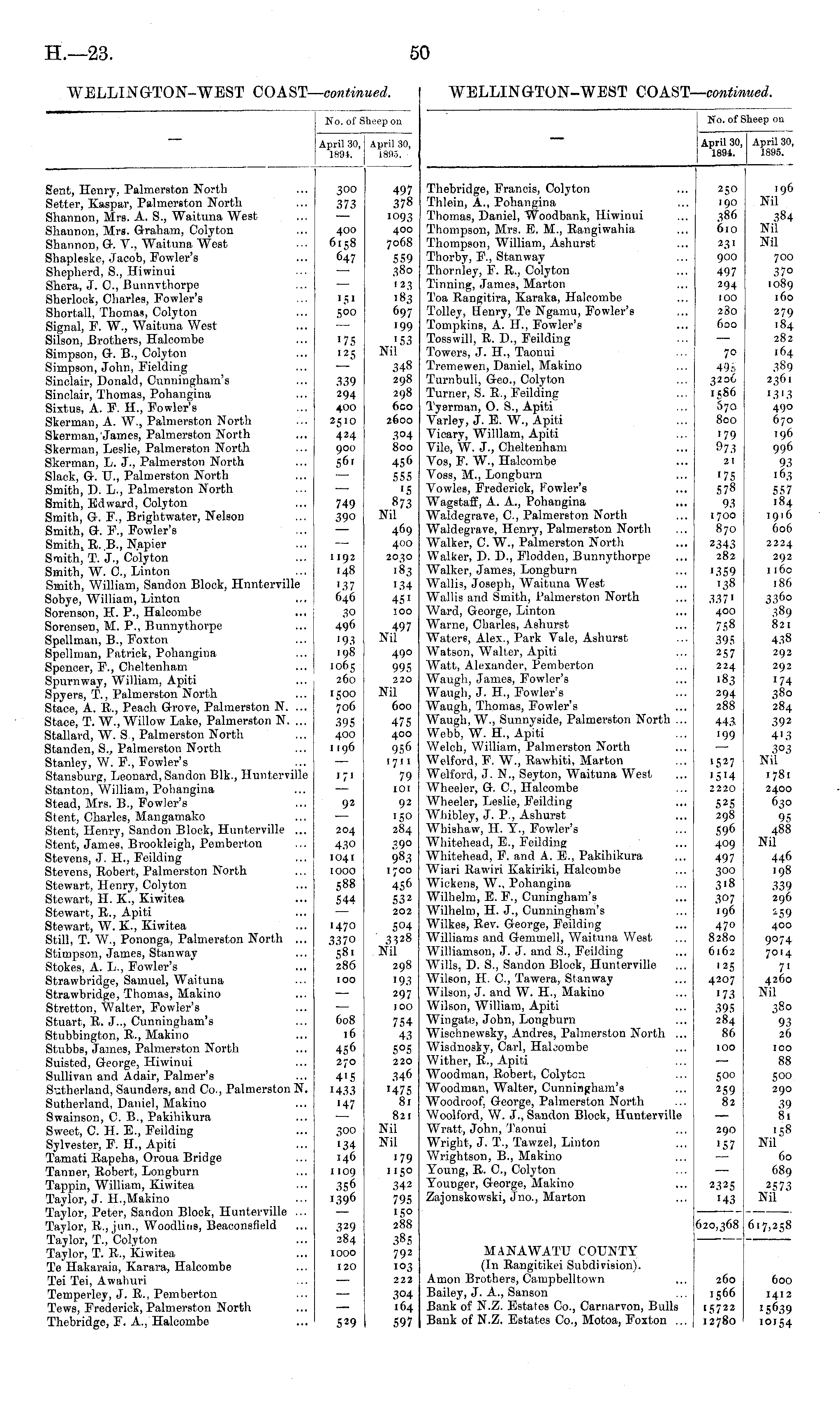 No. of Sheep on April 30, April 30, 1894. 1895. Thebridge, Francis, Colyton Thlein, A., Pohangina Thomas, Daniel, Woodbank, Hiwinui Thompson, Mrs. E. M., Rangiwahia Thompson, William, Ashurst Thorby, F., Stanway Thornley, 1. R., Colyton Tinning, James, Marton Toa Rangitira, Karaka, Halcombe Tolley, Henry, Te Ngamu, Fowler's Tompkins, A. H., Fowler's Tosswill, R. D., Feilding Towers, J. H., Taonui Tremewen, Daniel, Makino Turnbull, Geo., Colyton Turner, S. R., Feilding Tyerman, O. S., Apiti Varley, J. E. W., Apiti Vicary, William, Apiti Vile, W. J., Cheltenham Vos, F. W., Halcombe Voss, M., Longburn Vowles, Frederick, Fowler's Wagstaff, A. A., Pohangina Waldegrave, C, Palmerston North Waldegrave, Henry, Palmerston North Walker, C. W., Palmerston North Walker, D. D., Flodden, Bunnythorpe Walker, James, Longburn Wallis, Joseph, Waituna West Wallis and Smith, Palmerston North Ward, George, Linton Warne, Charles, Ashurst Waters, Alex., Park Vale, Ashurst Watson, Walter, Apiti Watt, Alexander, Pemberton Waugh, James, Fowler's Waugh, J. H., Fowler's Waugh, Thomas, Fowler's Waugh, W., Sunnyside, Palmerston North ... Webb, W. H, Apiti Welch, William, Palmerston North Welford, F. W., Ravvhiti, Marton Welford, J. N., Seyton, Waituna West Wheeler, G. C, Halcombe Wheeler, Leslie, Feilding Whibley, J. P., Ashurst Whishaw, H. Y., Fowler's Whitehead, E., Feilding Whitehead, F. and A. E., Pakihikura Wiari Rawiri Kakiriki, Halcombe Wickens, W., Pohangina Wilhelm, E. F., Cuningham's Wilhelm, H. J., Cunningham's Wilkes, Rev. George, Feilding Williams and Gemmell, Waituna West Williamson, J. J. and S., Feilding Wills, D. S., Sandon Block, Hunterville Wilson, H. C, Tawera, Stanway Wilson, J. and W. H, Makino Wilson, William, Apiti Wingate, John, Longburn Wischnewsky, Andres, Palmerston North ... Wisdnosky, Carl, Hafoombe Wither, R., Apiti Woodman, Robert, Colyton Woodman, Walter, Cunningham's Woodroof, George, Palmerston North Woolford, W. J., Sandon Block, Hunterville Wratt, John, Taonui Wright, J. T., Tawzel, Linton Wrightson, B., Makino Young, R. O, Colyton Younger, George, Makino Zajonskowski, Jno., Marton 250 190 386 6io 231 900 497 294 100 280 600 70 49s 3206 1 «86 5 7 o 800 179 973 21 175 578 93 1700 870 2343 282 1359 138 3371 400 758 395 257 224 183 294 288 196 Nil 384 Nil Nil 700 370 1089 160 279 184 282 164 389 2361 1.3'3 490 670 196 996 93 16,3 557 184 1916 606 2224 292 1160 186 336o 389 821 438 292 292 '74 380 284 392 4'3 303 Nil 1781 2400 630 95 488 Nil 443 199 1527 1514 2220 525 298 596 409 497 300 3'8 307 .96 470 8280 6162 446 198 339 296 .9 400 9074 7014 7' 4260 Nil 380 93 26 100 88 125 4207 173 395 284 86 100 500 259 82 500 290 39 81 158 Nil 60 689 2573 Nil 290 '57 2325 '43 620,368 MANAWATU COUNTY (In Rangitikei Subdivision). Amon Brothers, Campbelltown Bailey, J. A., Sanson Bank of N.Z. Estates Co., Carnarvon, Bulls Bank of N.Z. Estates Co., Motoa, Foxton ... 617,258 260 '566 15722 12780 600 1412 15639 10154