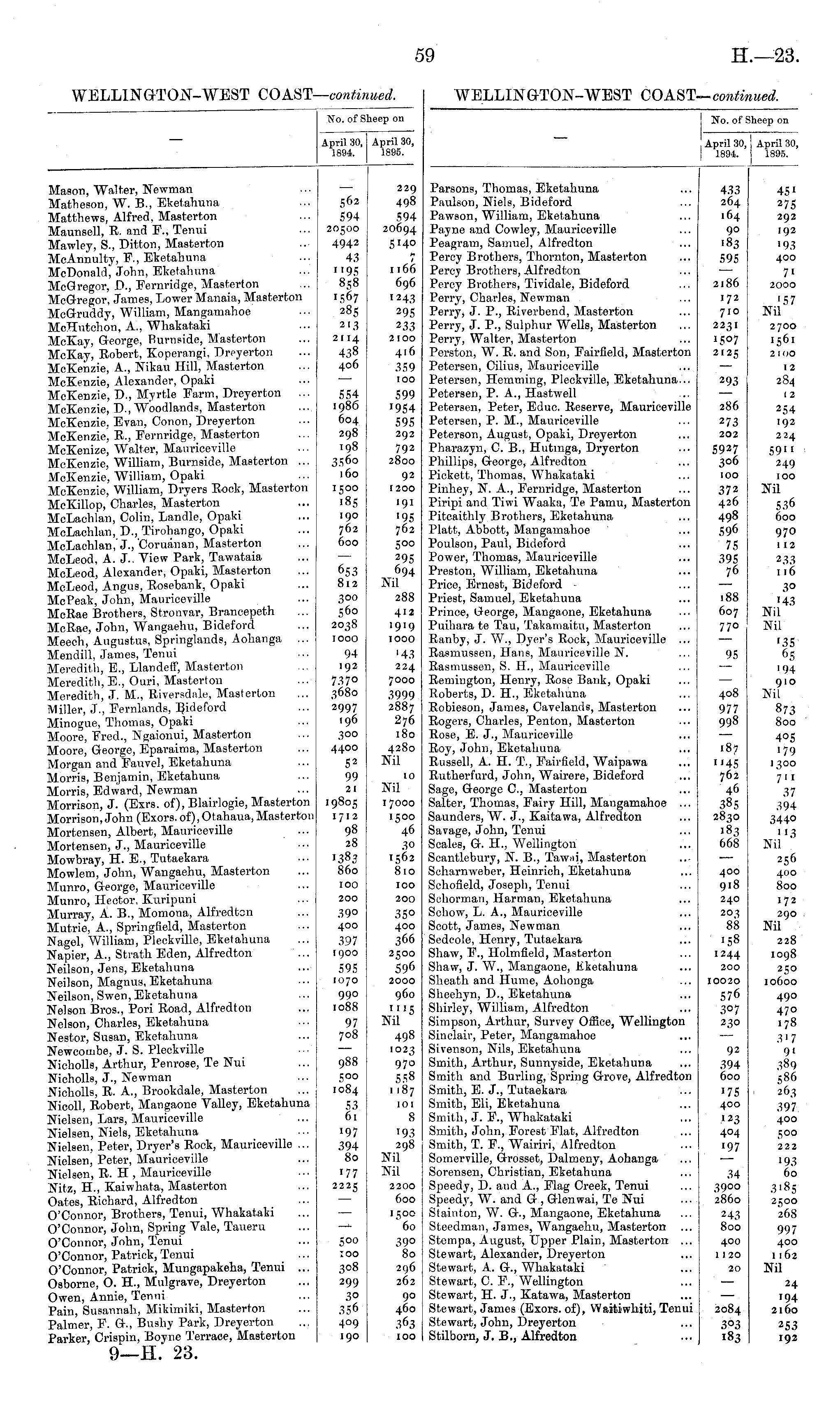 No. of Sheep on April 30, April 30, 1894. 1896. Mason, Walter, Newman Matheson, W. B., Eketahuna Matthews, Alfred, Masterton Maunsell, R. and F., Tenui Mawley, S., Ditton, Masterton McAnnulty, F., Eketahuna McDonald, John, Eketahuna McGregor, D., Fernridge, MaBlerton McGregor, James, Lower Manaia, Masterton McGruddy, William, Mangamahoe McHutchon, A., Whakataki McKay, George, Burnside, Masterton McKay, Robert, Koperangi, Dreyerton McKenzie, A., Nikau Hill, Masterton McKenzie, Alexander, Opaki McKenzie, D., Myrtle Farm, Dreyerton ... McKenzie, D., Woodlands, Masterton McKenzie, Evan, Conon, Dreyerton McKenzie, R., Fernridge, Masterton McKenize, Walter, Mauriceville McKenzie, William, Burnside, Masterton ... McKenzie, William, Opaki McKenzie, William, Dryers Rock, Masterton McKillop, Charles, Masterton McLachlan, Colin, Landle, Opaki McLachlan, D., Tirohango, Opaki McLachlan, J., Coruanan, Masterton McLeod, A. J.. View Park, Tawataia McLeod, Alexander, Opaki, Masterton McLeod, Angus, Rosebank, Opaki McPeak, John, Mauriceville McRae Brothers, Stronvar, Brancepeth McRae, John, Wangaehu, Bideford Meech, Augustus, Springlands, Aohanga ... Mendill, James, Tenui Meredith, E., Llandeff, Masterton Meredith, E., Ouri, Masterton Meredith, J. M., Riversdale, Masterton Miller, J., Fernlands, Bideford Minoguc, Thomas, Opaki Moore, Fred., Ngaionui, Masterton Moore, George, Eparaima, Masterton Morgan and Fauvel, Eketahuna Morris, Benjamin, Eketahuna Morris, Edward, Newman Morrison, J. (Exrs. of), Blairlogie, Masterton Morrison, John (Exors.of),Otahaua, Masterton Mortensen, Albert, Mauriceville Mortensen, J., Mauriceville Mowbray, H. E., Tutaekara Mowlem, John, Wangaehu, Masterton Munro, George, Mauriceville Munro, Hector, Kuripuni Murray, A. B., Momona, Alfredton Mutrie, A., Springfield, Masterton Nagel, William, Pleckville, Eketahuna Napier, A., Strath Eden, Alfredton Neilson, Jens, Eketahuna Neilson, Magnus, Eketahuna Neilson, Swen, Eketahuna Nelson Bros., Pori Road, Alfredton Nelson, Charles, Eketahuna Nestor, Susan, Eketahuna Newcombe, J. S. Pleckville Nicholls, Arthur, Penrose, Te Nui Nicholls, J-, Newman Nicholls, R. A., Brookdale, Masterton Nieoll, Robert, Mangaone Valley, Eketahuna Nielsen, Lars, Mauriceville Nielsen, Niels, Eketahuna Nielsen, Peter, Dryer's Rock, Mauriceville ... Nielsen, Peter, Mauriceville Nielsen, R. H , Mauriceville Nitz, H, Kaiwhata, Masterton Oates, Richard, Alfredton O'Connor, Brothers, Tenui, Whakataki O'Connor, John, Spring Vale, Taueru O'Connor, John, Tenui O'Connor, Patrick, Tenui O'Connor, Patrick, Mungapakeha, Tenui ... Osborne, O. H, Mulgrave, Dreyerton Owen, Annie, Tenui Pain, Susannah, Mikimiki, Masterton Palmer, F. G., Bushy Park, Dreyerton Parker, Crispin, Boyne Terrace, Masterton 562 594 20500 4942 43 "95 858 'S67 285 213 2114 438 406 554 1986 604 298 198 356o 160 1500 185 190 762 600 653 812 300 560 2038 IOOO 94 192 737° 3680 2997 196 3°o 4400 52 99 21 19805 1712 98 28 1383 860 100 200 229 498 594 20694 5'4o 1166 696 1243 295 23.3 2100 416 359 100 599 '954 595 292 792 2800 92 1200 191 '95 762 500 295 694 Nil 288 412 1919 1000 '43 224 7000 3999 2887 276 180 4280 Nil 10 Nil 17000 1500 46 30 1562 810 100 39° 400 397 1900 595 1070 990 1088 97 708 988 500 1084 53 61 '97 394 80 177 2225 200 350 400 366 2500 596 2000 960 1115 Nil 498 1023 970 558 1187 101 8 '93 298 Nil Nil 2200 600 1500 '60 500 100 308 299 30 356 409 190 39° 80 296 262 90 460 363 100