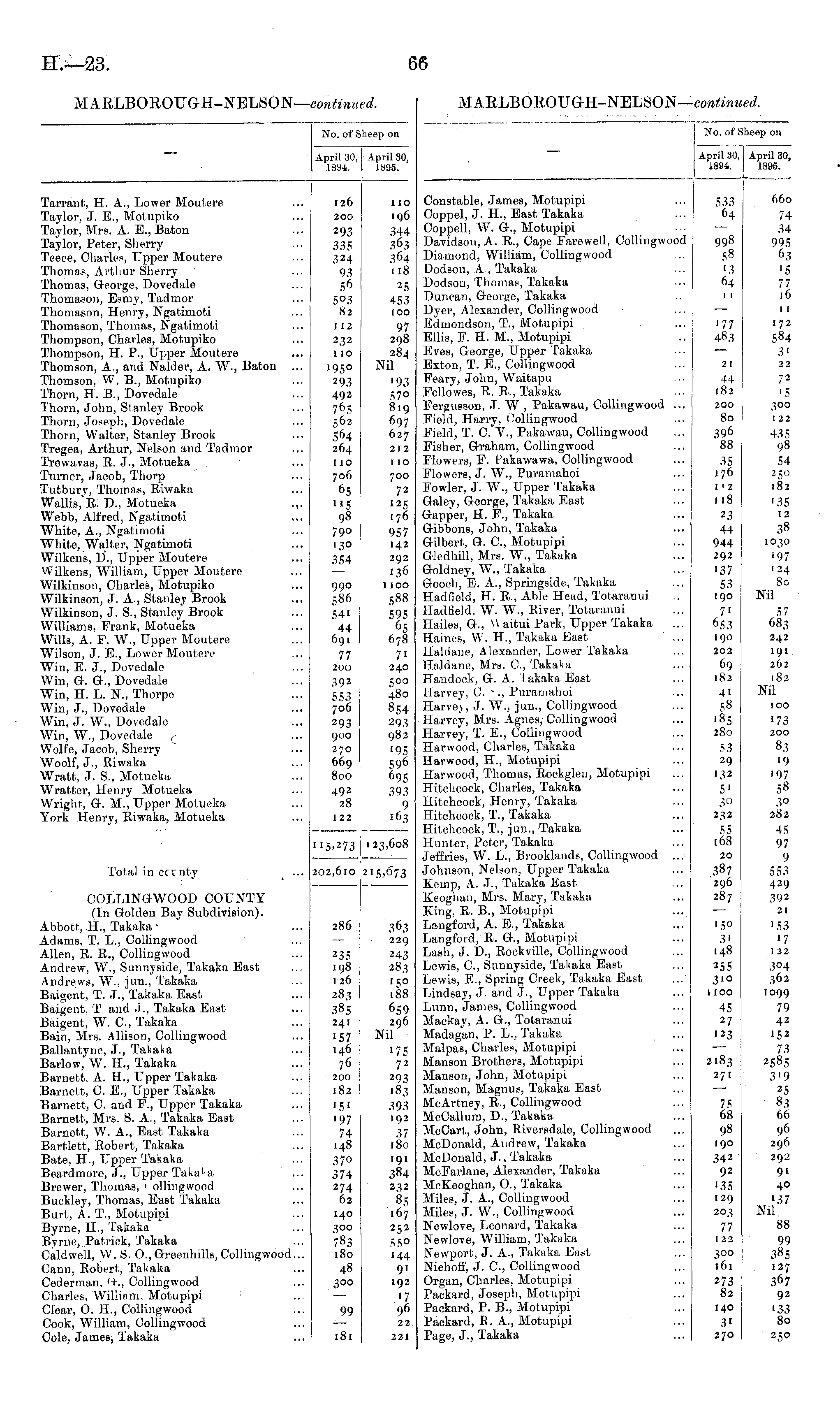 No. of Sheep on April 30, April* 1894. 1895. April 30, 1895. Constable, JameB, Motupipi Coppel, J. H, East Takaka Coppell, W. G., Motupipi Davidson, A. R., Cape Farewell, Collingwood Diamond, William, Collingwood Dodson, A , Takaka Dodson, Thomas, Takaka Duncan, George, Takaka Dyer, Alexander, Collingwood Edinondson, T., Motupipi Ellis, F. H. M., Motupipi Eves, George, Upper Takaka Exton, T. E., Collingwood Feary, John, Waitapu Fellowes, R. R., Takaka Fergusson, J. W , Pakawau, Collingwood ... Field, Harry, Collingwood Field, T. C. V., Pakawau, Collingwood Fisher, Graham, Collingwood Flowers, E. Pakavvawa, Collingwood Flowers, J. W., Puramahoi Fowler, J. W., Upper Takaka Galey, George, Takaka East Gapper, H. F., Takaka Gibbons, John, Takaka Gilbert, G. C, Motupipi Gledhill, Mrs. W., Takaka Goldney, W., Takaka Gooch, E. A., Springside, Takaka Hadfield, H. R., Able Head, Totaranui Uadfield, W. W., River, Totaranui Hailes, G., W aitui Park, Upper Takaka Haines, W. H., Takaka East Haldane, Alexander, Lower Takaka Holdane, Mrs. C, Taka .1 Handock, G. A. I akaka East Harvey, C. -., Puramahoi Harvej, J. W., jun., Collingwood Harvey, Mrs. Agnes, Collingwood Harvey, T. E., Collingwood Harwood, Charles, Takaka Harwood, H, Motupipi Harwood, Thomas, Rockglen, Motupipi Hitchcock, Charles, Takaka Hitchcock, Henry, Takaka Hitchcock, T\, Takaka Hitchcock, T., jun., Takaka Hunter, Peter, Takaka Jeffries, W. L., Brooklands, Collingwood ... Johnson, Nelson, Upper Takaka Kemp, A. J., Takaka East Keoghan, Mrs. Mary, Takaka King, R. B., Motupipi Langford, A. E., Takaka Langford, R. G., Motupipi Lash, J. D., Rockville, Collingwood Lewis, C, Sunnyside, Takaka East Lewis, E., Spring Creek, Takaka East Lindsay, J. and J., Upper Takaka Lunn, James, Collingwood Mackay, A. G., Totaranui Madagan, P. L., Takaka Malpas, Charles, Motupipi Manson Brothers, Motupipi Manson, John, Motupipi Manson, Magnus, Takaka East McArtney, R., Collingwood McCallum, D., Takaka McCart, John, Riversdale, Collingwood McDonald, Andrew, Takaka McDonald, J., Takaka McFarlane, Alexander, Takaka McKeoghan, O., Takaka Miles, J. A., Collingwood Miles, J. W., Collingwood Newlove, Leonard, Takaka Newlove, William, Takaka Newport, J. A., Takaka East Niehoff, J. C, Collingwood Organ, Charles, Motupipi Packard, Joseph, Motupipi Packard, P. B., Motupipi Packard, R. A., Motupipi Page, J., Takaka 533 64 660 74 34 995 63 '5 77 16 11 99 8 58 '3 64 i i '77 4«3 172 584 3' 22 21 44 182 72 '5 300 1 22 200 80 396 88 435 98 54 250 182 35 ■ 76 1 '2 118 2.3 44 944 292 '37 53 190 7' 6.53 190 202 69 182 '35 12 38 1030 '97 124 80 Nil 57 683 242 191 262 182 Nil 4' 58 '85 280 53 29 '.. 5' 30 232 55 168 20 .387 296 287 100 '73 200 83 '9 '97 58 3° 282 45 97 9 553 429 392 21 '50 3' 148 255 3'o 1100 '53 '7 122 45 27 123 218.3 271 75 68 98 190 342 92 '35 129 203 77 122 304 362 1099 79 42 '52 73 2585 3'9 25 8.3 66 96 296 292 9' 40 '37 Nil 88 300 161 273 82 99 38S 127 367 92 '33 80 140 3' 270 250
