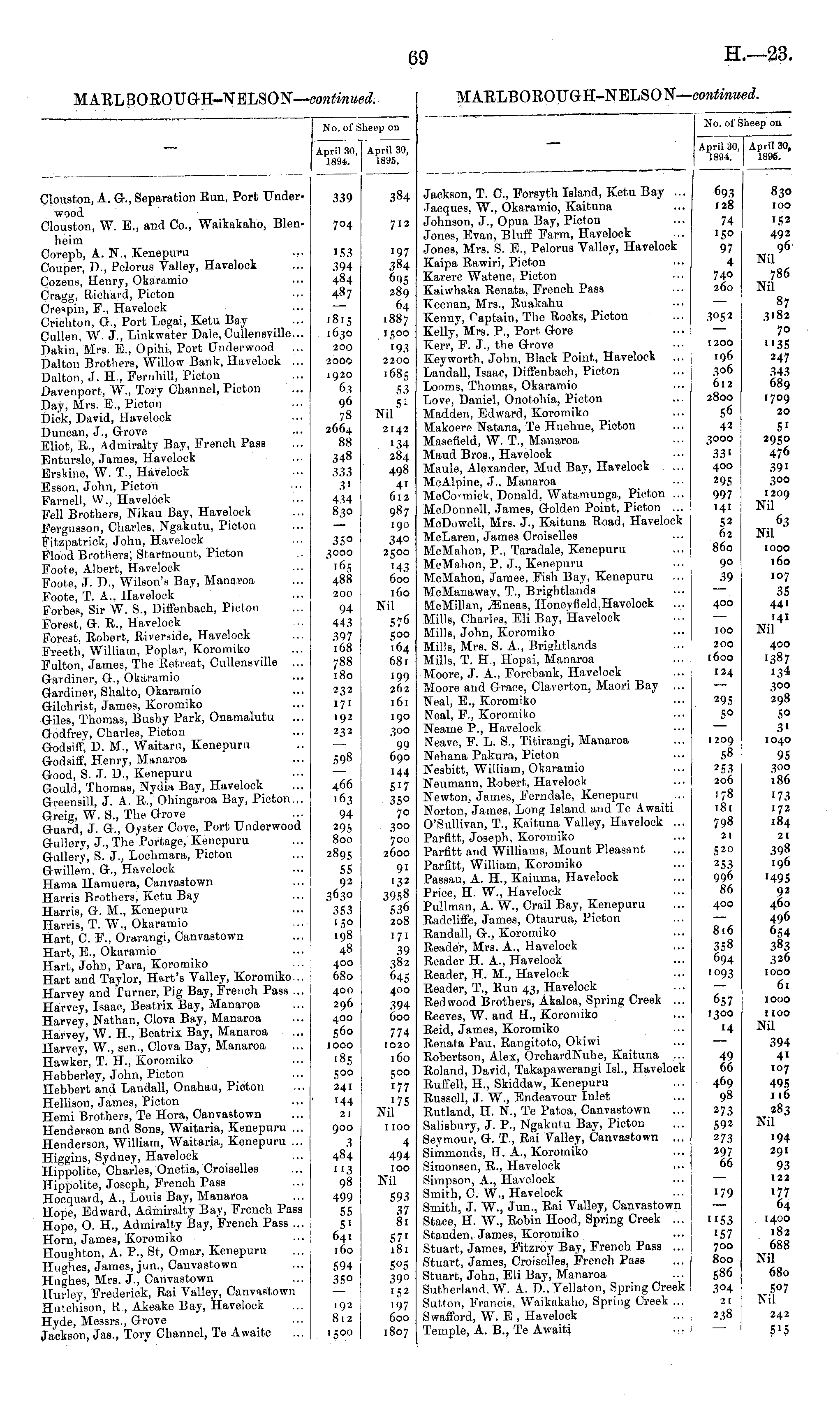 No. of Sheep on April 30, 1894. April 30, 1895. Clouston, A. G., Separation Run, Port Underwood Clouston, W. E., and Co., Waikakaho, Blenheim Corepb, A. N., Kenepuru Couper, D., Pelorus Valley, Havelock Cozens, Henry, Okaramio Cragg, Richard, Picton Crespin, F., Havelock Crichton, G., Port Legai, Ketu Bay Cullen, W. J., Linkwater Dale, Cullensville... Dakin, Mrs. E., Opihi, Port Underwood ... Dalton Brothers, Willow Bank, Havelock ... Dalton, J. H, Fernhill, Picton Davenport, W., Tory Channel, Picton Day, Mrs. E., Picton Dick, David, Havelock Duncan, J., Grove Eliot, R., Admiralty Bay, French Pass Entursle, James, Havelock Erskine, W. T., Havelock Esson, John, Picton Farnell, W., Havelock Fell Brothers, Nikau Bay, Havelock Fergusson, Charles, Ngakutu, Picton Fitzpatrick, John, Havelock Flood Brothers; Starlnount, Picton Foote, Albert, Havelock Foote, J. D., Wilson's Bay, Manaroa Foote, T. A., Havelock Forbes, Sir W. S., Diffenbach, Picton Forest, G. R., Havelock Forest, Robert, Riverside, Havelock Freeth, William, Poplar, Koromiko Fulton, James, The Retreat, Cullensville ... Gardiner, G., Okaramio Gardiner, Shalto, Okaramio Gilchrist, James, Koromiko Giles, Thomas, Bushy Park, Onamalutu ... Godfrey, Charles, Picton GodBiff, D. M., Waitaru, Kenepuru Godsiff, Henry, Manaroa Good, S. J. D., Kenepuru Gould, Thomas, Nydia Bay, Havelock Greensill, J. A. R., Obingaroa Bay, Picton... Greig, W. S., The Grove Guard, J. G., Oyster Cove, Port Underwood Gullery, J., The Portage, Kenepuru Gullery, S. J., Lochmara, Picton Gwillem, G., Havelock Hama Hamuera, Canvastown Harris Brothers, Ketu Bay Harris, G. M., Kenepuru Harris, T. W., Okaramio Hart, C. F., Orarangi, Canvastown Hart, E., Okaramio" Hart, John, Para, Koromiko Hart and Taylor, Hart's Valley, Koromiko... Harvey and Turner, Pig Bay, French Pass ... Harvey, Isaac, Beatrix Bay, Manaroa Harvey, Nathan, Clova Bay, Manaroa Harvey, W. H, Beatrix Bay, Manaroa Harvey, W., sen., Clova Bay, Manaroa Hawker, T. H, Koromiko Hebberley, John, Picton Hebbert and Landall, Onahau, Picton Hellison, James, Picton Hemi Brothers, Te Hora, Canvastown Henderson and Sons, Waitaria, Kenepuru ... Henderson, William, Waitaria, Kenepuru ... Higgins, Sydney, Havelock Hippolite, Charles, Onetia, Croiselles Hippolite, Joseph, French Pass Hocquard, A., Louis Bay, Manaroa Hope, Edward, Admiralty Bay, French Pass Hope, O. H., Admiralty Bay, French Pass ... Horn, James, Koromiko Houghton, A. P., St, Omar, Kenepuru Hughes, James, jun., Canvastown Hughes, Mrs. J., Canvastown Hurley, Frederick, Rai Valley, Canvastown Hutchison, R , Akeake Bay, Havelock Hyde, Messrs., Grove Jackson, Jas., Tory Channel, Te Awaite 339 384 7°4 7'2 .3 394 484 487 197 384 6q 5 289 64 1887 1500 '93 2200 .685 53 5 ; Nil 1815 1630 200 2000 1920 63 96 78 2664 88 348 333 3' 434 830 2142 '34 284 498 4' 612 987 190 340 2500 143 600 160 Nil 35° 3000 '65 488 200 94 44.3 397 168 788 180 576 500 164 681 2.32 171 192 232 199 262 161 598 466 163 94 295 800 2895 55 92 36,30 353 150 198 48 400 680 190 300 99 690 144 5'7 35° 7o 300 700 2600 9' 132 3958 536 208 171 39 382 645 400 394 600 774 1020 160 400 296 400 560 IOOO '8s 500 241 '44 21 900 5°o 177 '75 Nil 3 484 "3 98 499 55 5' 641 160 594 350 1100 4 494 100 Nil 593 37 81 57' 181 192 812 5 °5 39° '52 197 600 1807 1500