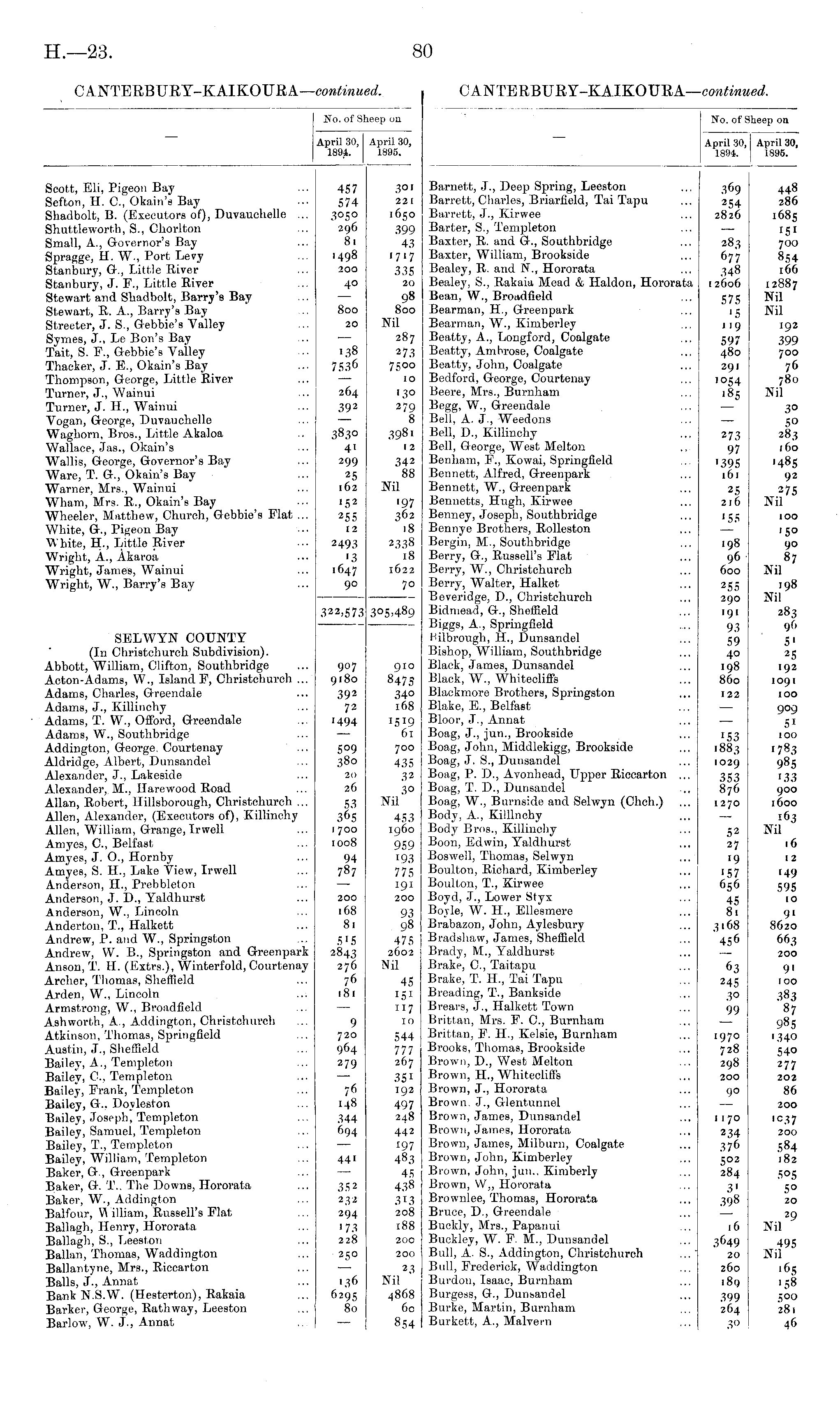 No. of Sheep on April 30, April 30, 1894. 1895. Scott, Eli, Pigeon Bay Sefton, H. G, Okain's Bay Shadbolt, B. (Executors of), Duvauchelle ... Shuttleworth, S., Chorlton Small, A., Governor's Bay Spragge, H. W., Port Levy Stanbury, G., Little River Stanbury, J. F., Little River Stewart and Shadbolt, Barry's Bay Stewart, R. A., Barry's Bay Streeter, J. S., Gebbie's Valley Symes, J., Le Bon's Bay Tait, S. F., Gebbie's Valley Thacker, J. E., Okain's Bay Thompson, George, Little River Turner, J., Wainui Turner, J. II., Wainui Vogan, George, Duvauchelle Waghorn, Bros., Little Akaloa Wallace, Jas., Okain's Wallis, George, Governor's Bay Ware, T. G., Okain's Bay Warner, Mrs., Wainui Wham, Mts. R., Okain's Bay Wheeler, Matthew, Church, Gebbie's Flat ... White, G., Pigeon Bay "White, H, Little River Wright, A., Akaroa Wright, James, Wainui Wright, W., Barry's Bay 457 574 3050 296 81 1498 200 40 800 20 '38 7536 264 392 30l 221 165O 399 4.3 1717 335 20 98 800 Nil 287 2 73 7500 10 130 279 8 398i 3830 4' 299 25 162 1 2 342 88 Nil '52 255 12 2493 '3 1647 90 '97 362 18 2338 18 1622 70 SELWYN COUNTY (In Christchurch Subdivision). Abbott, William, Clifton, Southbridge Acton-Adams, W., Island F, Christchurch ... Adams, Charles, Grecndale Adams, J., Killinchy Adams, T. W., Offord, Greendale Adams, W., Southbridge Addington, George. Courtenay Aldridge, Albert, Dunsandel Alexander, J., Lakeside Alexander, M., Harewood Road Allan, Robert, Hillsborough, Christchurch ... Allen, Alexander, (Executors of), Killinchy Allen, William, Grange, Irwell Amyes, G, Belfast Amyes, J. O., Hornby Amyes, S. H, Lake View, Irwell Anderson, II., Prebblcton Anderson, J. D., Yaldhurst Anderson, W., Lincoln Anderton, T., Halkett Andrew, P. and W., Springston Andrew, W. B., Springston and Greenpark Anson, T. H. (Extrs.), Winterfold, Courtenay Archer, Thomas, Sheffield Arden, W., Lincoln Armstrong, W., Broadfield Ashworth, A., Addington, Christchurch Atkinson, Thomas, Springfield Austin, J., Sheffield Bailey, A., Templeton Bailey, G, Templeton Bailey, Frank, Templeton Bailey, G., Doyleston Bailey, Joseph, Templeton Bailey, Samuel, Templeton Bailey, T., Templeton Bailey, William, Templeton Baker, G., Greenpark Baker, G. _.. The Downs, Hororata Baker, W., Addington Balfour, . illiam, Russell's Flat Ballagh, Henry, Hororata Ballagb, S., Leeston Ballan, Thomas, Waddington Ballantyne, Mrs., Riccarton Balls, J., Annat Bank N.S.W. (Heaterton), Rakaia Barker, George, Rath way, Leeston Barlow, W. J., Annat 322,573 305,489 907 9180 392 72 ■494 910 847S 34° 168 5°9 380 2(1 26 '5'9 61 700 435 .32 30 Nil 53 365 1700 1008 453 i960 9S9 '93 775 191 200 94 787 200 168 81 93 98 475 2602 Nil 5'5 2843 276 76 181 45 '5? 117 10 9 720 964 279 544 777 267 351 192 497 248 442 197 483 45 438 313 208 188 76 148 344 694 441 35 2 2,32 294 '73 228 250 200 200 136 6295 80 23 Nil 4868 60 854