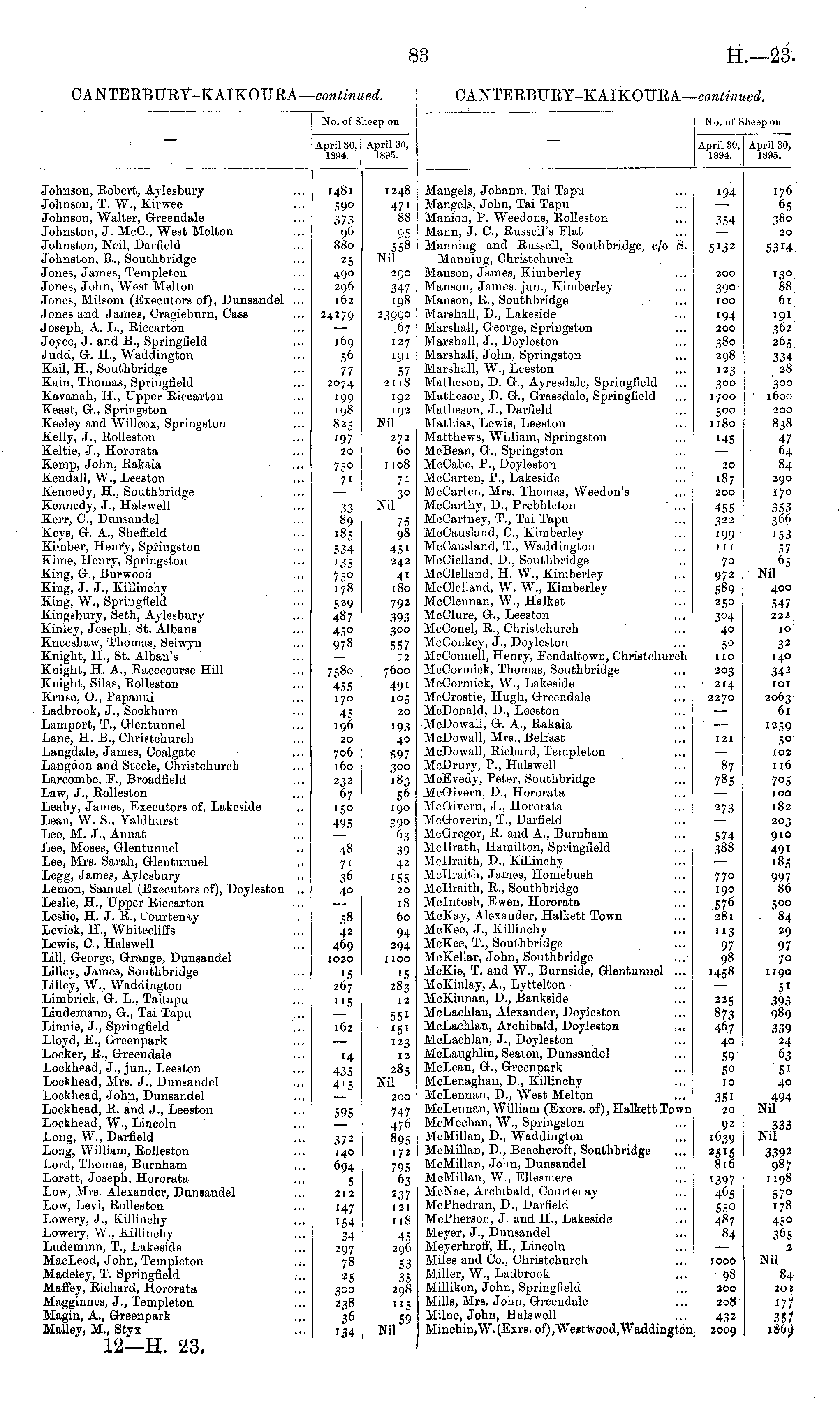 No. of-Sheep on April 30, April 30, 1894. 1895. Mangels, Johann, Tai Tapu Mangels, John, Tai Tapu Manion, P. Weedons, Rolleston Mann, J. C, Russell's Flat Manning and Russell, Southbridge, c/o S. Manning, Christchurch Manson, James, Kimberley Manson, James, jun., Kimberley Manson, R., Southbridge Marshall, D., Lakeside Marshall, George, Springston Marshall, J., Doyleston Marshall, John, Springston Marshall, W., Jjeeston Matheson, D. G., Ayresdale, Springfield Matheson, D. G., Grassdale, Springfield Matheson, J., Darfield Mathias, Lewis, Leeston Matthews, William, Springston McBean, G., Springston McCabe, P., Doyleston McCarten, P., Lakeside McCarten, Mrs. Thomas, Weedon's McCarthy, D., Prebbleton McCartney, T., Tai Tapu McCausland, G, Kimberley McCausland, T, Waddington McClelland, D., Southbridge McClelland, H. W., Kimberley McClelland, W. W., Kimberley McClennan, W., Halket McClure, G., Leeston MeConel, R., Christchurch McConkey, J., Doyleston MeConnell, Henry, Fendaltown, Christchurch McCormick, Thomas, Southbridge McCormick, W., Lakeside McCrostie, Hugh, Greendale McDonald, D., Leeston McDowall, G. A., Rakaia McDowall, Mrs., Belfast McDowall, Richard, Templeton McDrury, P., Halswell McEvedy, Peter, Southbridge McGivern, D., Hororata McGivern, J., Hororata McGoverin, T., Darfield McGregor, R. and A., Burnham Mcllrath, Hamilton, Springfield Mcllraith, D., Killinchy Mcllraith, James, Homebush Mcllraith, R., Southbridge Mcintosh, Ewen, Hororata McKay, Alexander, Halkett Town McKee, J., Killinchy McKee, T., Southbridge McKellar, John, Southbridge McKie, T. and W., Burnside, Glentunnel ... McKinlay, A., Lyttelton McKinnan, D., fiankside McLachlan, Alexander, Doyleston ... McLachlan, Archibald, Doyleston McLachlan, J., Doyleston McLaughlin, Seaton, Dunsandel McLean, G., Greenpark McLenaghan, D., Killinchy McLennan, D., West Melton McLennan, William (Exors. of), Halkett Town McMeehan, W., SpringBton McMillan, D., Waddington McMillan, D., Beachcroft, Southbridge McMillan, John, Dunsandel McMillan, W., Ellesmere McNae, Archibald, Courtenay McPhedran, D., Darfield McPherson, J. and H., Lakeside Meyer, J., Dunsandel ... Meyerhroff, IL, Lincoln Miles and Co., Christchurch Miller, W., Ladbrook Milliken, John, Springfield Mills, Mrs. John, Greendale Milne, John, Halswell Minchin,W. (Exrs, of) ,WeBtwood, Waddington 194 354 5132 200 390 100 '94 200 380 298 123 300 1700 500 1180 '45 20 .87 200 455 322 199 111 70 972 589 250 304 40 5° no 203 214 2270 121 87 785 176 65 380 20 53'4 130 88 61 191 362 265. 334 28 3°o 1600 200 838 47, 64 84 290 170 353 366 153 57 65 Nil 400 547 222 10 32 140 342 IOI 2063 61 '259 50 102 116 705 IOO 182 203 910 491 185 997 86 500 . 84 29 97 70 1190 5' 393 989 339 24 63 5' 40 494 Nil 333 Nil 273 574 388 770 190 576 281 "3 97 98 1458 225 873 467 40 59 50 10 35' 20 92 '6.39 2 5'5 816 '397 465 55° 487 84 3392 987 1198 57° .78 450 365 2 IOOO 98 200 208 432 2009 Nil 84 20! 177 357 i86t>