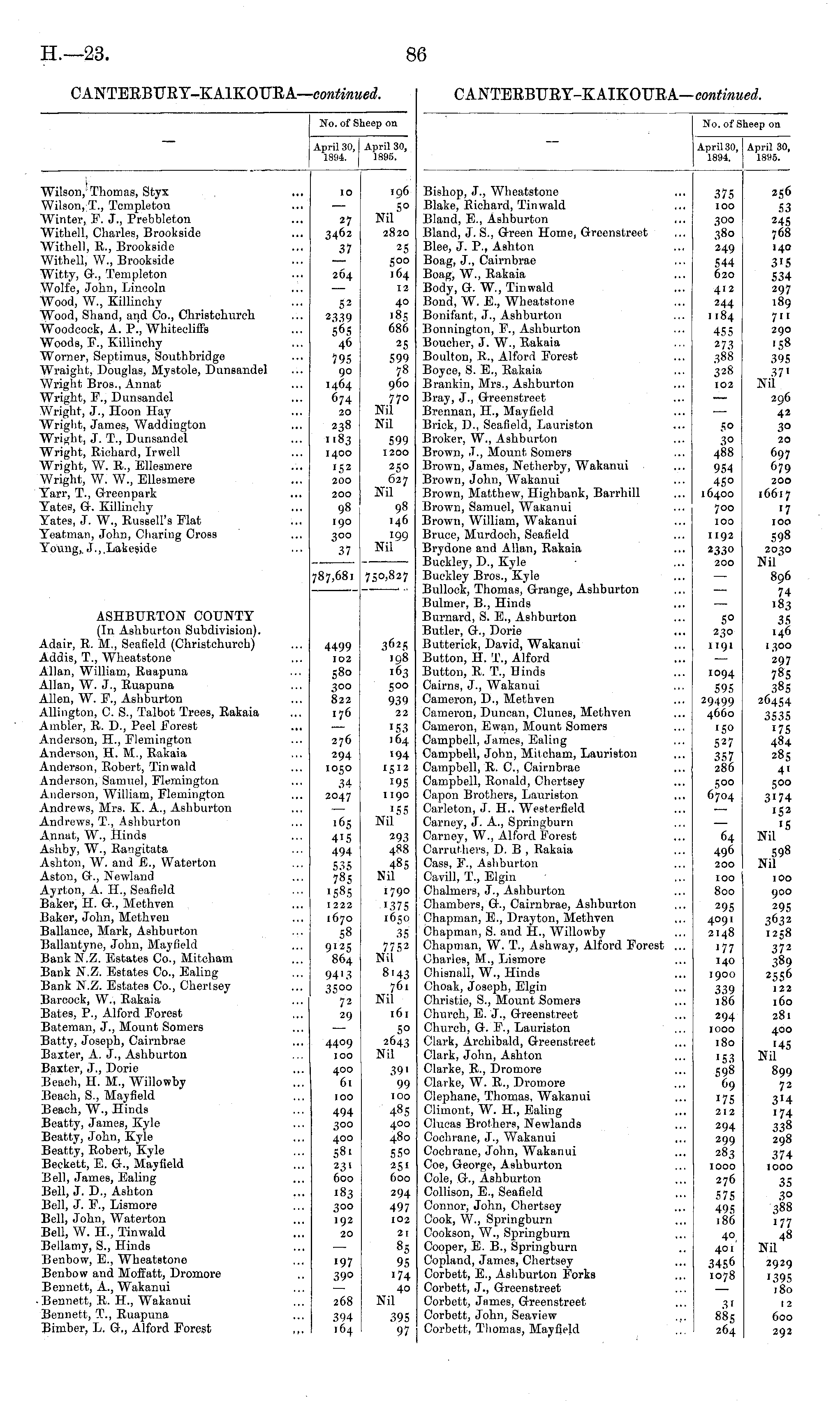 No. of Sheep on April 30, I April 30, 1894. 1895. Bishop, J., Wheatstone Blake, Richard, Tinwald Bland, E., Ashburton Bland, J. S., Green Home, Greenstreet Blee, J. P., Ashton Boag, J., Cairnbrae Boag, W., Rakaia Body, G. W., Tinwald Bond, W. E., Wheatstone Bonifant, J., Ashburton Bonnington, F., Ashburton Boucher, J. W., Rakaia Boulton, R., Alford Forest Boyce, S. E., Rakaia Brankin, Mrs., Ashburton Bray, J., Greenstreet Brennan, H., Mayfield Brick, D., Seafield, Lauriston Broker, W., Ashburton Brown, J., Mount Somers Brown, James, Netherby, Wakanui Brown, John, W-ikanui Brown, Matthew, Highbank, Barrhill Brown, Samuel, Walianui Brown, William, Wakanui Bruce, Murdoch, Seafield Brydone and Allan, Rakaia Buckley, D., Kyle Buckley Bros., Kyle Bullock, Thomas, Grange, Ashburton Bulmer, B., Hinds Burnard, S. E., Ashburton Butler, G., Dorie Butterick, David, Wakanui Button, H. '_., Alford Button, R. T., Hinds Cairns, J., Wakanui Cameron, D., Methven Cameron, Duncan, Clunes, Methven Cameron, Ewan, Mount Somers Campbell, James, Ealing Campbell, John, Milcham, Lauriston Campbell, R. C, Cairnbrae Campbell, Ronald, Chertsey Capon Brothers, Lauriston Carleton, J. H. Westerfield Carney, J. A., Springburn Carney, W., Alford Forest Carruthers, D. B , Rakaia Cass, F., Ashburton Cavill, T., Elgin Chalmers, J., Ashburton Chambers, G., Cairnbrae, Ashburton Chapman, E., Drayton, Methven Chapman, S. and fi., Willowby Chapman, W. T., Ashway, Alford Forest ... Charles, M., Lismore Chisnall, W., Hinds Choak, Joseph, Elgin Christie, S., Mount Somers Church, E. J., Greenstreet Church, G. F-, Lauriston Clark, Archibald, Greenstreet Clark, John, Ashton Clarke, R., Dromore Clarke, W. R., Dromore Clephane, Thomas, Wakanui Climont, W. H., Ealing Clueas Brothers, Newlands Cochrane, J., Wakanui Cochrane, John, Wakanui Coe, George, Ashburton Cole, G., Ashburton Collison, E., Seafield Connor, John, Chertsey Cook, W., Springburn Cookson, W., Springburn Cooper, E. B., Springburn Copland, James, Chertsey Corbett, E., Ashburton Forks Corbett, J., Greenstreet Corbett, James, Greenstreet Corbett, John, Seaview Corbett, Thomas, Mayfield 375 IOO 300 380 249 544 620 412 244 1184 455 273 388 328 102 5° 30 488 954 45° 16400 700 100 1192 2330 200 5° 230 1191 1094 595 29499 4660 150 527 357 286 256 53 245 768 140 3'5 534 297 189 7" 290 '58 395 37' Nil 296 42 30 20 697 679 200 16617 '7 100 598 2030 Nil 896 74 '83 35 146 1300 297 78S 385 26454 3535 '75 484 285 4' 500 3174 152 '5 Nil 598 Nil 500 6704 64 496 200 100 800 100 900 295 3632 1258 372 389 2556 122 160 281 400 145 Nil 899 72 3'4 '74 338 298 374 IOOO 295 4091 2148 177 140 1900 339 186 294 IOOO 180 153 598 69 '75 212 294 299 283 IOOO 276 575 495 186 35 30 388 '77 48 Nil 40 401 3456 1078 2929 1395 180 3' 885 264 12 600 292