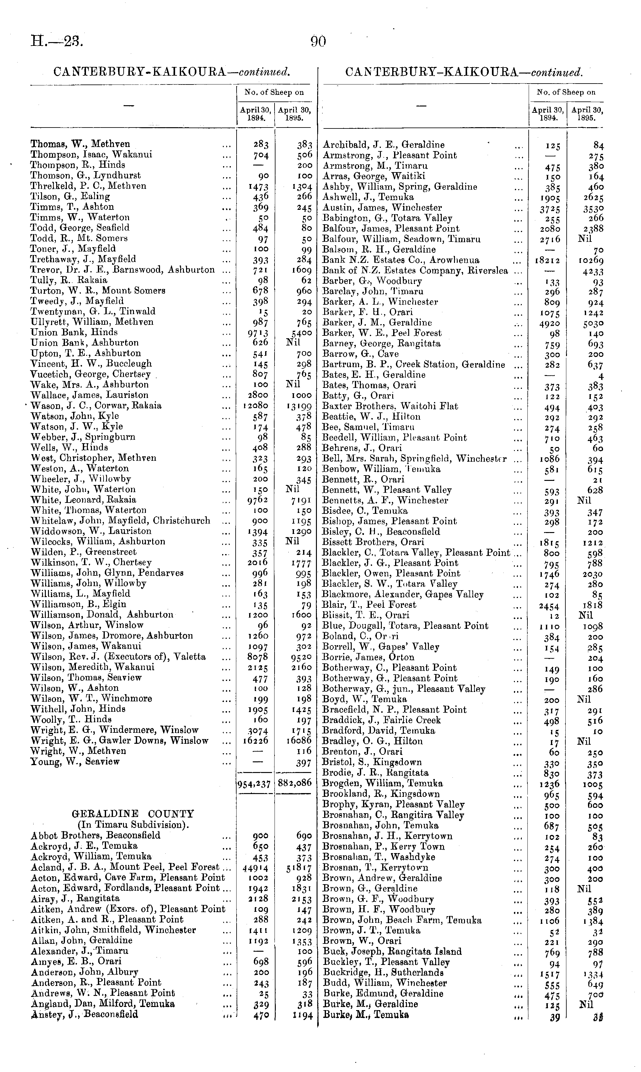 No. of Sheep on April 30, April 30, 1894. 1895. Archibald, J. E., Geraldine Armstrong, J., Pleasant Point Armstrong, M., Timaru Arras, George, Waitiki Ashby, William, Spring, Geraldine Ashwell, J., Temuka Austin, James, Winchester Babington, G., Totara Valley Balfour, James, Pleasant Point Balfour, William, Seadown, Timaru Balsom, R. H, Geraldine Bank N.Z. Estates Co., Arowhenua Bank of N.Z. Estates Company, Riverslea ... Barber, G.-, Woodbury Barclay, John, Timaru Barker, A. L., Winchester Barker, F. U., Orari Barker, J. M., Geraldine Barker, W. E., Peel Forest Barney, George, Rangitata Barrow, G., Cave Bartrum, B. P., Creek Station, Geraldine ... Bates, E. H, Geraldine Bates, Thomas, Orari Batty, G., Orari Baxter Brothers, Waitohi Flat Beattie, W. J., Hilton Bee, Samuel, Timaru Beedell, William, Pleasant Point Behrens, J., Orari Bell, Mrs. Sarah, Springfield, Winchester ... Benbow, William, Temuka Bennett, R., Orari Bennett, W., Pleasant Valley Bennetts, A. F., Winchester Bisdee, G, Temuka Bishop, James, Pleasant Point Bisley, C. H., Beaconsfield Bissett Brothers, Orari Blackler, G, Totara Valley, Pleasant Point... Blackler, J. G., Pleasant Point Blackler, Owen, Pleasant Point Blackler, S. W., Totara Valley Blackmore, Alexander, Gapes Valley Blair, T., Peei Forest Blissit, T. E., Orari Blue, Dougall, Totara, Pleasant Point Boland, C, Or.ri Borrell, W., Gapes' Valley Borrie, James, Orton Botherway, G, Pleasant Point Botherway, G., Pleasant Point Botherway, G., jun., Pleasant Valley Boyd, W., Temuka Bracefield, N. P., Pleasant Point Braddick, J., Fairlie Creek Bradford, David, Temuka Bradley, O. G., Hilton Brenton, J., Orari Bristol, S., Kingsdown Brodie, J. R., Rangitata Brogden, William, Temuka Brookland, R., Kingsdown Brophy, Kyran, Pleasant Valley Brosnahan, G, Rangitira Valley Brosnahan, John, Temuka Brosnahan, J. H, Kerrytown Brosnahan, P., Kerry Town Brosnahan, T, Washdyke Brosnan, T., Kerrytown Brown, Andrew, Geraldine Brown, G-., Geraldine Brown, G. F., Woodbury Brown, H. F., Woodbury Brown, John, Beach Farm, Temuka Brown, J. _., Temuka Brown, W., Orari Buck, Joseph, Rangitata Island Buckley, T., Pleasant Valley Buckridge, H., Sutherlands Budd, William, Winchester Burke, Edmund, Geraldine ,,, Burke, M., Geraldine ... Burke; M., Temuka ,., 125 475 150 385 '9°5 3725 255 2080 2716 18212 '3.3 296 809 1075 4920 98 759 3°o 282 373 122 494 2Q2 274 710 5° 1086 58' 593 291 393 298 1815 800 795 1746 274 102 84 275 380 164 460 2625 353° 266 2388 Nil 70 10269 42,33 93 287 924 1242 5030 140 693 200 6.37 4 383 '52 4°3 292 258 463 60 394 6.5 21 628 Nil 347 172 200 1212 598 788 2030 280 85 1818 Nil 1098 200 285 204 100 160 286 Nil 2454 12 1110 384 '54 149 190 200 ..7 498 '5 '7 60 330 830 1236 965 500 100 687 102 254 274 3°o 300 118 393 280 1106 52 221 769 94 1517 555 475 '25 39 291 5'6 10 Nil 250 350 373 1005 594 600 100 505 83 260 IOO 400 200 Nil 55* 389 1384 32 290 788 97 '334 649 700 Nil $i