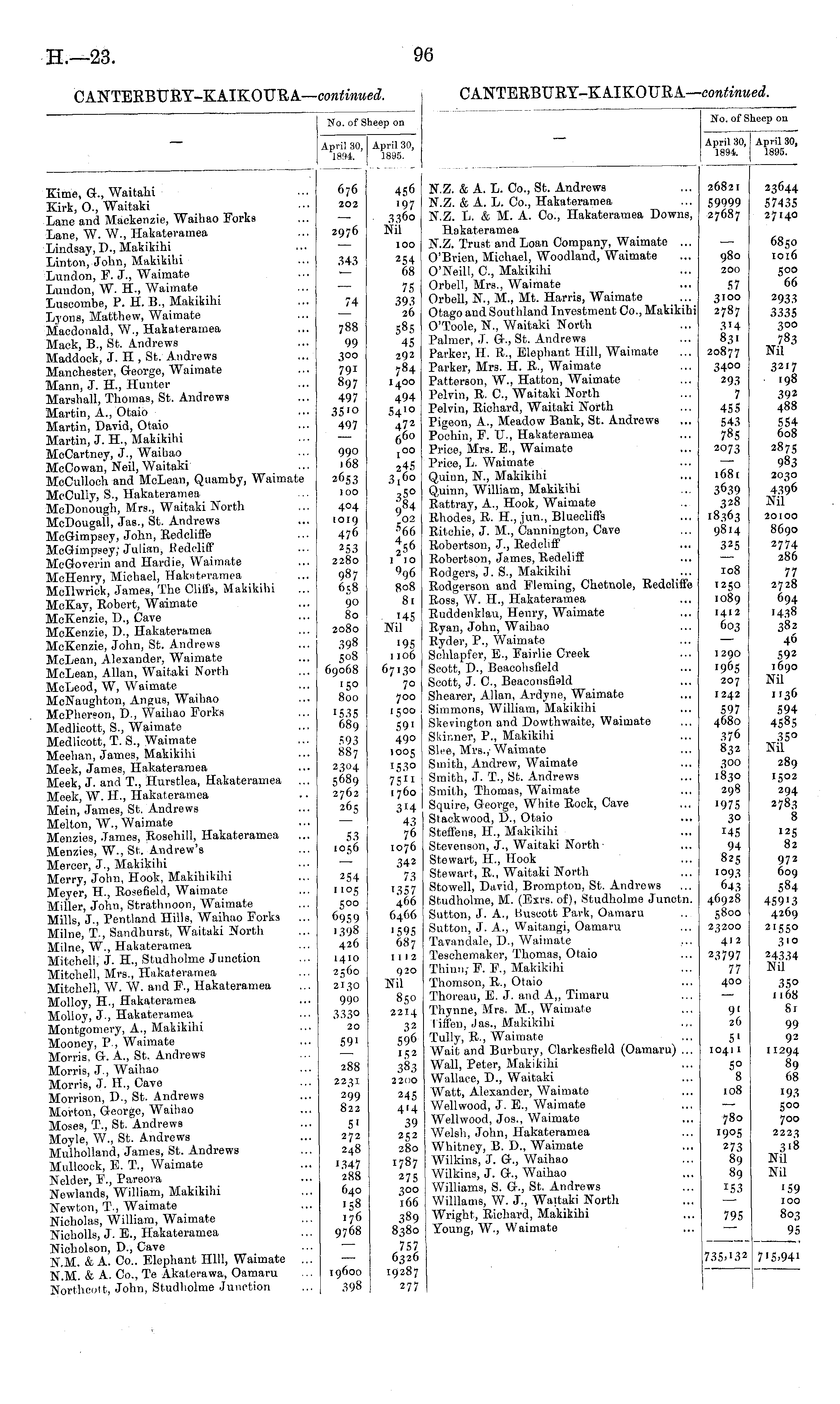No. of Sheep on April 30. 1894. April 30, 1895. Kime, G., Waitahi Kirk, O., Waitaki Lane and Mackenzie, Waihao Forks Lane, W. W., Hakateramea Lindsay, D., Makikihi Linton, John, Makikihi Lundon, F. J., Waimate Lundon, W. H, Waimate Luscombe, P. H. B., Makikihi Lyons, Matthew, Waimate Macdonald, W., Hakateramea Mack, B., St. Andrews Maddock, J. H , St. Andrews Manchester, George, Waimate Mann, J. H., Hunter Marshall, Thomas, St. AndrewB Martin, A., Otaio Martin, David, Otaio Martin, J. H, Makikihi McCartney, J., Waihao McCowan, Neil, Waitaki MeCulloch and McLean, Quamby, Waimate McCully, S., Hakateramea McDonough, Mrs., Waitaki North McDougall, Jas., St. Andrews McGimpsey, John, Redcliffe McGimpsey; Julian, Redeliff McGoverin and Hardie, Waimate McIIenry, Michael, Hakateramea Mcllwrick, James, The Cliffs, Makikihi McKay, Robert, Waimate McKenzie, D., Cave McKenzie, D., Hakateramea McKenzie, John, St. Andrews McLean, Alexander, Waimate McLean, Allan, Waitaki North McLeod, W, Waimate McNaughton, Angus, Waihao McPherson, D., Waihao Forks Medlicott, S., Waimate Medlicott, T. S., Waimate Median, James, Makikihi Meek, James, Hakateramea Meek, J. and _., Hurstlea, Hakateramea ... Meek, W. IL, Hakateramea Mein, James, St. Andrews Melton, W., Waimate Menzies, James, Rosehill, Hakateramea Menzies, W., St. Andrew's Mercer, J., Makikihi Merry, John, Hook, Makihikihi Meyer, H, Rosefield, Waimate Miller, John, Strathnoon, Waimate Mills, J., Pentland Hills, Waihao Forks Milne, T., Sandhurst, Waitaki North Milne, W., Hakateramea Mitchell, J. H, Studholme Junction Mitchell, Mrs., Hakateramea Mitchell, W. W. and F., Hakateramea Molloy, H, Hakateramea Molloy, J-, Hakateramea Montgomery, A., Makikihi Mooney, P., Waimate Morris. G. A., St. Andrews Morris, J., Waihao Morris, J. H, Cave Morrison, D., St. Andrews Morton, George, Waihao Moses, T., St. Andrews Moyle, W., St. Andrews Mu'lholland, James, St. Andrews Mullcock, E. T., Waimate Nelder, F., Pareora Newlands, William, Makikihi Newton, T., Waimate Nicholas, William, Waimate Nicholls, J. E., Hakateramea Nicholson, D., Cave N.M. & A. Co.. Elephant Hill, Waimate ... N.M. & A. Co., Te Akaferawa, Oamaru Nortbcott, John, Studholme Junction 676 202 456 '97 3360 Nil 2976 100 343 254 68 75 393 26 585 45 292 784 I400 494 54'° 6 6o 10° 245 3^0 74 788 99 3°o 791 897 497 35'° 497 990 168 2653 100 404 1019 476 253 2280 987 658 90 80 2080 398 508 69068 '5° 800 350 984 .02 '66 _><> 1 10 ° 9 6 808 81 '535 689 593 887 2304 5689 2762 265 '45 Nil '95 1106 671.30 70 700 1500 59' 490 1005 '53° 75" 1760 3'4 43 76 1076 342 73 '357 466 6466 '595 687 1112 53 1056 254 1 105 500 6959 '398 426 1410 2560 2130 990 3330 20 920 Nil 850 2214 3 2 596 '5 2 383 2200 59' 288 2231 299 822 5' 272 248 '347 288 640 '58 176 9768 245 414 39 252 280 1787 275 300 166 389 8380 757 6326 19287 277 19600 398