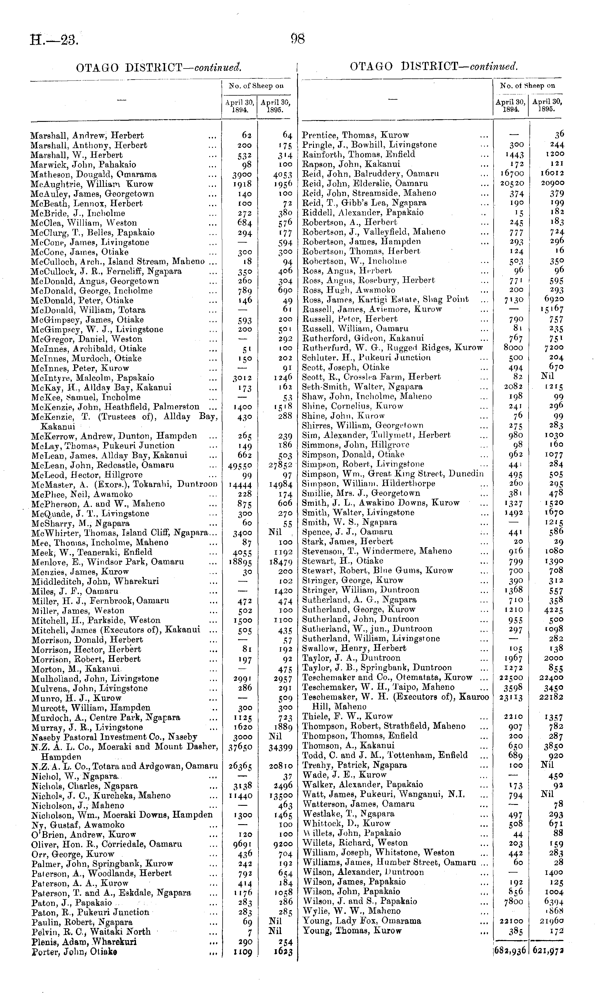 No. of Sheep on April 30, 1894. April 30, 1895. Marshall, Andrew, Herbert Marshall, Anthony, Herbert Marshall, W., Herbert Marwick, John, Pahakaio Matheson, Dougald, Omarama McAughtrie, William Kurow McAuley, James, Georgetown McBeatb, Lennox, Herbert McBride, J., Incholme McClea, William, Weston McClurg, T., Belles, Papakaio McCone, James, Livingstone McCone, James, Otiake McCulloch, Arch., Island Stream, Maheno ... McCullock, J. R., Ferncliff, Ngapara McDonald, Angus, Georgetown McDonald, George, Incholme McDonald, Peter, Otiake McDonald, William, Totara McGimpsey, James, Otiake McGimpsey, W. J., Livingstone McGregor, Daniel, Weston Mclnnes, Archibald, Otiake Mclnnes, Murdoch, Otiake Mclnnes, Peter, Kurow Mclntyre, Malcolm, Papakaio McKay, H., Allday Bay, Kakanui McKee, Samuel, Incholme McKenzie, John, Heathfield, Palmerston ... McKenzie, T. (Trustees of), Allday Bay, Kakanui McKerrow, Andrew, Dunton, Hampden McLay, Thomas, Pukeuri Junction McLean, James, Allday Bay, Kakanui McLean, John, Redcastle, Oamaru McLeod, Hector, Hillgrove McMaster, A. (Exors.), Tokarahi, Duntroon McPhee, Neil, Awamoko McPherson, A. and W., Maheno McQuade, J. T., Livingstone McSharry, M., Ngapara McWhir'ter, Thomas, Island Cliff, Ngapara... Mee, Thomas, Incholme, Maheno Meek, W., Teaneraki, Enfield Menlove, E., Windsor Park, Oamaru Menzies, James, Kurow Middleditch, John, Wharekuri Miles, J. _ .■, Oamaru Miller, H. J., Fernbrook, Oamaru Miller, James, Weston Mitchell, H., Pnrkside, Weston Mitchell, James (Executors of), Kakanui ... Morrison, Donald, Herbert Morrison, Hector, Herbert Morrison, Robert, Herbert Morton, M., Kakanui Mulholiand, John, Livingstone Mulvena, John, Livingstone Munro, H. J., Kurow Murcott, William, Hampden Murdoch, A., Centre Park, Ngapara Murray, J. R., Livingstone Naseby Pastoral Investment Co., Naseby N.Z. A. L. Co., Moeraki and Mount Dasher, Hampden N.Z. A. L. Co., Totara and Ardgowan, Oamaru Nichol, W., Ngapara. Nichols, Charles, Ngapara Nichols, J. C, Kureheka, Maheno Nicholson, J., Maheno Nicholson, Wm., Moeraki Downs, Hampden Ny, Gustaf, Awamoko O'Brien, Andrew, Kurow Oliver, Hon. R., Corriedale, Oamaru Orr, George, Kurow Palmer, John, Springbank, Kurow Palerson, A., Woodlands, Herbert Paterson, A. A., Kurow Palerson, T. and A., Eskdale, Ngapara Paton, J., Papakaio Paton, R., Pukeuri Junction Paulin, Robert, Ngapara Pelvin, R. G, Waitaki North Plenis, Adam, Wharekuri Porter, John, Otiake ,.. 62 200 64 '75 3'4 100 532 98 39oo igi8 140 100 272 684 294 4053 1956 100 72 380 576 '77 594 300 94 406 304 690 49 61 200 300 ' 18 350 260 789 146 593 200 501 292 100 202 5' 150 3012 ' 173 9' 1246 162 1400 430 53 1518 288 265 '49 662 2.39 186 4955° 99 14444 228 875 300 60 50.3 27852 97 14984 174 606 270 55 Nil 100 3400 87 4055 .8895 30 1192 18479 200 472 5°2 1500 5°5 81 '97 102 1420 474 100 I IOO 435 57 192 92 475 2957 291 5°9 300 7 2 3 1889 Nil 299' 286 300 1125 1620 3000 37650 34399 26365 20810 3'38 11440 1300 120 9691 436 242 792 414 1176 283 283 69 7 290 1 109 37 2496 13500 463 1465 100 IOO 9200 704 192 654 184 1058 286 285 Nil Nil 254 1623