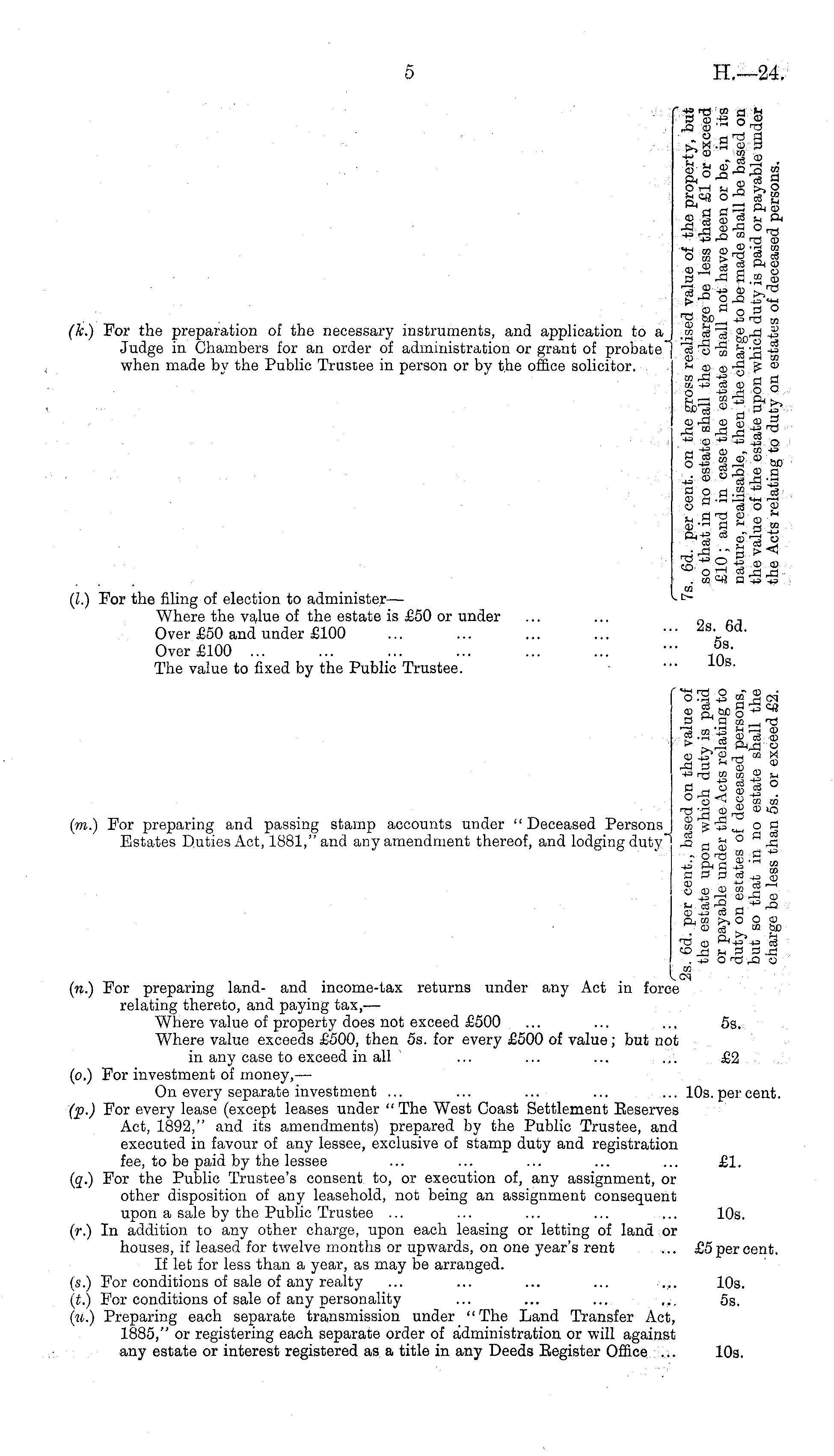 f*= nS co fl k p< _, rf a as g § g Cβ n ft 3 MSm a> j: <d « os o (A.) For the preparation of the necessary instruments, and application to a ■ g 3"3 g^-2 Judge in Chambers for an order of administration or grant of probate") "3 "§ ~§ § 2 += when made by the Public Trustee in person or by the office solicitor. 2 a> © -5 & ™ «,« ci j) s ; °a 53 ft >_ , . , © -*= 13 J o 5* "" so § S.Ss^^ 111 CO (Z.) For the filing of election to administer— *- ■=- Where the value of the estate is £50 or under ... ... 0 „, Over £50 and under £100 - s - bd - Over £100 ... ... ... ... ... ... "' J 3 *' The value to fixed by the Public Trustee. '" iUs - -3 co t3 (to.) For preparing and passing stamp accounts under "Deceased Persons, % jj :3 w o c Estates Duties Act, 1881," and any amendment thereof, and lodging duty" £ a g ° 4= r ft"a s' n » an p * g CD M 3 3 .r! .+3 o ,£} o CO (to.) For preparing land- and income-tax returns under any Act in force relating thereto, and paying tax,- — Where value of property does not exceed £500 ... ... ... ss, Where value exceeds £500, then ss. for every £500 of value; but not in any case to exceed in all ... ... ... ./. £2 (o.) For investment of money, — On every separate investment ... ... ... ... ... 10s. per cent. (p.) For every lease (except leases under " The West Coast Settlement Eeserves Act, 1892," and its amendments) prepared by the Public Trustee, and executed in favour of any lessee, exclusive of stamp duty and registration fee, to be paid by the lessee ... ... ... ... ... £1. (q.) For the Public Trustee's consent to, or execution of, any assignment, or other disposition of any leasehold, not being an assignment consequent upon a sale by the Public Trustee ... ... ... ... ... 10s. (r.) In addition to any other charge, upon each leasing or letting of land or houses, if leased for twelve months or upwards, on one year's rent ... £5 per cent. If let for less than a year, as may be arranged. (s.) For conditions of sale of any realty ... ... ... ... ... 10s. (t.) For conditions of sale of any personality ... ... ... ... ss. («.) Preparing each separate transmission under "The Land Transfer Act, 1885," or registering each separate order of administration or will against any estate or interest registered as a title in any Deeds Register Office ... 10s.