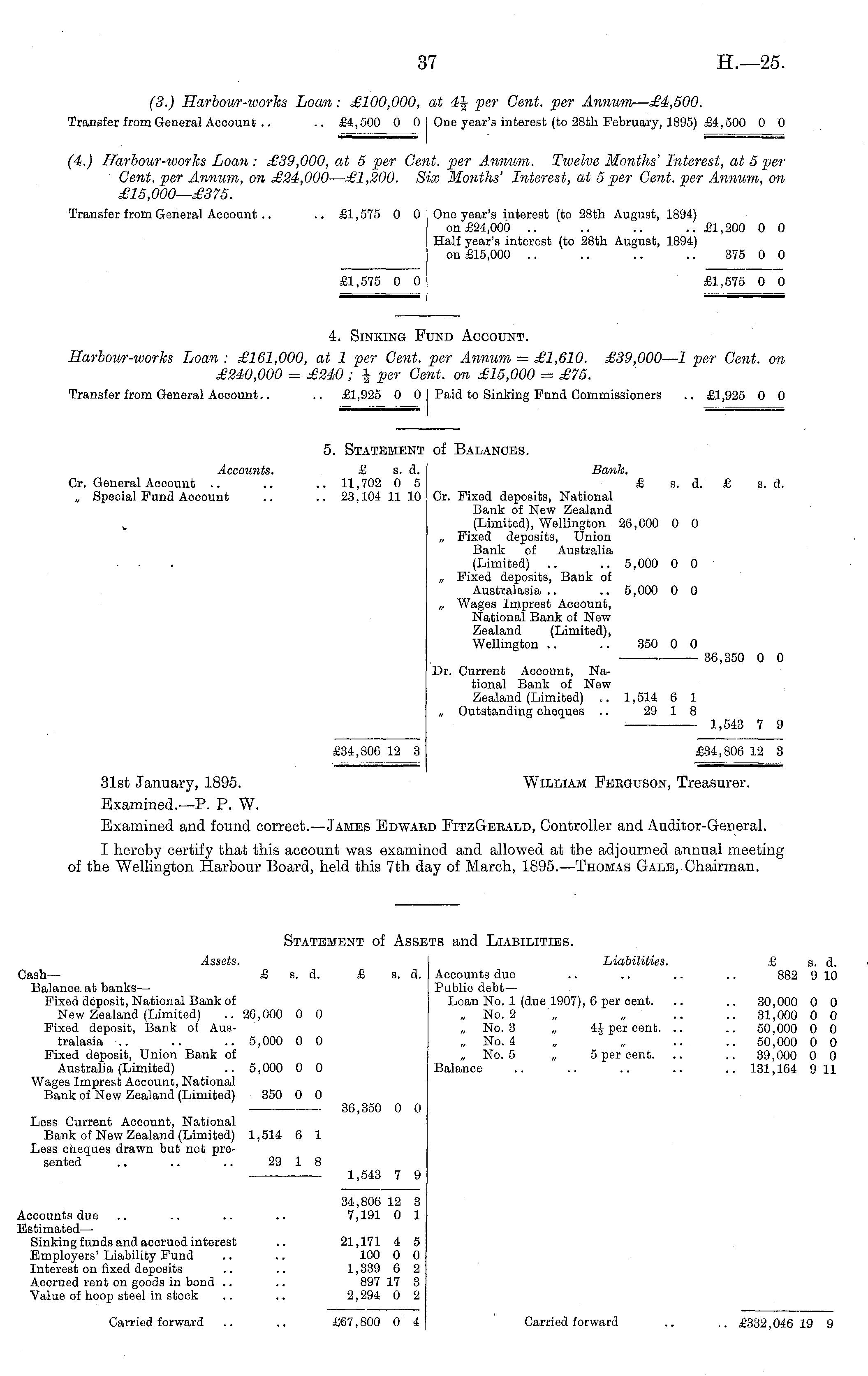 5. Statement of Balances. Accounts. £ s. d. Bank. Cr. General Account .. .. .. 11,702 0 5 £ s. d. £ s. d. „ Special Fund Account .. .. 23,104 11 10 Cr. Fixed deposits, National Bank of New Zealand (Limited), Wellington 26,000 0 0 „ Fixed deposits, Union Bank of Australia . . . (Limited) .. .. 5,000 0 0 „ Fixed deposits, Bank of Australasia .. .. 5,000 0 0 „ Wages Imprest Account, National Bank of New Zealand (Limited), Wellington .. .. 350 0 0 36,350 0 0 Dr. Current Account, National Bank of New Zealand (Limited) .. 1,514 6 1 „ Outstanding cheques .. 29 1 8 1,543 7 9 £34,806 12 3 £34,806 12 3 31st January, 1895. William Feeguson, Treasurer. Examined.—P. P. W. Examined and found correct. —James Edwaed FitzGeeald, Controller and Auditor-General. I hereby certify that this account was examined and. allowed at the adjourned annual meeting of the Wellington Harbour Board, held this 7th day of March, 1895.—Thomas Gale, Chairman.