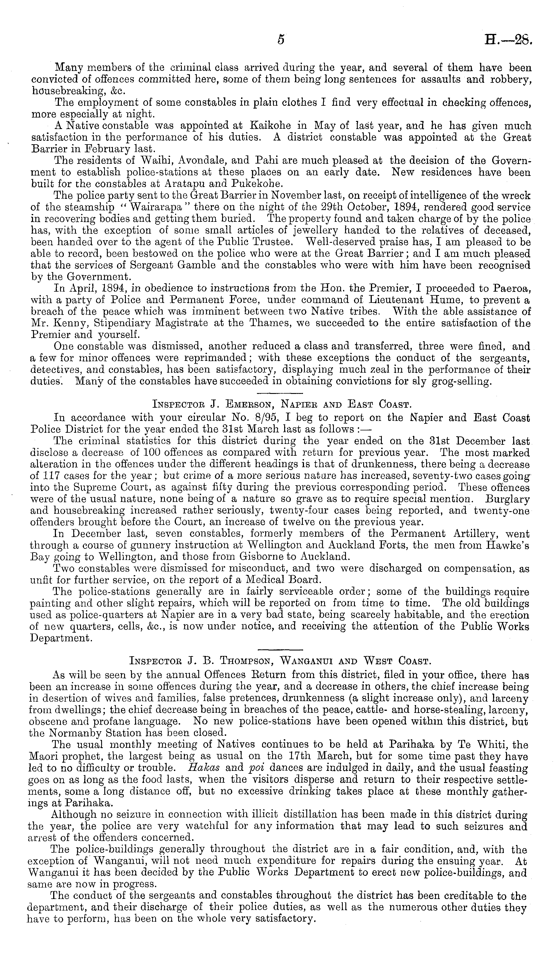 Inspectoe J. Emeeson, Napibe and East Coast. In accordance with your circular No. 8/95, I beg to report on the Napier and East Coast Police District for the year ended the 31st March last as follows : — The criminal statistics for this district during the year ended on the 31st December last disclose a decrease of 100 offences as compared with return for previous year. The most marked alteration in the offences under the different headings is that of drunkenness, there being a decrease of 117 cases for the year; but crime of a more serious nature has increased, seventy-two cases going into the Supreme Court, as against fifty during the previous corresponding period. These offences were of the usual nature, none being of a nature so grave as to require special mention. Burglary and housebreaking increased rather seriously, twenty-four cases being reported, and twenty-one offenders brought before the Court, an increase of twelve on the previous year. In December last, seven constables, formerly members of the Permanent Artillery, went through a course of gunnery instruction at Wellington and Auckland Forts, the men from Hawke's Bay going to Wellington, and those from Gisborne to Auckland. Two constables were dismissed for misconduct, and two were discharged on compensation, as unfit for further service, on the report of a Medical Board. The police-stations generally are in fairly serviceable order; some of the buildings require painting and other slight repairs, which will be reported on from time to time. The old buildings used as police-quarters at Napier are in a very bad state, being scarcely habitable, and the erection of new quarters, cells, &c, is now under notice, and receiving the attention of the Public Works Department.