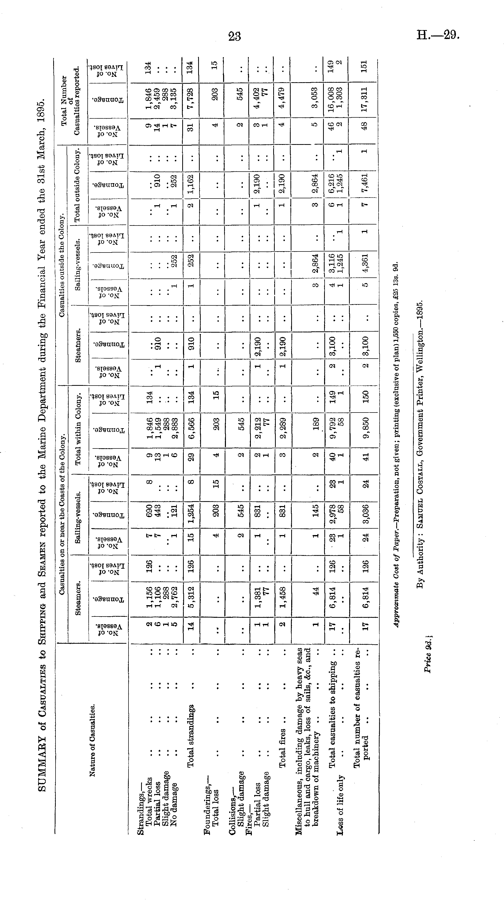 SUMMARY of Casualties to Shipping and Seamen reported to the Marine Department during the Financial Year ended the 31st March, 1895.