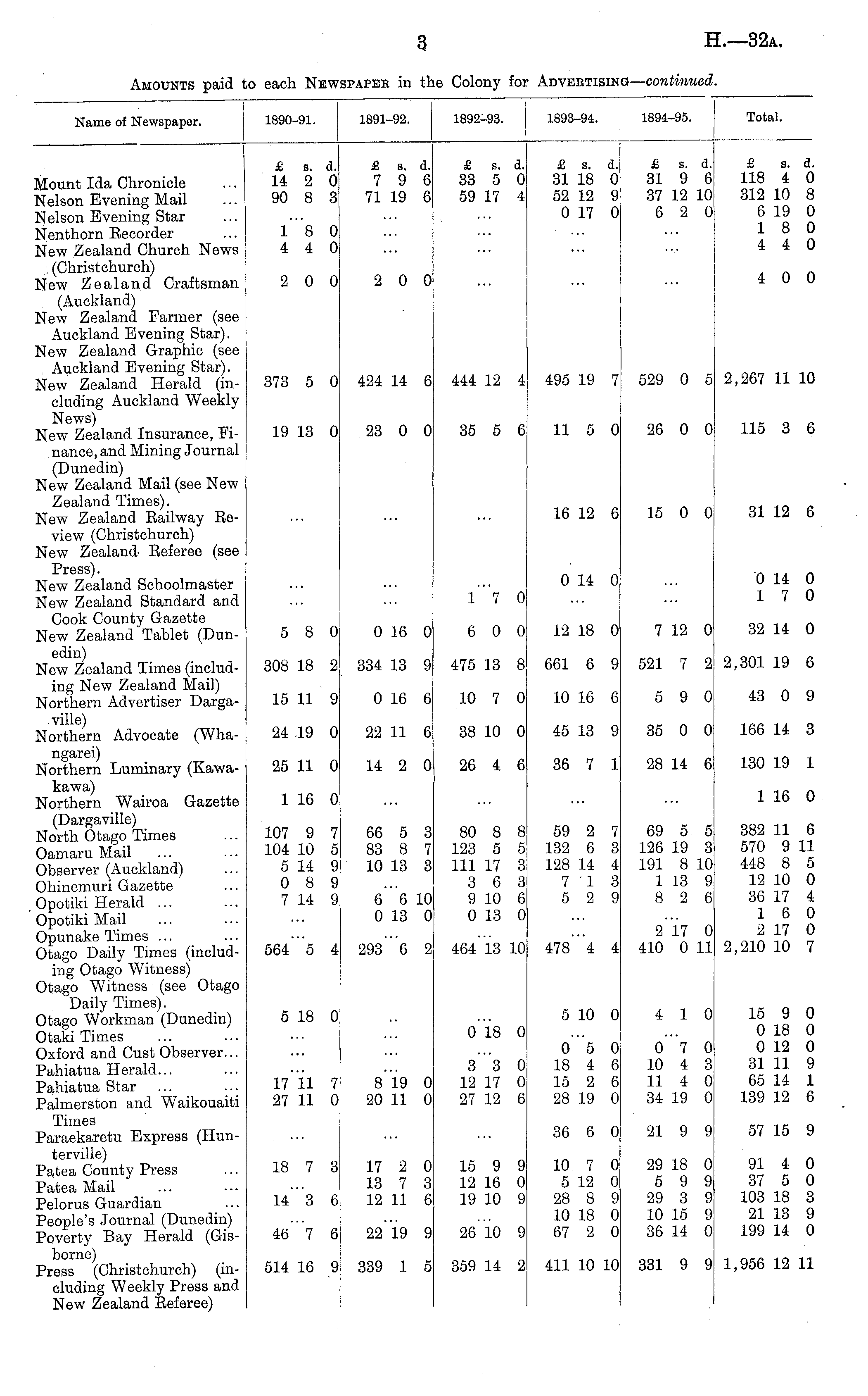 Name of Newspaper. 1890-91. 1891-92. 1892-93. 1893-94. Mount Ida Chronicle Nelson Evening Mail Nelson Evening Star Nenthorn Becorder New Zealand Church News (Christchurch) New Zealand Craftsman (Auckland) New Zealand Farmer (see Auckland Evening Star). New Zealand Graphic (see Auckland Evening Star). New Zealand Herald (including Auckland Weekly News) New Zealand Insurance, Finance, and Mining Journal (Dunedin) New Zealand Mail (see New Zealand Times). New Zealand Bailway Eeview (Christchurch) New Zealand- Beferee (see Bress). New Zealand Schoolmaster New Zealand Standard and Cook County Gazette New Zealand Tablet (Dunedin) New Zealand Times (including New Zealand Mail) Northern Advertiser Dargaville) Northern Advocate (Whangarei) Northern Luminary (Kawakawa) Northern Wairoa Gazette (Dargaville) North Otago Times Oamaru Mail Observer (Auckland) Ohinemuri Gazette Opotiki Herald ... Opotiki Mail Opunake Times ... Otago Daily Times (including Otago Witness) Otago Witness (see Otago Daily Times). Otago Workman (Dunedin) Otaki Times Oxford and Cust Observer... Pahiatua Herald... Pahiatua Star Palmerston and Waikouaiti Times Paraekaretu Express (Hunterville) Patea County Press Patea Mail Pelorus Guardian People's Journal (Dunedin) Poverty Bay Herald (Gisborne) Press (Christchurch) (including Weekly Press and New Zealand Beferee) £ s. d. 14 2 0 90 8 3 £ s. d. 7 9 6 71 19 6 £ s. d. 33 5 0 59 17 4 £ s. d. 31 18 0 52 12 9 0 17 0 £ s. d. 31 9 6 37 12 10 6 2 0 £ a. a. 118 4 0 312 10 8 6 19 0 18 0 4 4 0 18 0 4 4 0 2 0 0 2 0 0 4 0 0 424 14 6 495 19 7 529 0 5 2,267 11 10 373 5 0 444 12 4 19 13 0 23 0 0 35 5 6 11 5 0 26 0 0 115 3 6 16 12 6 15 0 0 31 12 6 1 7 0 0 14 0 0 14 0 17 0 5 8 0 0 16 0 6 0 0 12 18 0 7 12 0 32 14 0 308 18 2j 334 13 9 475 13 8 661 6 9 521 7 2 2,301 19 6 15 11 9 0 16 6 10 7 0 10 16 6 5 9 0 43 0 9 24 19 0 22 11 6 38 10 0 45 13 9 35 0 0 166 14 3 25 11 0 14 2 0 26 4 6 36 7 1 28 14 6 130 19 1 1 16 0 1 16 0 107 9 7 104 10 5 5 14 9 0 8 9 7 14 9 66 5 3 83 8 7 10 13 3 80 8 8 123 5 5 111 17 3 3 6 3 9 10 6 0 13 0 59 2 7 132 6 3 128 14 4 7 13 5 2 9 69 5 5 126 19 3 191 8 10 1 13 9 8 2 6 382 11 6 570 9 11 448 8 5 12 10 0 36 17 4 16 0 2 17 0 2,210 10 7 6 6 10 0 13 0 564***5 4 293 6 2 464 13 10 478 4 4 2 17 0 410 0 11 5 18 0 0 18 0 5 10 0 4 10 15 9 0 0 18 0 0 12 0 31 11 9 65 14 1 139 12 6 17 "il 7 27 11 0 8*19 0 20 11 0 3 3 0 12 17 0 27 12 6 0 5 0 18 4 6 15 2 6 28 19 0 0 7 0 10 4 3 11 4 0 34 19 0 36 6 0 21 9 9 57 15 9 18 7 3 14 3 6 17 2 0 13 7 3 12 11 6 15 9 9 12 16 0 19 10 9 10 7 0 5 12 0 28 8 9 10 18 0 67 2 0 29 18 0 5 9 9 29 3 9 10 15 9 36 14 0 91 4 0 37 5 0 103 18 3 21 13 9 199 14 0 46***7 6 22 19 9 26*10 9 514 16 9 339 1 5 359 14 2 411 10 10 331 9 9 1,956 12 11