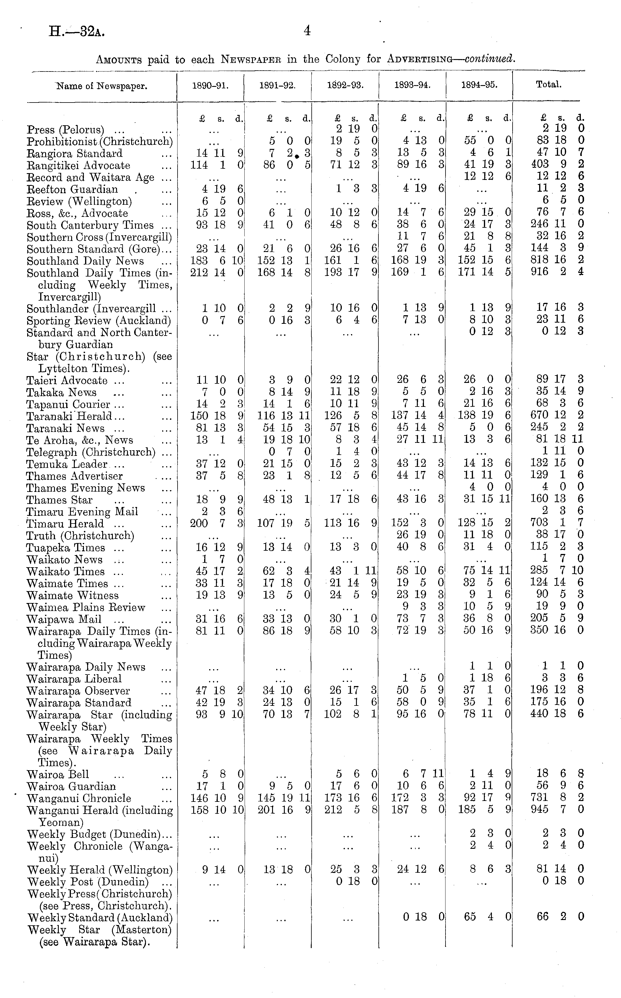 Name of Newspaper. 1890-91. 1891-92. 1892-93. i-h 14. 14-i £ s. d. £ s. d. £ s. d. 2 19 0 19 5 0 8 5 3 71 12 3 £ s. d. £ s. d. £ s. d. 2 19 0 83 18 0 47 10 7 403 9 2 12 12 6 11 2 3 6 5 0 76 7 6 246 11 0 32 16 2 144 3 9 818 16 2 916 2 4 Press (Pelorus) ... Prohibitionist (Christchurch) Bangiora Standard Bangitikei Advocate Eecord and Waitara Age ... Beef ton Guardian Beview (Wellington) Boss, &c, Advocate South Canterbury Times ... Southern Cross (Invercargill) Southern Standard (Gore)... Southland Daily News Southland Daily Times (including Weekly Times, Invercargill) Southlander (Invercargill ... Sporting Beview (Auckland) Standard and North Canterbury Guardian Star (Christchurch) (see Lyttelton Times). Taieri Advocate ... Takaka News Tapanui Courier ... Taranaki Herald... Taranaki News ... Te Aroha, &c, News Telegraph (Christchurch) ... Temuka Leader ... Thames Advertiser Thames Evening News Thames Star Timaru Evening Mail Timaru Herald ... Truth (Christchurch) Tuapeka Times ... Waikato News ... Waikato Times ... Waimate Times ... Waimate Witness Waimea Plains Beview Waipawa Mail ... Wairarapa Daily Times (including Wairarapa Weekly Times) Wairarapa Daily News Wairarapa Liberal Wairarapa Observer Wairarapa Standard Wairarapa Star (including Weekly Star) Wairarapa Weekly Times (see Wairarapa Daily Times). Wairoa Bell Wairoa Guardian Wanganui Chronicle Wanganui Herald (including Yeoman) Weekly Budget (Dunedin)... Weekly Chronicle (Wanganui) Weekly Herald (Wellington) Weekly Post (Dunedin) Weekly Press (Christchurch) (see Press, Christchurch). Weekly Standard (Auckland) Weekly Star (Masterton) (see Wairarapa Star). 14**11 9 114 1 0: 4 19 6 6 5 0| 15 12 o! 93 18 9 23 14 Oj 183 6 10 ! 212 14 0 1 10 0 0 7 6 11 10 0: 7 0 Oi 14 2 3! 150 18 9; 81 13 3 13 1 4 37 12 0 37 5 8 18 9 9 2 3 6 200 7 3 16 12 9 17 0 45 17 2 33 11 3 19 13 9 5 0 0 7 2. 3 86 0 5 6 "l 0 41 0 6 21 6 0 152 13 1 168 14 8 2 2 9 0 16 3 3 9 0 8 14 9 14 1 6 116 13 11 54 15 3 19 18 10 0 7 0 21 15 0 23 1 8 48 13 1 ... 107 19 5 13 14 0 13 3 10* 12 0 48 8 6 26 16 6 161 1 6 193 17 9 10 16 0 6 4 6 22 12 0 11 18 9 10 11 9 126 5 8 57 18 6 8 3 4 14 0 15 2 3 12 5 6 17 18 6 113 16 9 13 3 0 4 13 0 13 5 3 89 16 3 4 19 6 14 7 6 38 6 0 11 7 6 27 6 0 168 19 3 169 1 6 1 13 9 7 13 0 26 6 3 5 5 0 7 11 6 137 14 4 45 14 8 27 11 11 43 12 3 44 17 8 43 16 3 152 3 0 26 19 0 40 8 6 55 0 0 4 6 1 41 19 3 12 12 6 29 15 0 24 17 3 21 8 8! 45 1 3 152 15 6 171 14 5 1 13 9 8 10 3 0 12 3 26 0 0 2 16 3 21 16 6 138 19 6 5 0 6 13 3 6 14 13 6 11 11 0 4 0 0 31 15 11 128 15 2 11 18 0 31 4 0 17 16 3 23 11 6 0 12 3 89 17 3 35 14 9 68 3 6 670 12 2 245 2 2 81 18 11 1 11 0 132 15 0 129 1 6 4 0 0 160 13 6 2 3 6 703 1 7 38 17 0 115 2 3 17 0 285 7 10 124 14 6 90 5 3 19 9 0 205 5 9 350 16 0 62 3 4 17 18 0 13 5 0 43 1 11 21 14 9 24 5 9 58 10 6 19 5 0 23 19 3 9 3 3 73 7 3 72 19 3 75 14 11 32 5 6 9 16 10 5 9 36 8 0 50 16 9 31 16 6 81 11 0 33 13 0 86 18 9 30 1 0 58 10 3 47 18 2 42 19 3 93 9 10 34 10 6 24 13 0 70 13 7 26 17 3 15 1 6 102 8 1 15 0 50 5 9 58 0 9 95 16 0 110 1 18 6 37 1 0 35 1 6 78 11 0 110 3 3 6 196 12 8 175 16 0 440 18 6 5 8 0 17 1 0 146 10 9 158 10 10 9 5 0 145 19 11 201 16 9 5 6 0 17 6 0 173 16 6 212 5 8 6 7 11' 10 6 6 172 3 3! 187 8 0 14 9 2 11 0 92 17 9 185 5 9 18 6 8 56 9 6 731 8 2 945 7 0 2 3 0 2 4 0 2 3 0 2 4 0 9 14 0 13 18 0 25 3 3 0 18 0 24 12 6 8 6 3 81 14 0 0 18 0 0 18 0 65 4 0 66 2 0