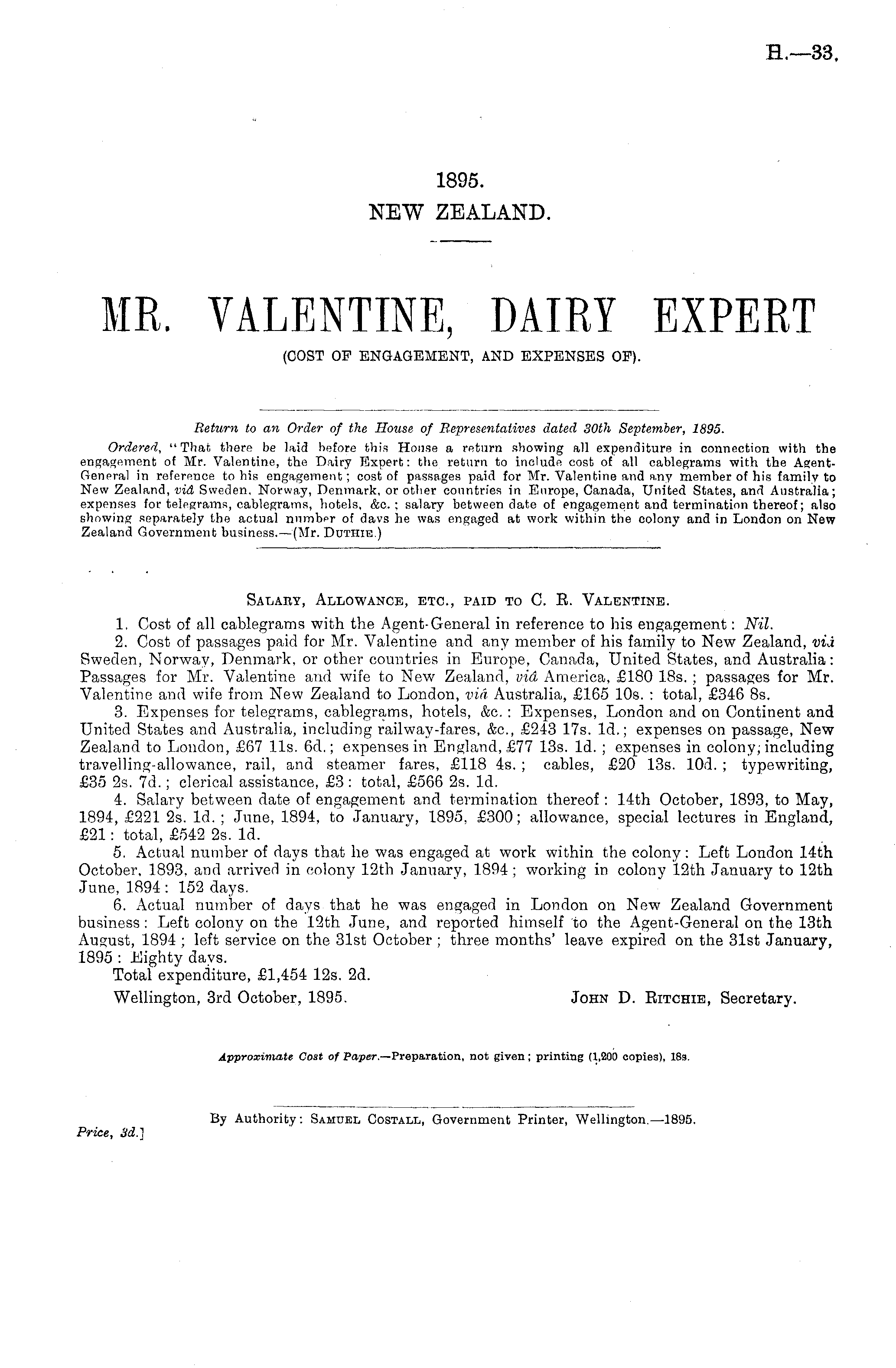 Return to an Order of the House of Representatives dated 30th September, 1895. v Ordered, " That there be laid before this House a return showing all expenditure in connection with the engagement of Mr. Valentine, the Dairy Expert: the return to include cost of all cablegrams with the AgentOeneral in reference to his engagement; cost of passages paid for Mr. Valentine and any member of his family to New Zealand, vid Sweden, Norway, Denmark, or other countries in Europe, Canada, United States, and Australia; expenses for telegrams, cablegrams, hotels, &c. ; salary between date of engagement and termination thereof; also showing separately the actual number of days he was engaged at work within the colony and in London on New Zealand Government business.—(Mr. Duthie.)