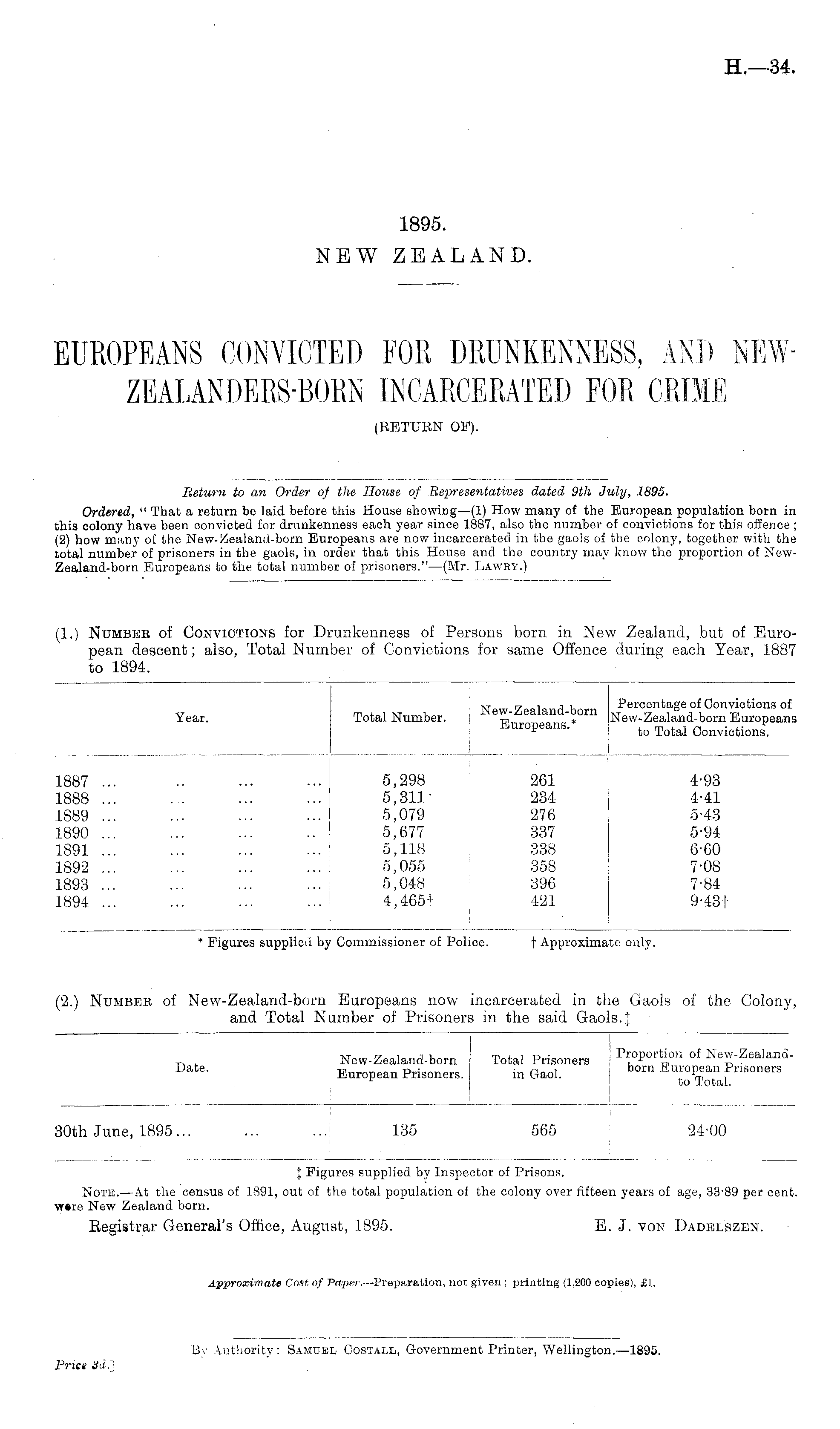 Return to an Order of the House of Representatives dated 9th July, 1895. Ordered, " That a return be laid before this House showing—(l) How many of the European population born in this colony have been convicted for drunkenness each year since 1887, also the number of convictions for this offence ; (2) how many of the New-Zealand-born Europeans are now incarcerated in the gaols of the colony, together with the total number of prisoners in the gaols, in order that this House and the country may know the proportion of New-Zealand-born Europeans to the total number of prisoners."—(Mr. Lawky.)